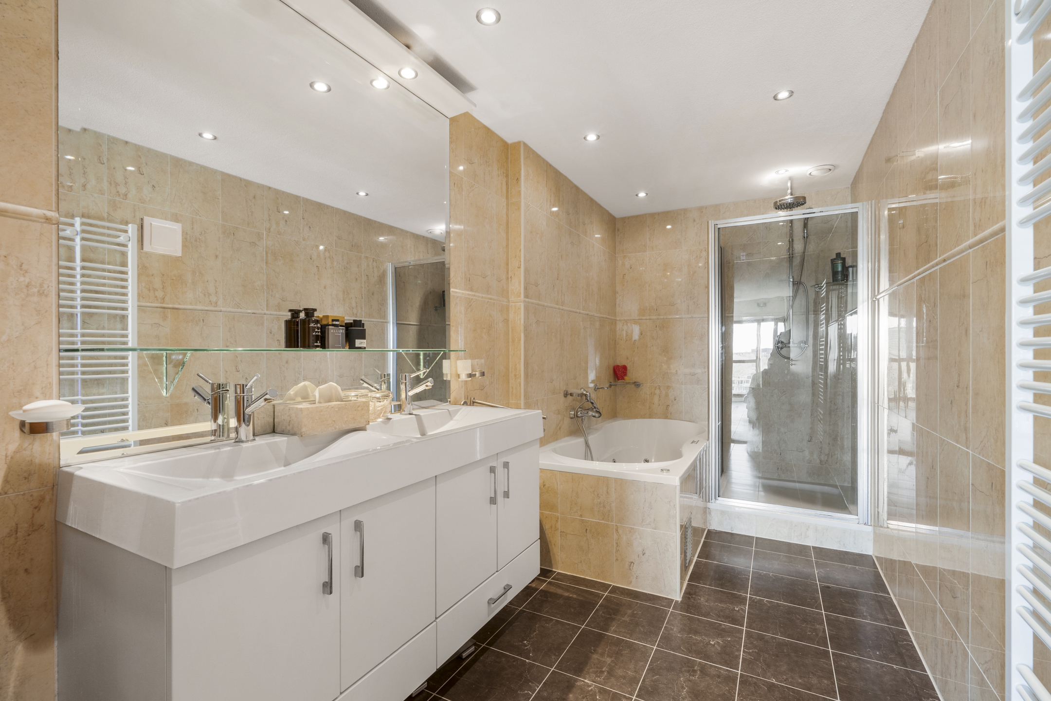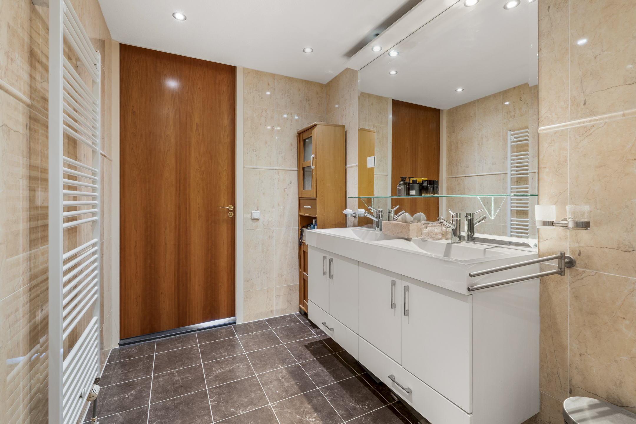 The bathroom is finished in light materials and includes a double vanity, rain shower, and whirlpool bath. Electric sun screens on the main windows provide comfort on sunny days. Residents benefit from a private storage unit, shared bicycle facility, and access to an optional parking space in the secure underground garage, available for €59,000. The building, completed in 2004, is professionally managed and includes lift access and a ground floor gym.