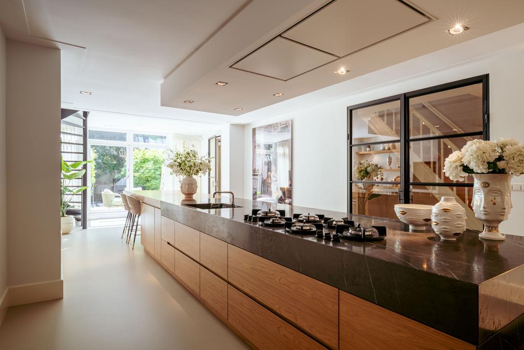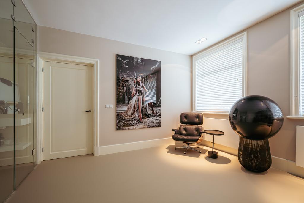 To the front is a bedroom with an en-suite bathroom featuring a washbasin and walk-in shower—currently used as a home gym, but easily repurposed. At the rear is the stunning open-plan kitchen, the centerpiece of this level. Outfitted with Gaggenau appliances, including a fridge, freezer, Quooker, five-burner gas stove integrated into the counter, oven, steam oven, dishwasher, and wine fridge, the kitchen combines luxury and functionality. A solid natural stone countertop with a wooden breakfast bar provides a warm, refined look.