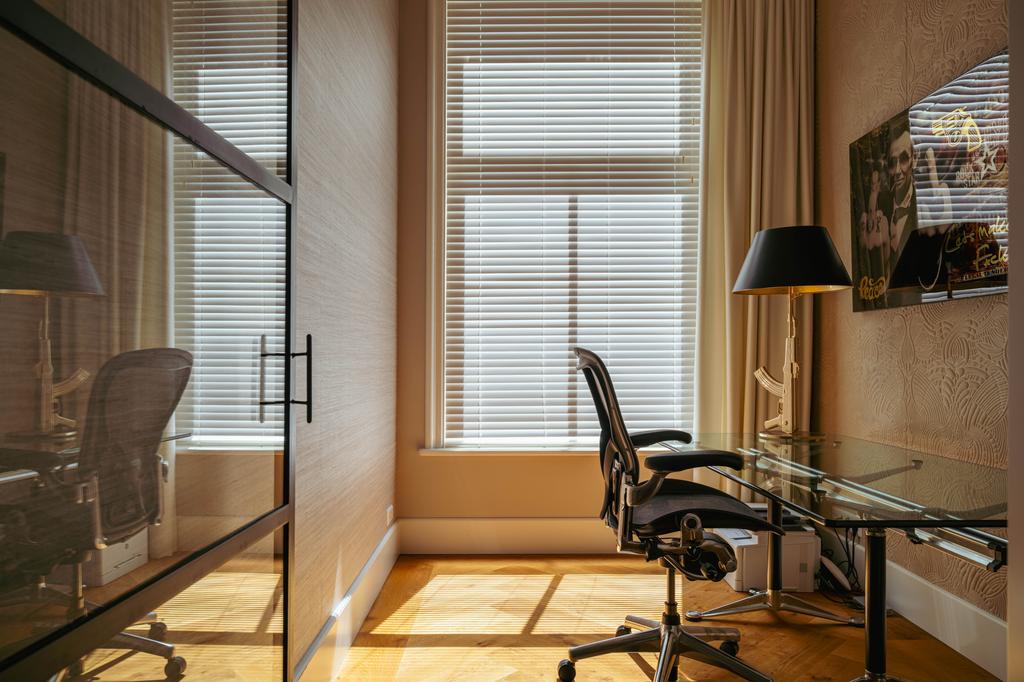 Adjacent to the dining room is a versatile room, perfect as a guest bedroom or home office. The entire floor boasts premium finishes with elegant wallpaper, enhancing its warmth and character. Large windows on both sides ensure exceptional natural light and emphasize the floor’s sense of space and luxury.