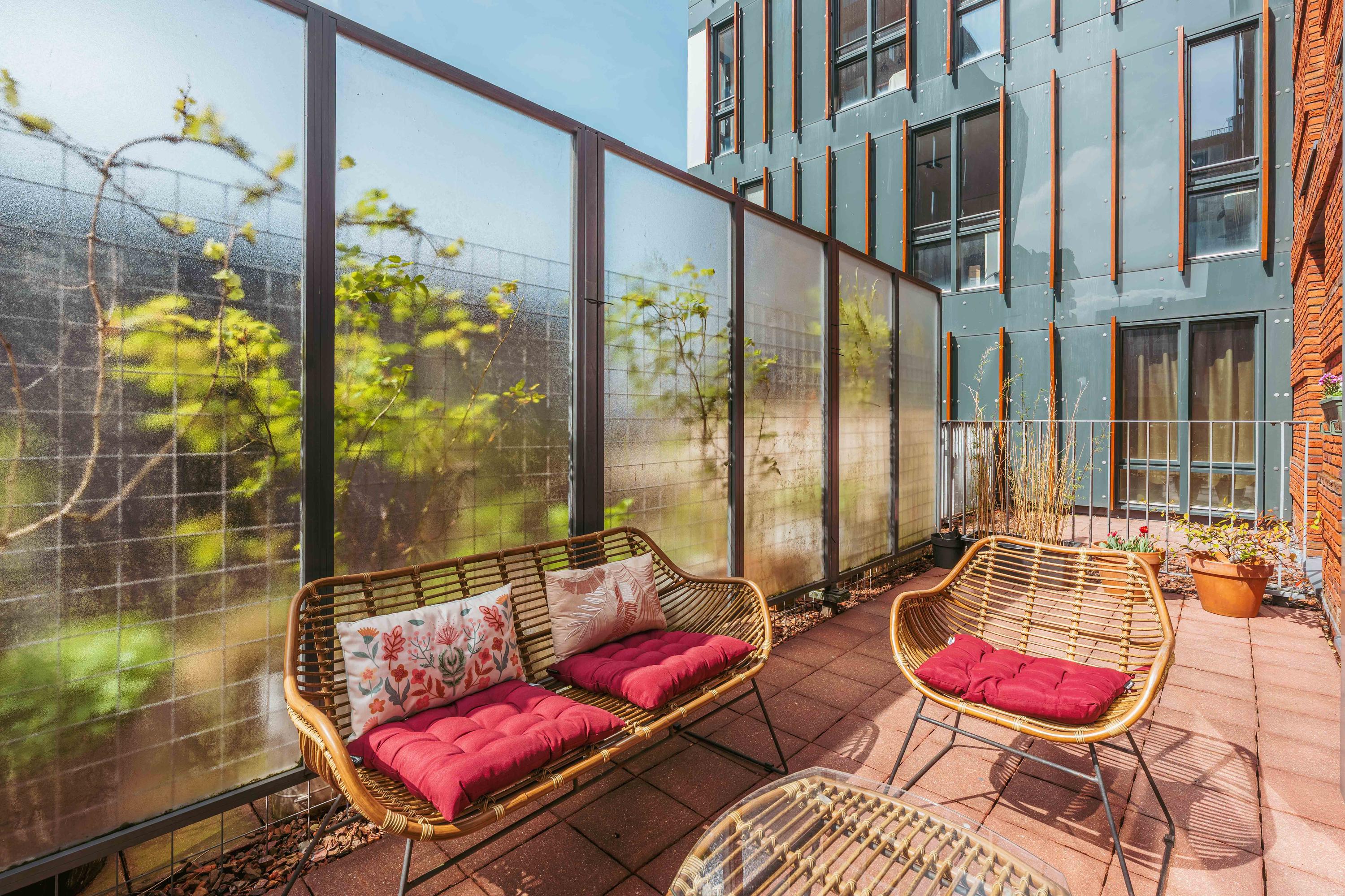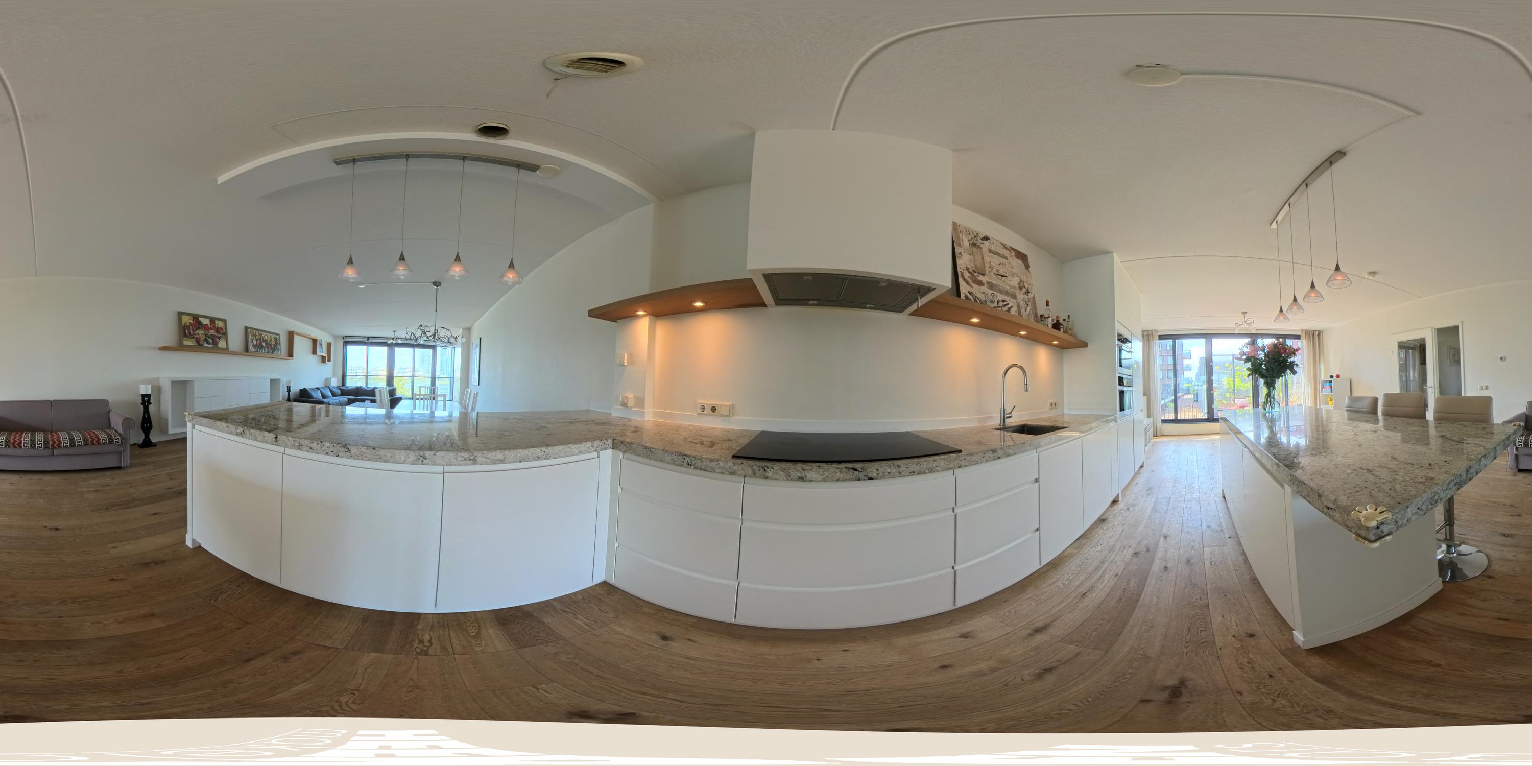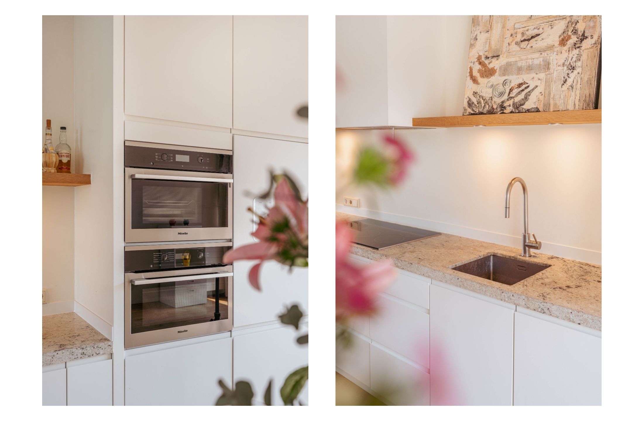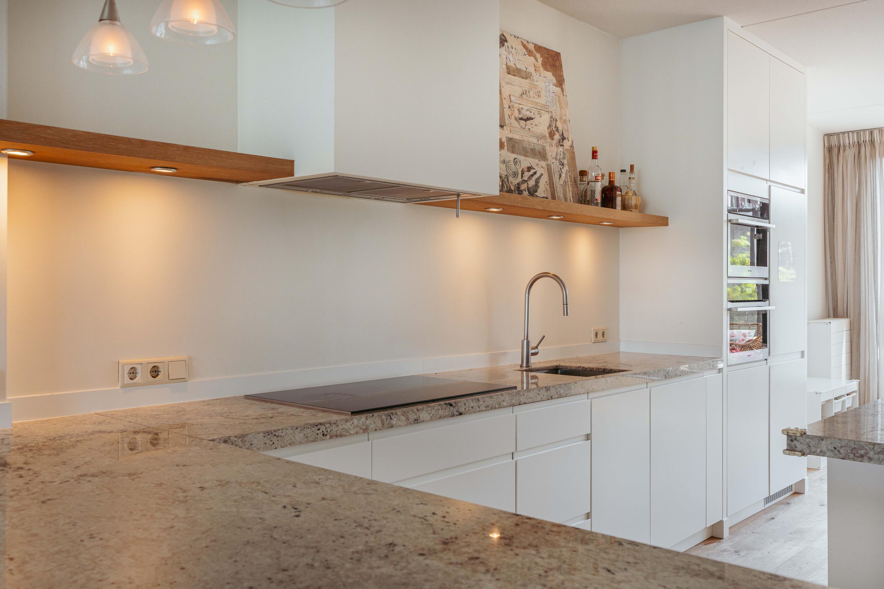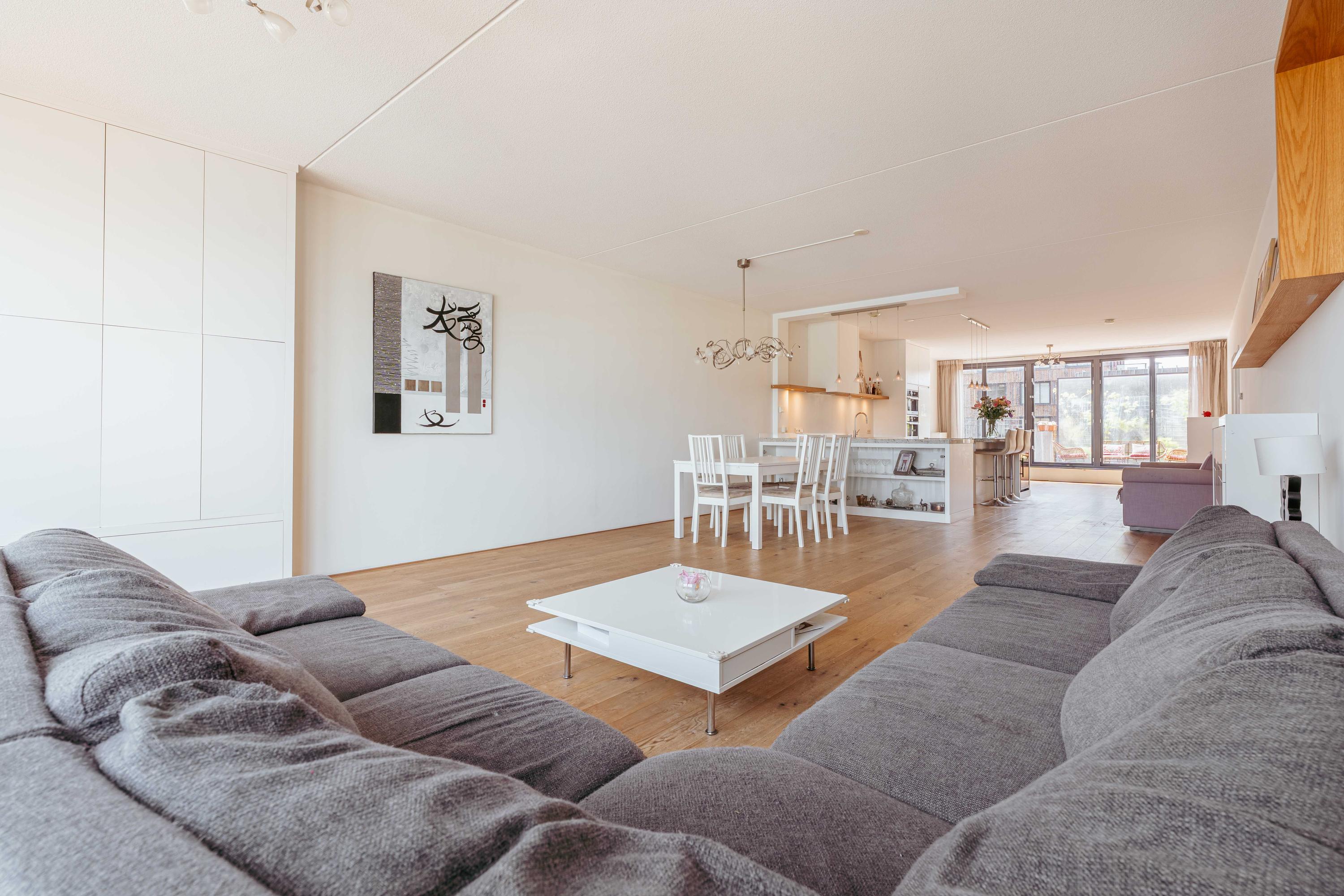 The spacious reception hall leads into a second hallway that provides access to the generous living area with open kitchen. Thanks to the full-width and floor-to-ceiling windows at the front, you'll enjoy phenomenal views over the IJ. Double doors at the rear open onto the sunny west-facing terrace of approximately 14 m² – a delightful spot to relax outdoors.