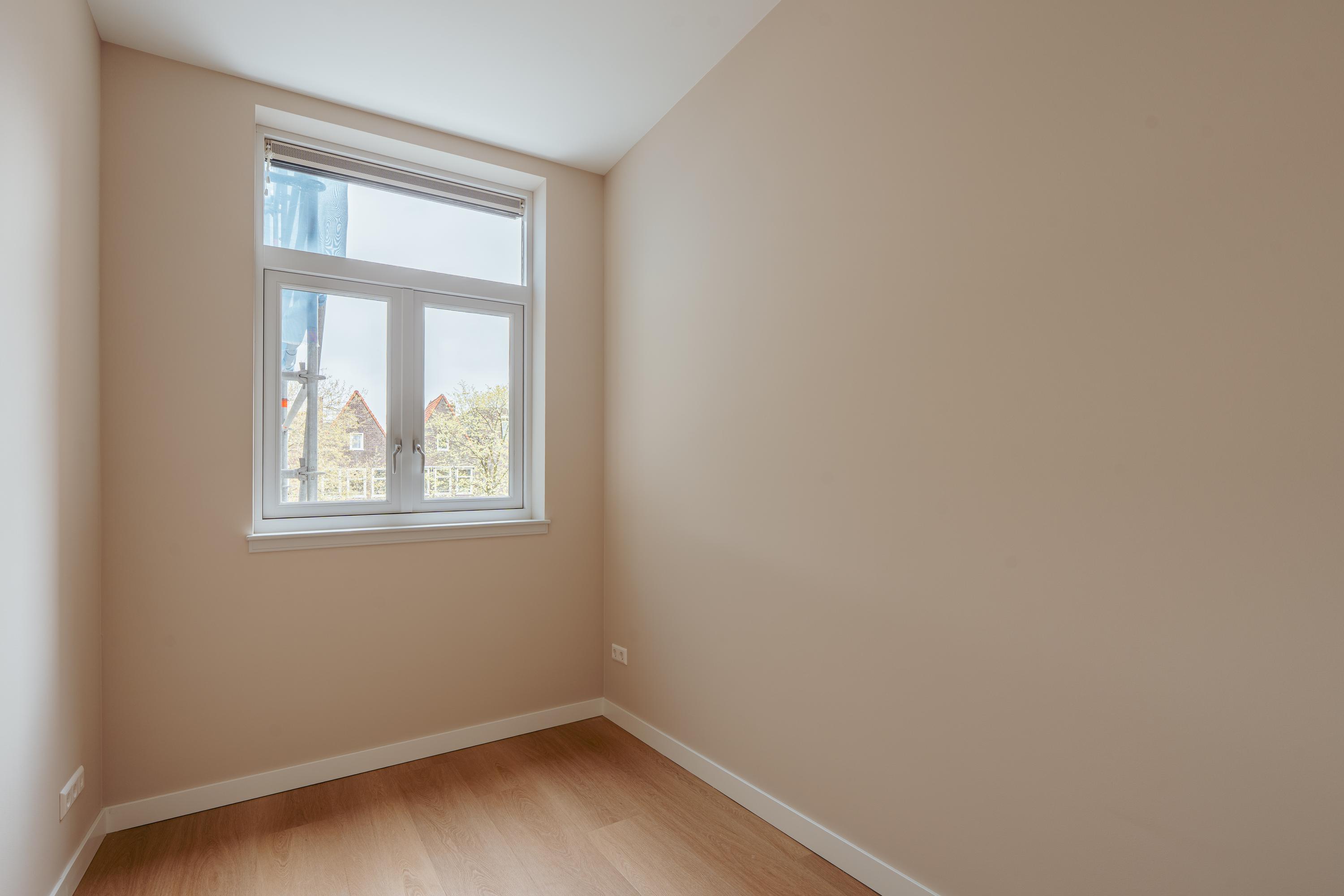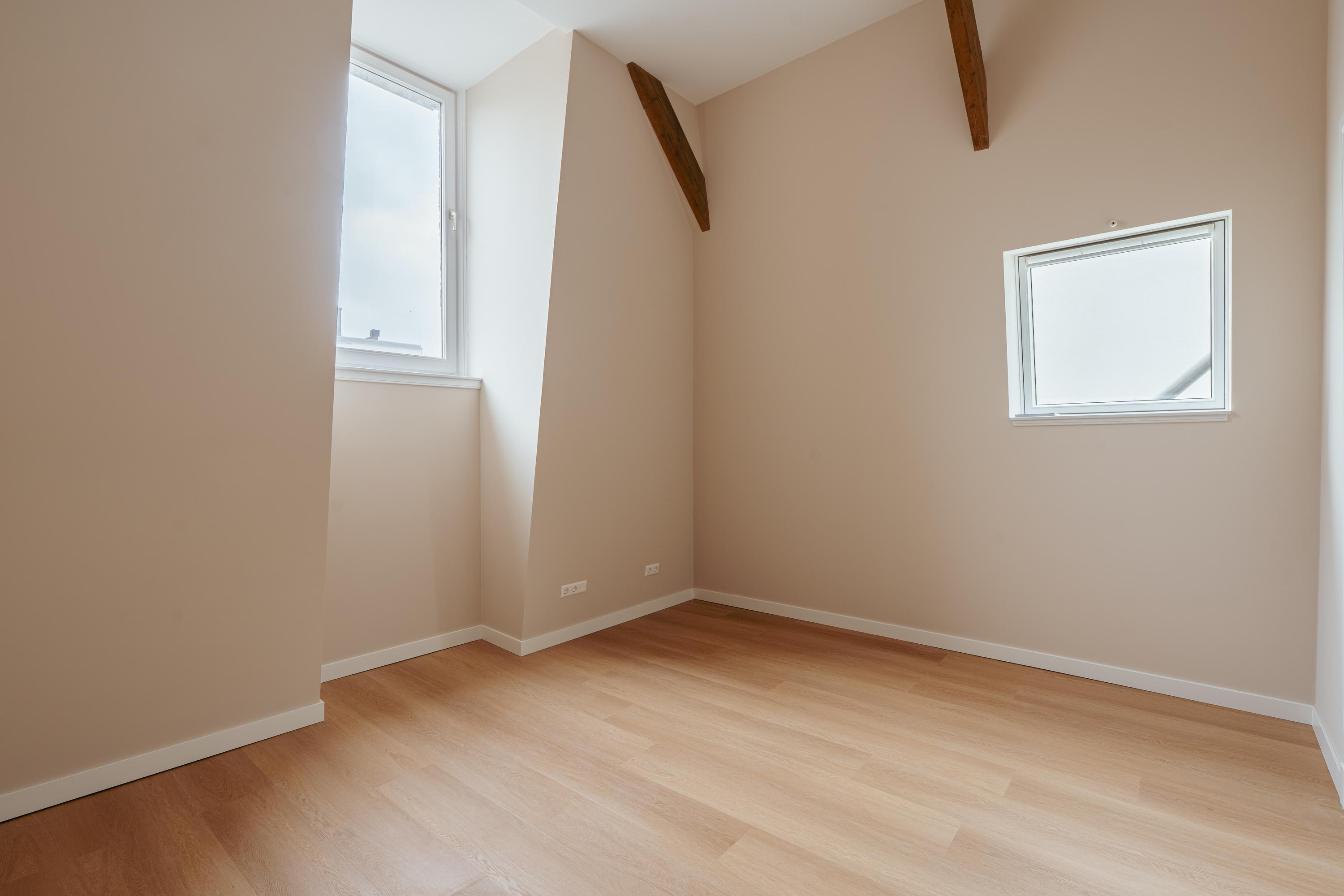Via de overloop, waar zich een separaat gastentoilet bevindt, zijn alle vertrekken op deze verdieping toegankelijk. Aan de linkerzijde bevinden zich twee goed bemeten slaapkamers. Aan de rechterzijde ligt de royale doorzonwoonkamer, die dankzij de grote raampartijen rijkelijk wordt overspoeld met daglicht. De stijlvolle open keuken is uitgevoerd in een strak en luxe design en uitgerust met alle denkbare inbouwapparatuur, waaronder een kookeiland, combi-oven, vaatwasser, koel-vriescombinatie en volop bergruimte. De originele schouw voegt een warm, authentiek accent toe aan het geheel. Via openslaande deuren heeft u toegang tot het dakterras (ca. 32 m²): een heerlijke plek om buiten te ontspannen.