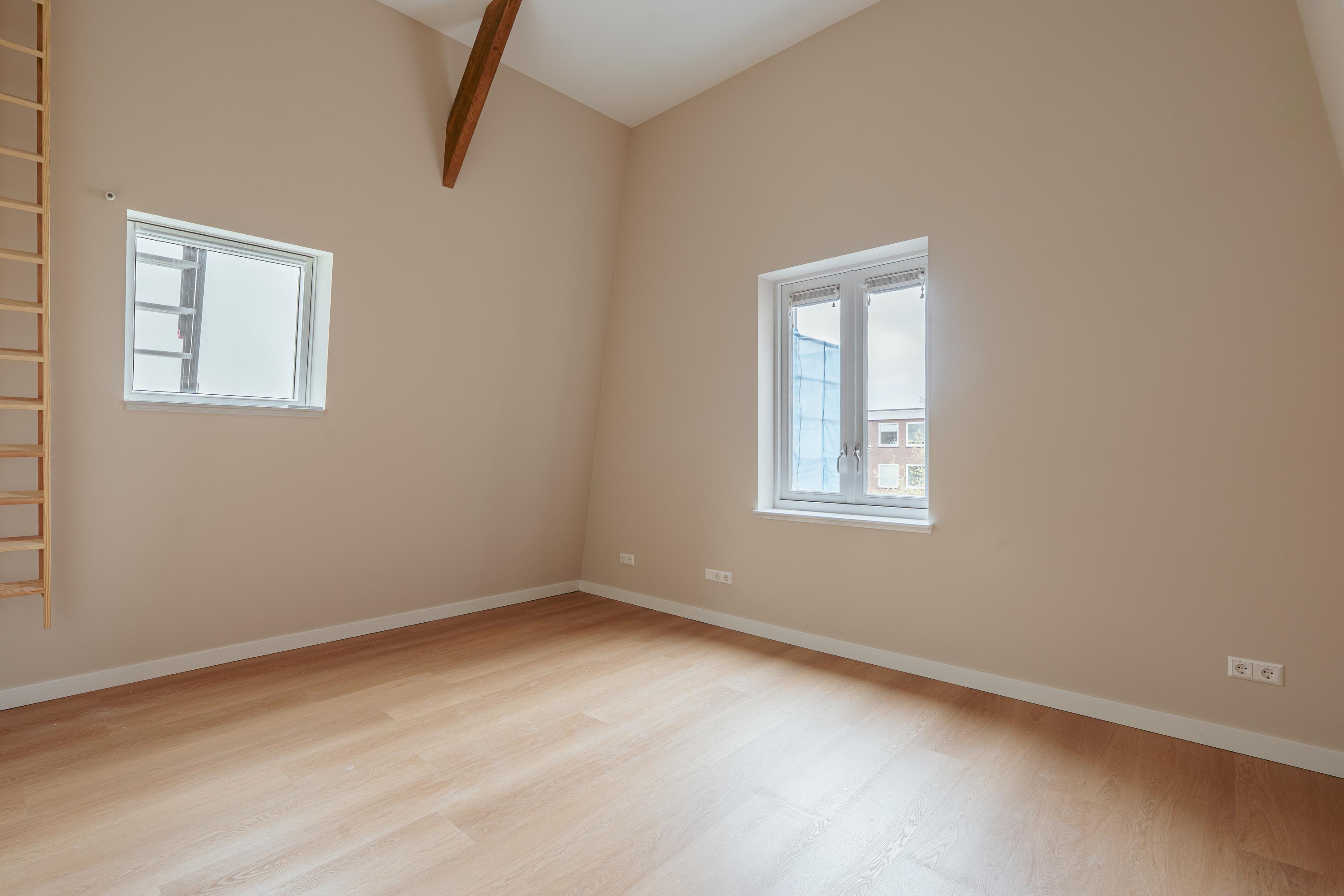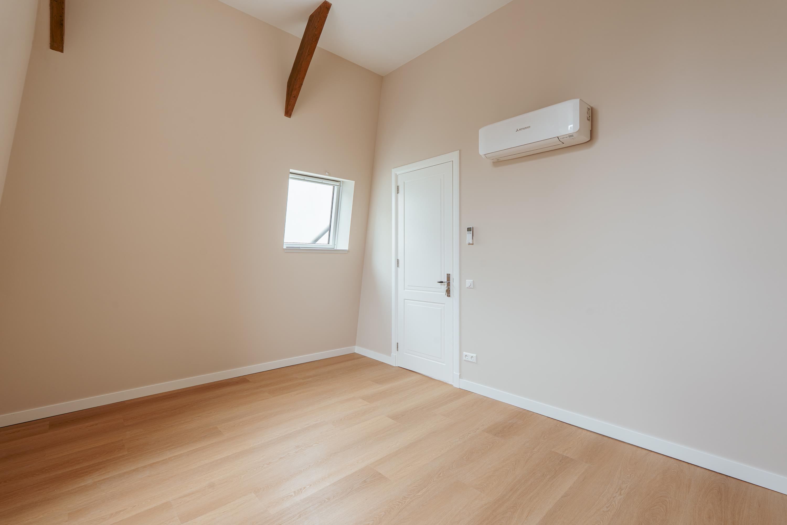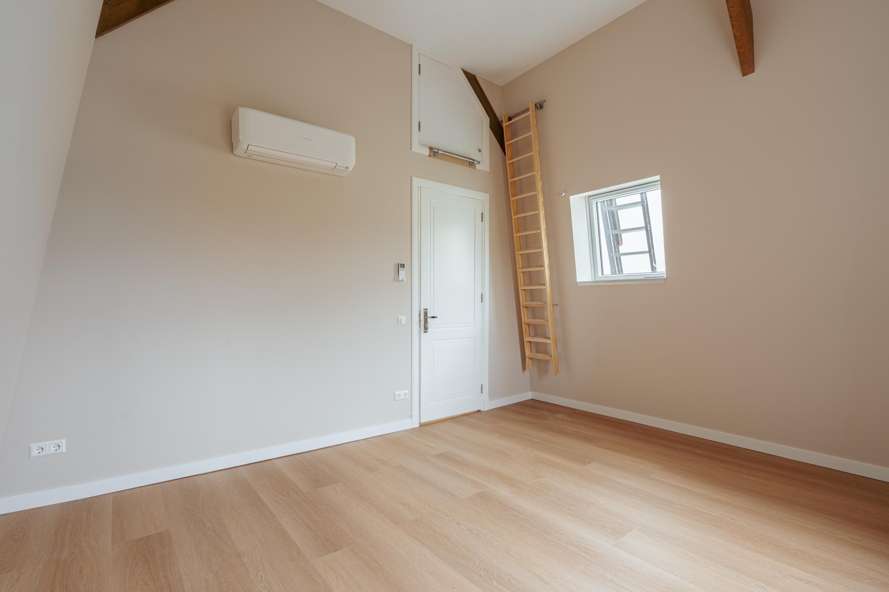 Een vaste trap leidt naar de bovenste verdieping, waar de overloop wederom is voorzien van een separaat toilet. Aan weerszijden bevinden zich twee ruim opgezette slaapkamers met airconditioning. De zichtbare houten spanten geven deze ruimtes extra charme en karakter, mede dankzij de indrukwekkende plafondhoogte van maar liefst 3,70 meter. Vanuit één van de slaapkamers is de vlieringzolder bereikbaar, met een extra bergruimte van ca. 12 m².