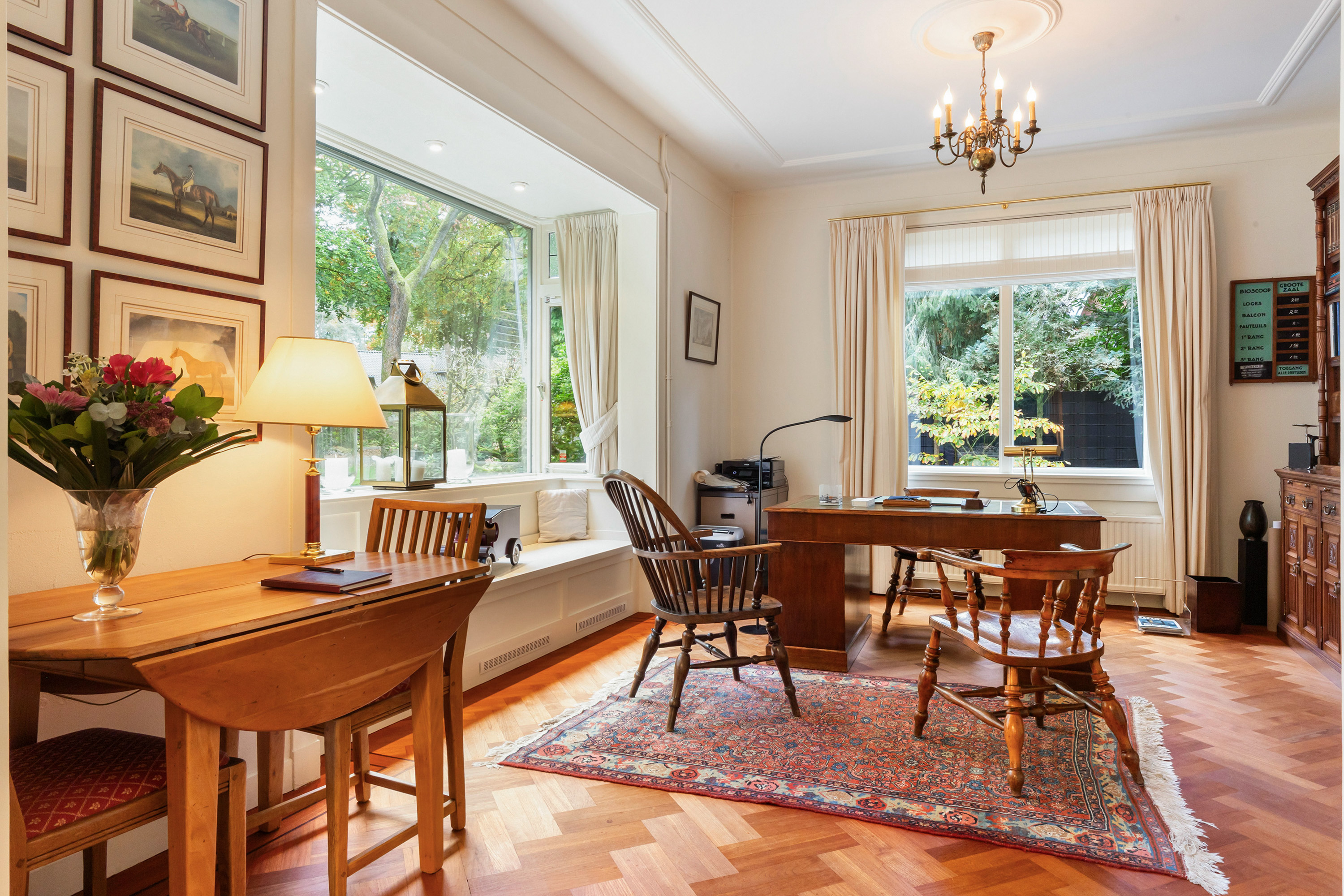 The study at the front of the house has a herringbone parquet floor with a double border and inlay, and offers views of the front garden and spacious drive. In the bay window, a bespoke bench with convector heating has been integrated, while sun blinds at the front enhance comfort. The windows give this room a warm, classic character.