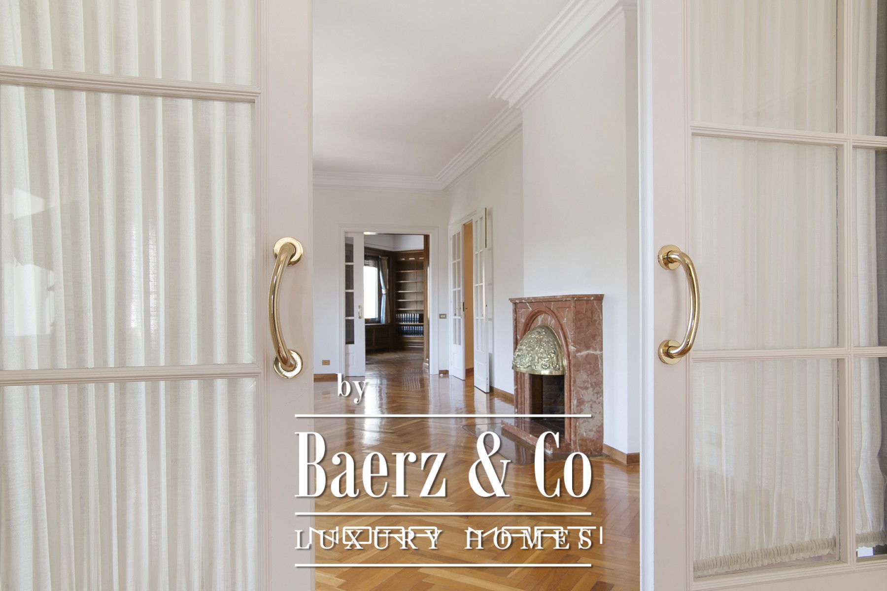 Split air conditioning and a classic architectural layout maintain a comfortable, airy atmosphere, with light entering on three sides of the apartment. Dedicated service areas include a double bedroom and full bathroom, with a spacious utility gallery linked to the luminous interior patio. Two private storage rooms and two parking spaces are included, with the option for a third parking space. Lifts serve both the main and service entrances.