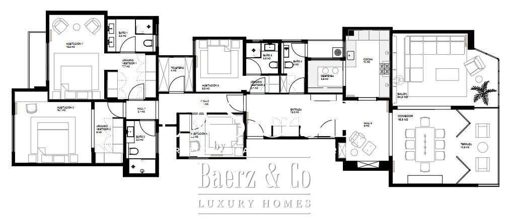 The expansive living room connects directly to a 10 m² terrace that overlooks Aribau street, benefiting from afternoon sun and a sense of lively urban rhythm. Four bathrooms, including two en suite, are paired with built-in storage, natural gas heating, and air conditioning for year-round comfort.