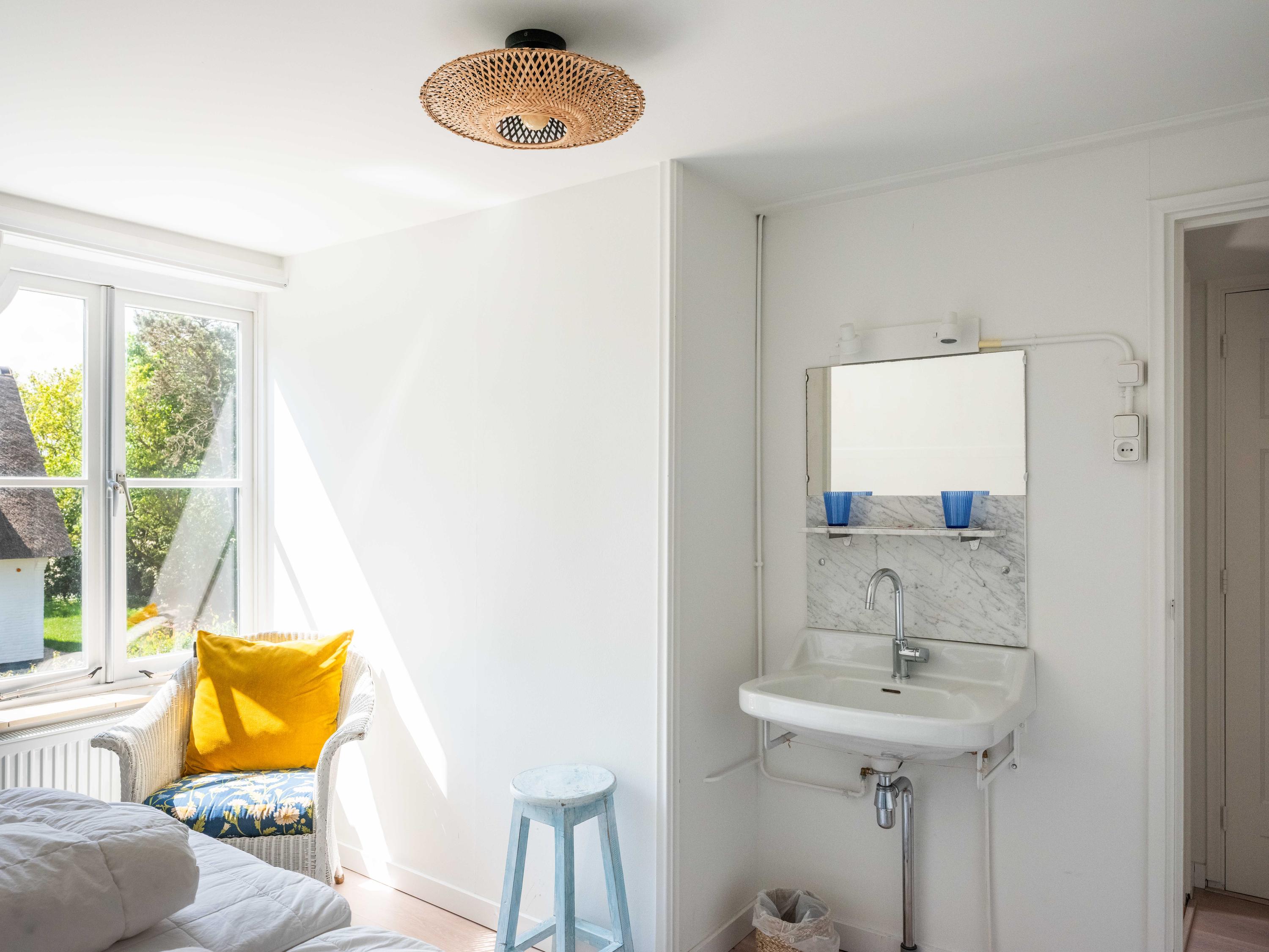 The first floor has three bedrooms, each with a washbasin and built-in wardrobe. Thanks to several dormer windows, there is plenty of light and space. There is a separate central heating cupboard and a second bathroom with a bath, shower, toilet, skylight and mechanical ventilation. From the landing, a small dormer window offers a view of the coast.
