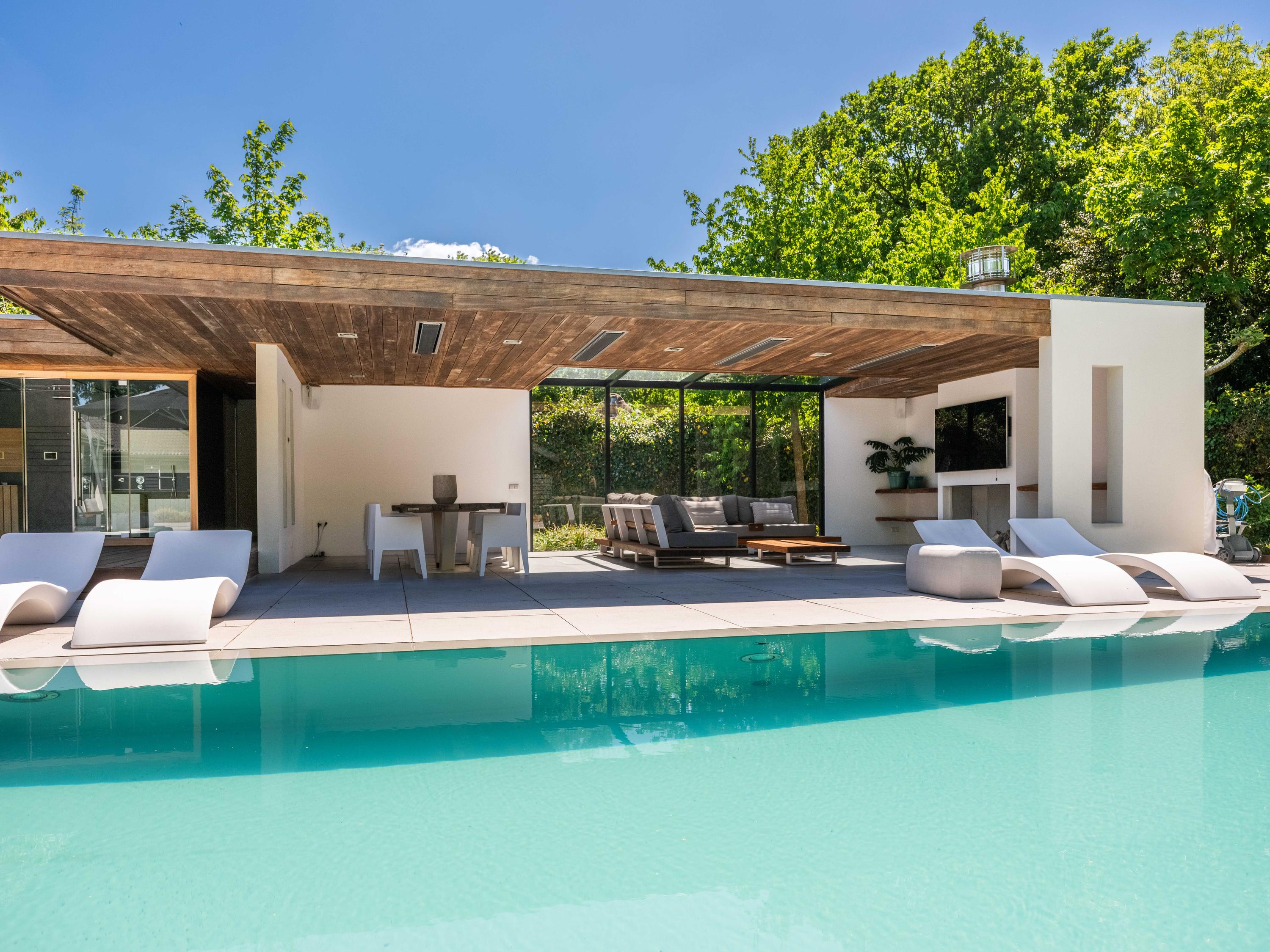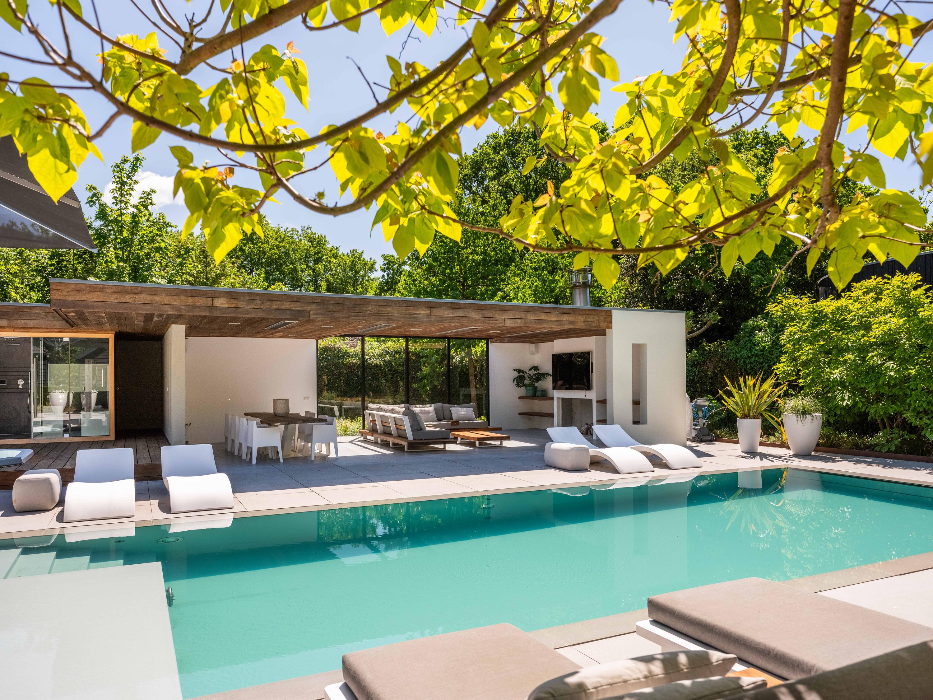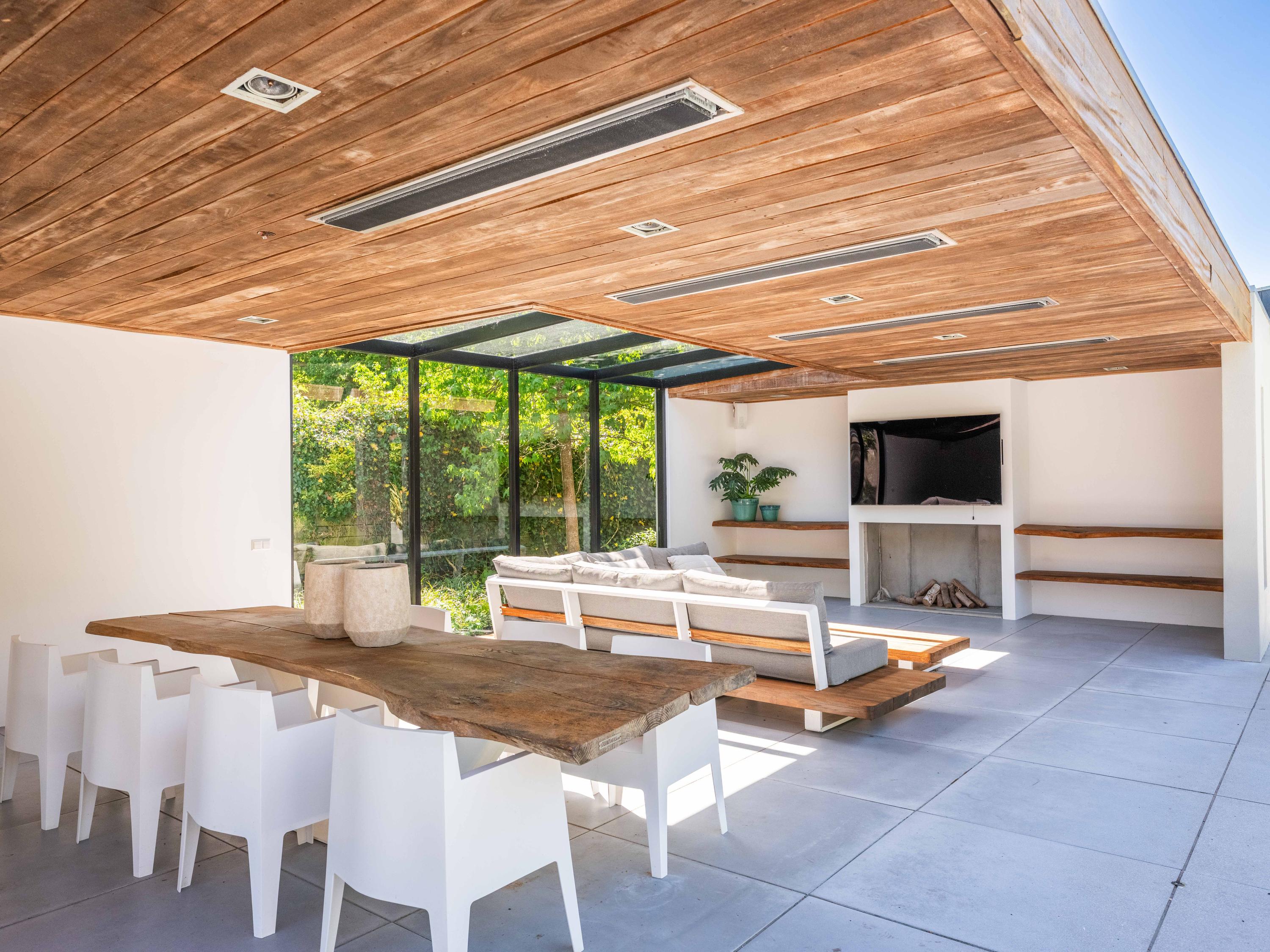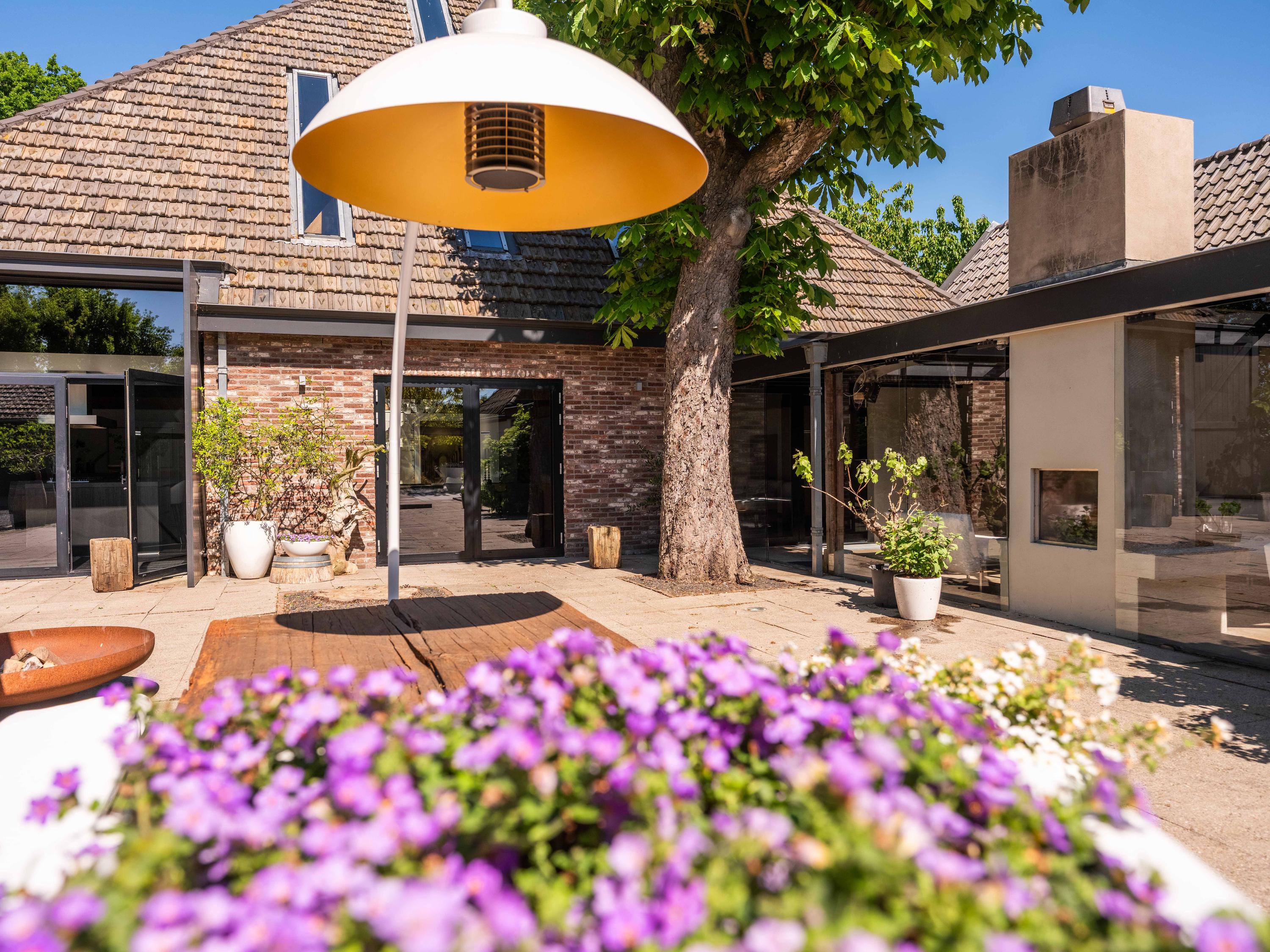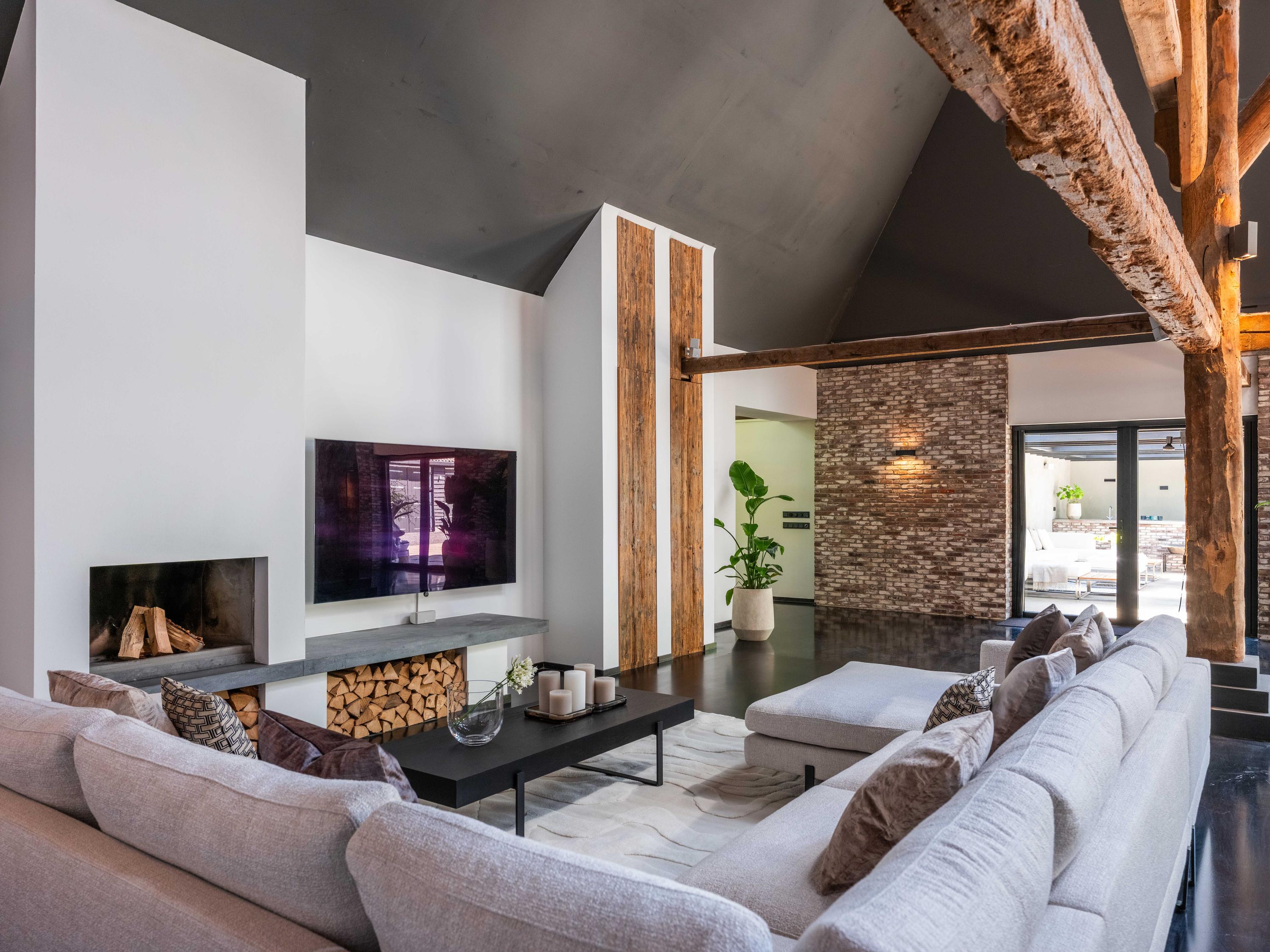 The living room where the ceiling, which reaches to the ridge, immediately catches the eye. The contrast of colours in the house enhance its sturdy character. This very spacious living room has a fireplace and French doors to the garden. The modern open kitchen is equipped with various built-in appliances, including a Boretti 8-burner cooker, an American fridge with coffee maker and plate warmer, oven, built-in fridge and dishwasher.