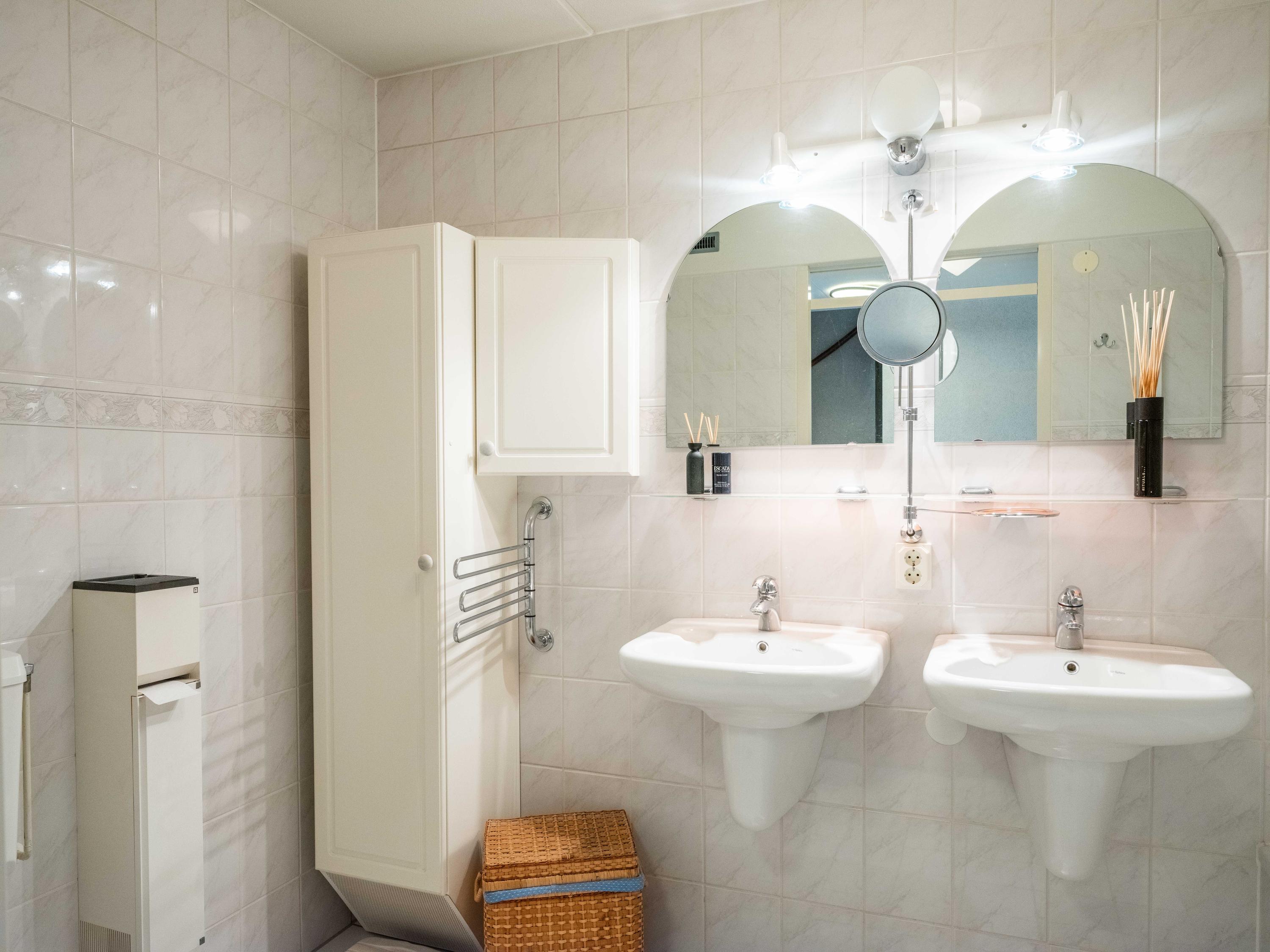 On the ground floor, you will also find a spacious room on the garden side, which can be used as an office, but is also ideal as a bedroom. The bathroom on the ground floor has a bathtub with shower, double sink, and toilet.