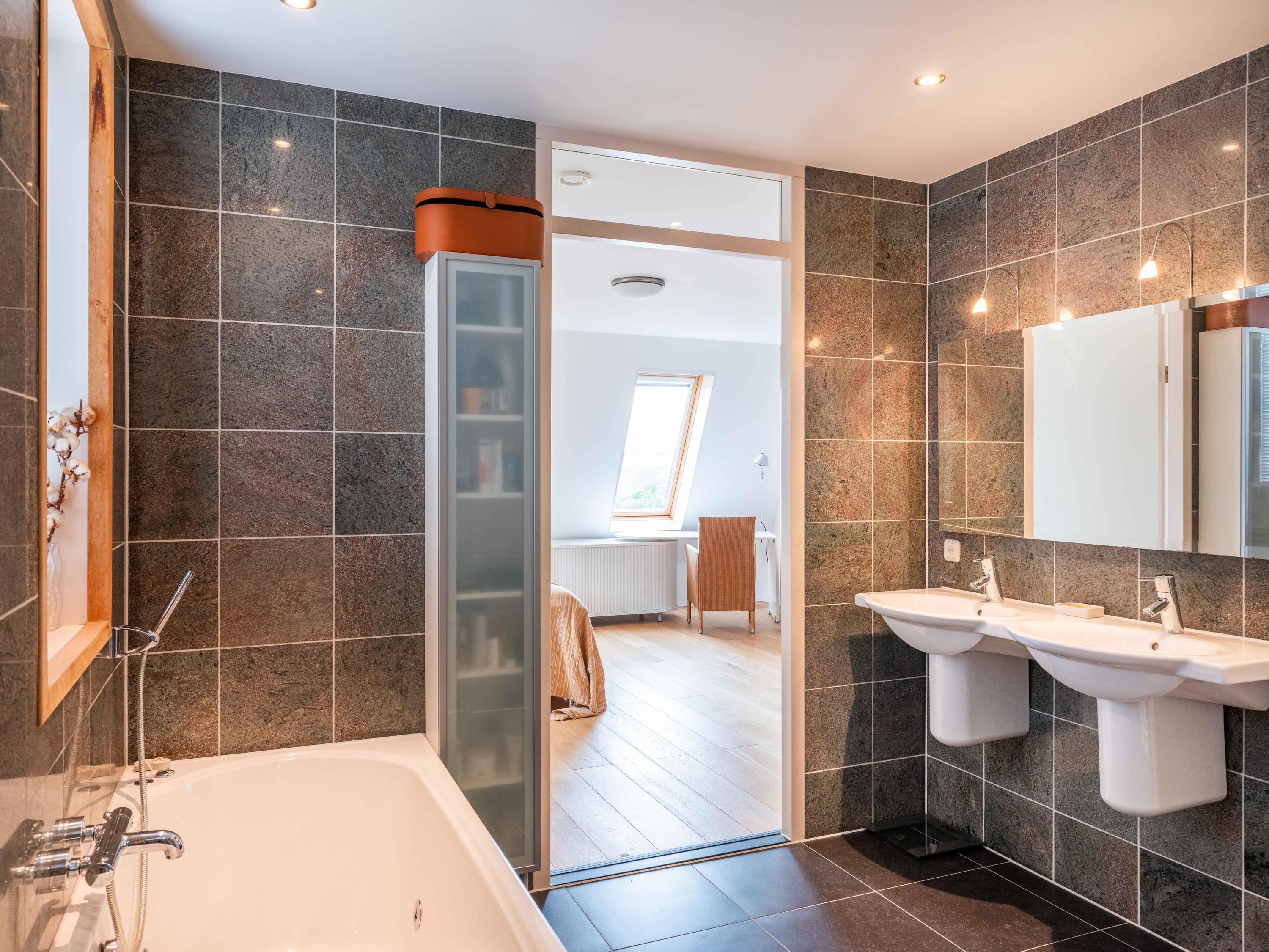 The staircase leads to the first floor, where you will find two spacious bedrooms, both with closet space, and the second bathroom. This luxurious bathroom is equipped with a bathtub, double sink and a walk-in shower. From the rear bedroom, access to the private south-facing balcony.