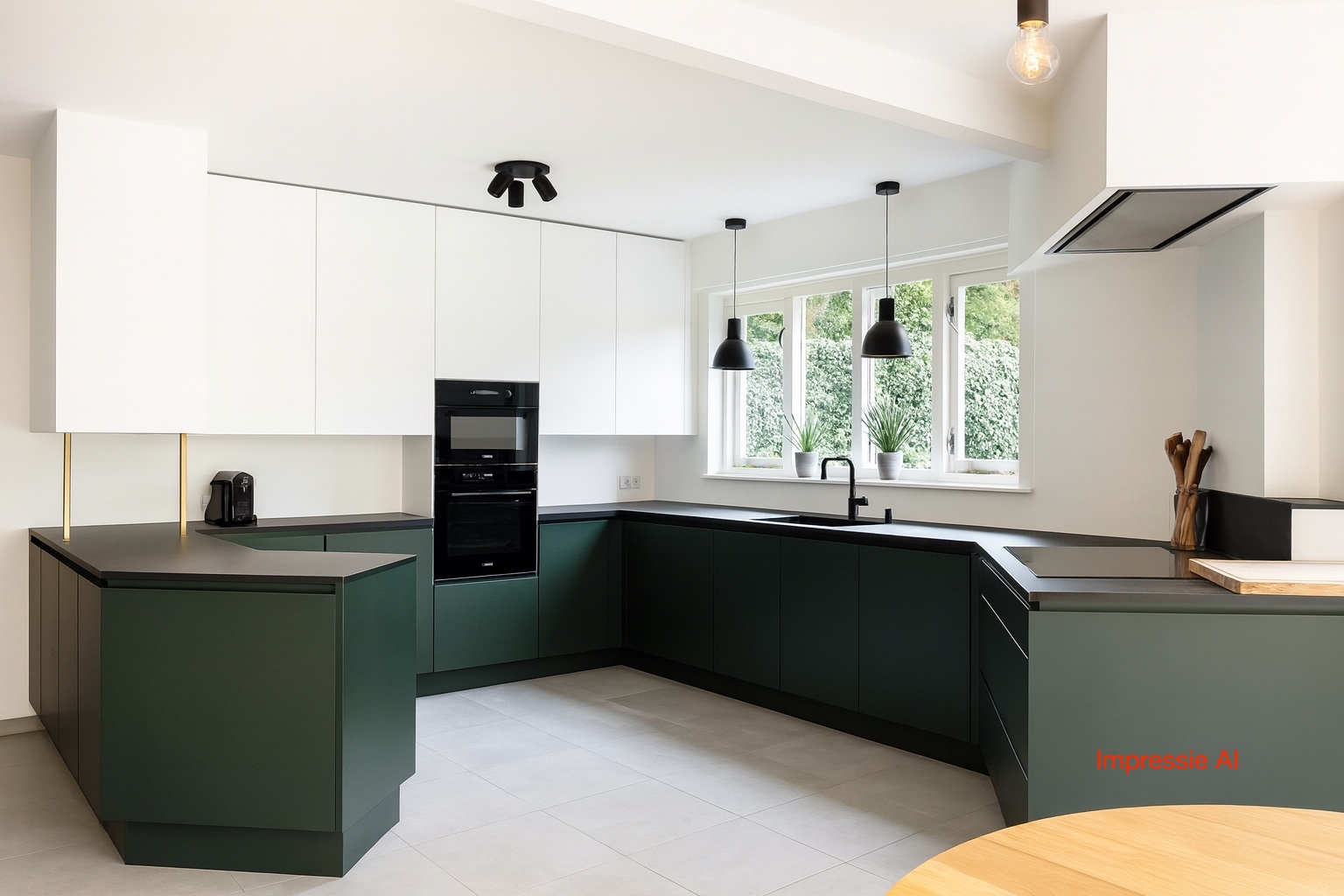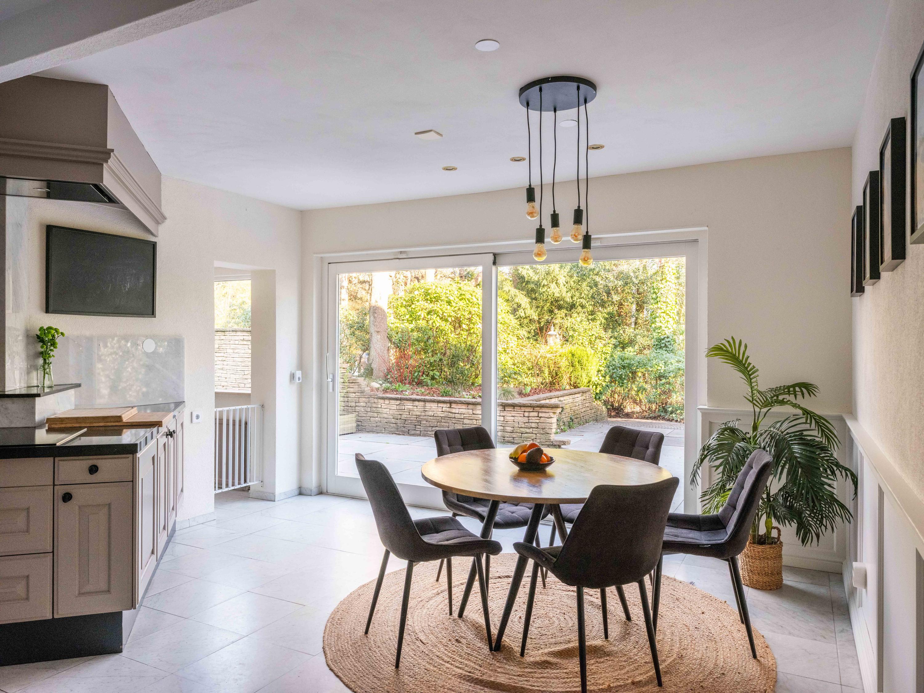 From the hall we enter the spacious kitchen, which is equipped with all kinds of appliances, such as a five-burner induction hob, quooker, steamer, two combi ovens etc. The cooking enthusiast can have a great time here.