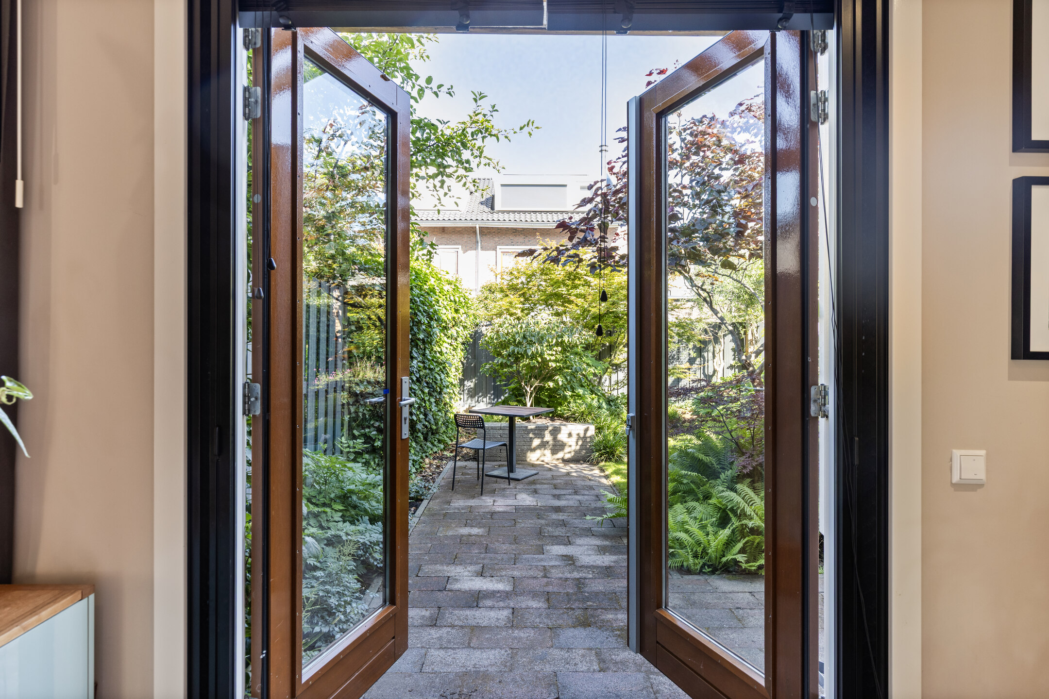 The bright, garden-facing living room features a practical storage cupboard under the stairs and French doors opening onto the backyard.