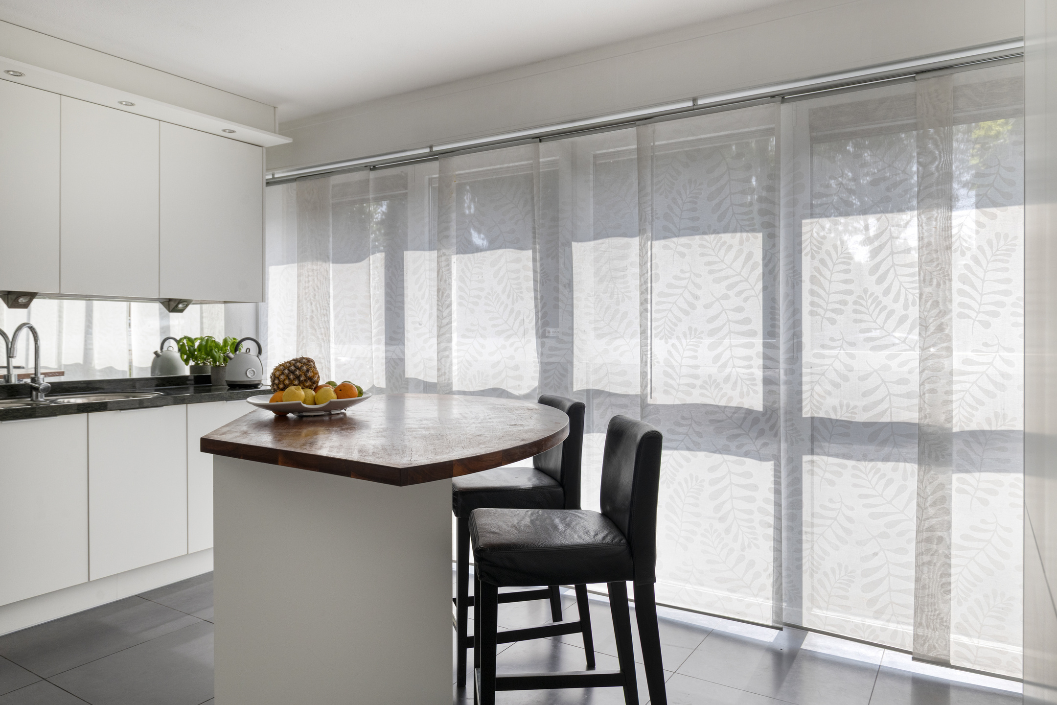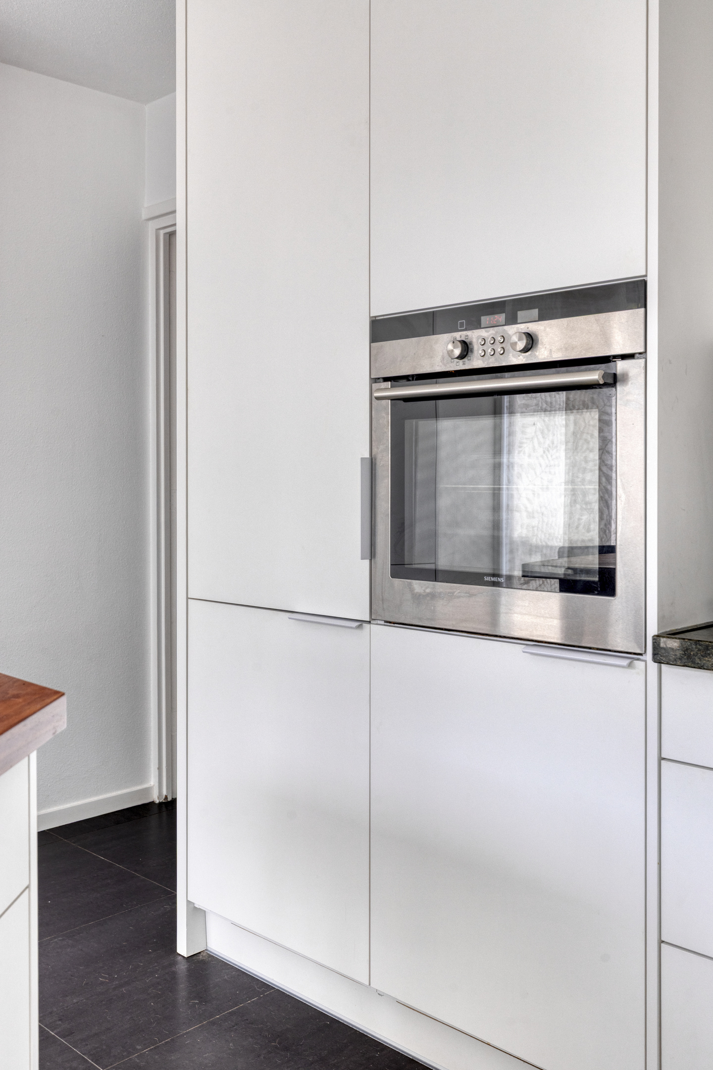 The recently renovated L-shaped kitchen is fully equipped with built-in appliances, including a dishwasher, induction hob, extractor hood, double sink with mixer tap, oven, and fridge-freezer combination. A window screen has also been installed.