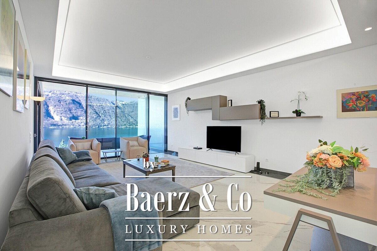Offering 140 m² of bright, modern space, the apartment features two bedrooms and two bathrooms, each with direct lake views and elegant en suite facilities. Abundant daylight fills the interiors, where floor to ceiling windows frame the scenery. The private terrace extends the living area outdoors and is ideally suited for breakfast with morning light or quiet evenings as the sun drifts over the water.