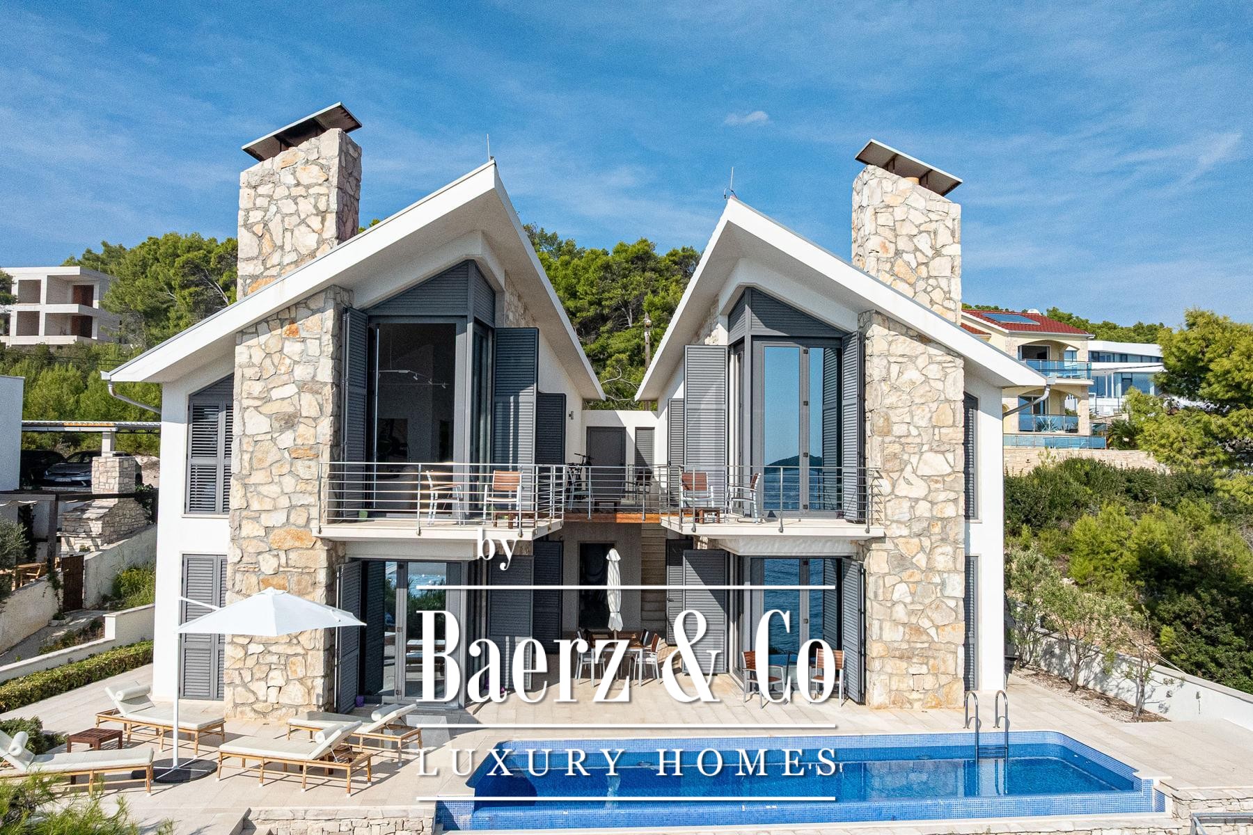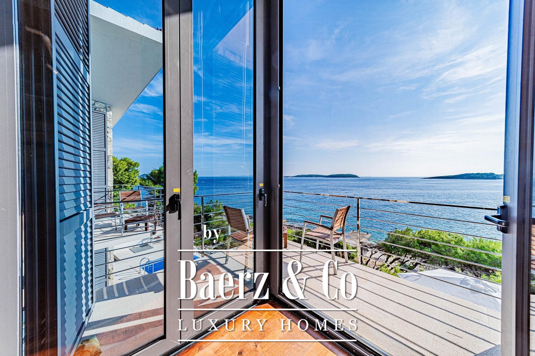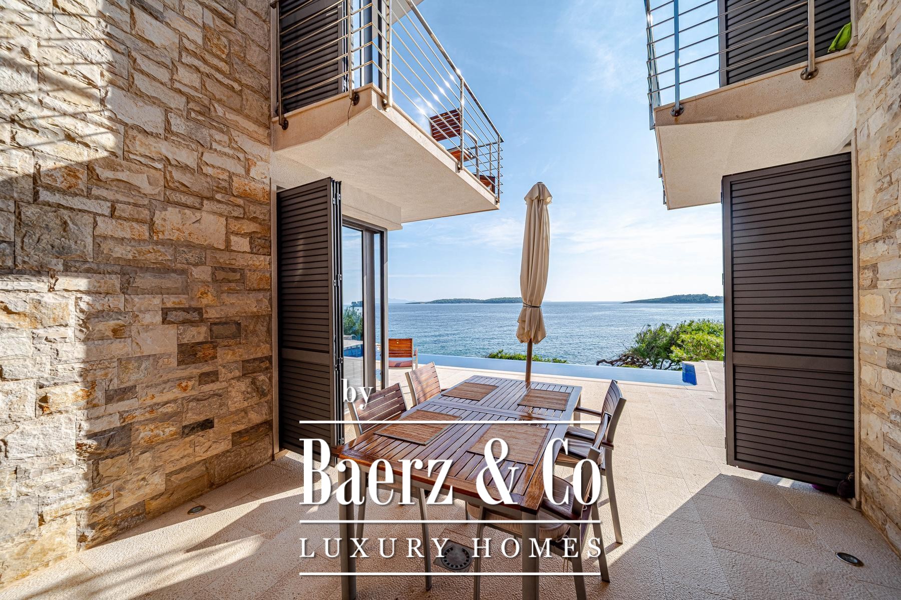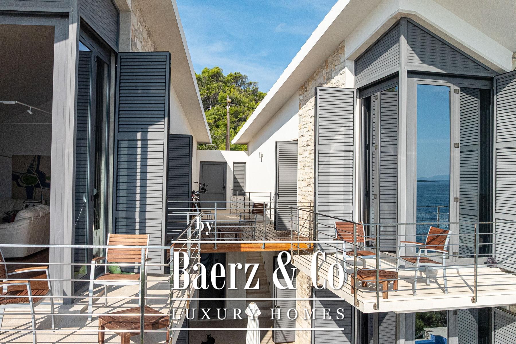 This villa Blato is set directly on the seashore in Croatia, presenting 260 m² of interior living across a 500 m² plot. Architectural clarity defines the residence, composed of two independent units linked by broad terraces, each functioning as a self-contained home. The main floor of both units offers combined living, dining, and kitchen spaces, while upstairs, each provides two bedrooms, all with en suite bathrooms and private terraces.