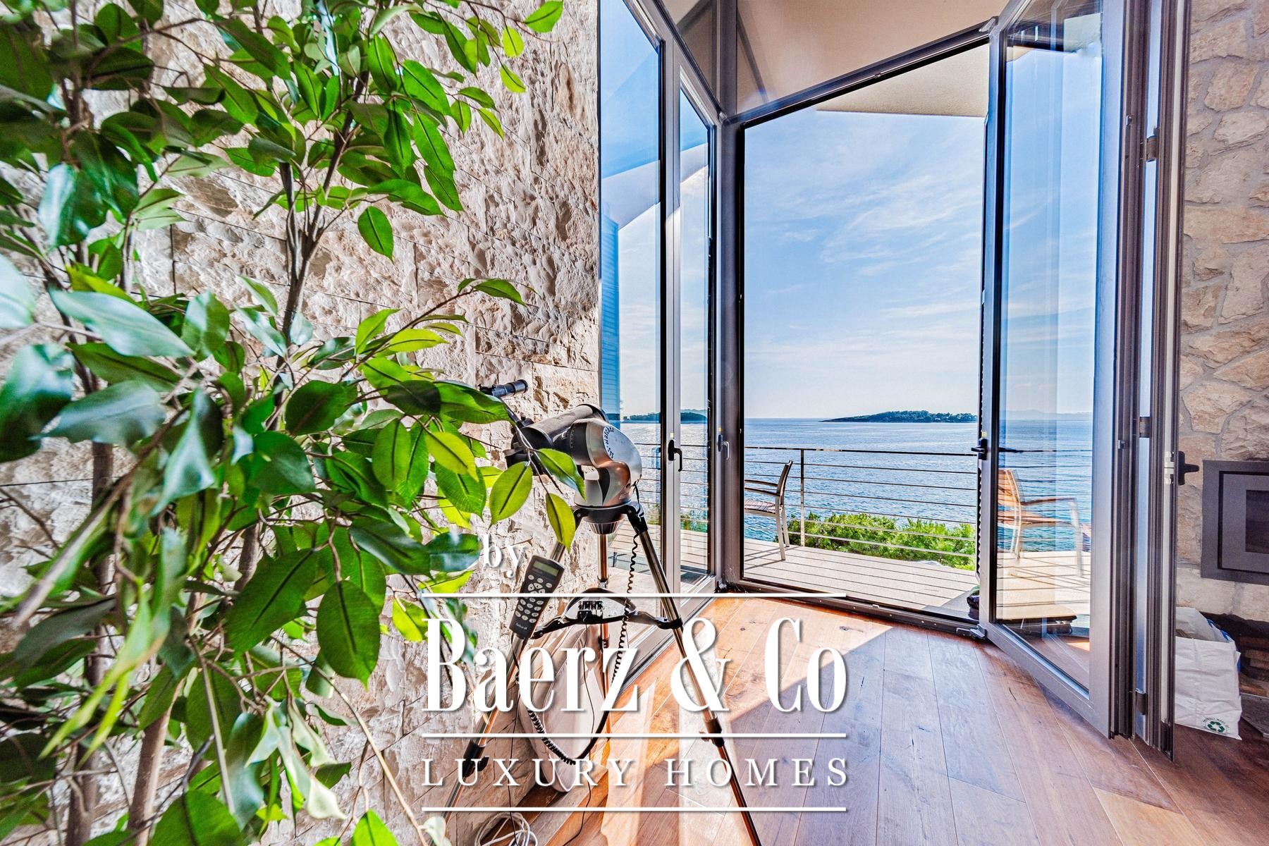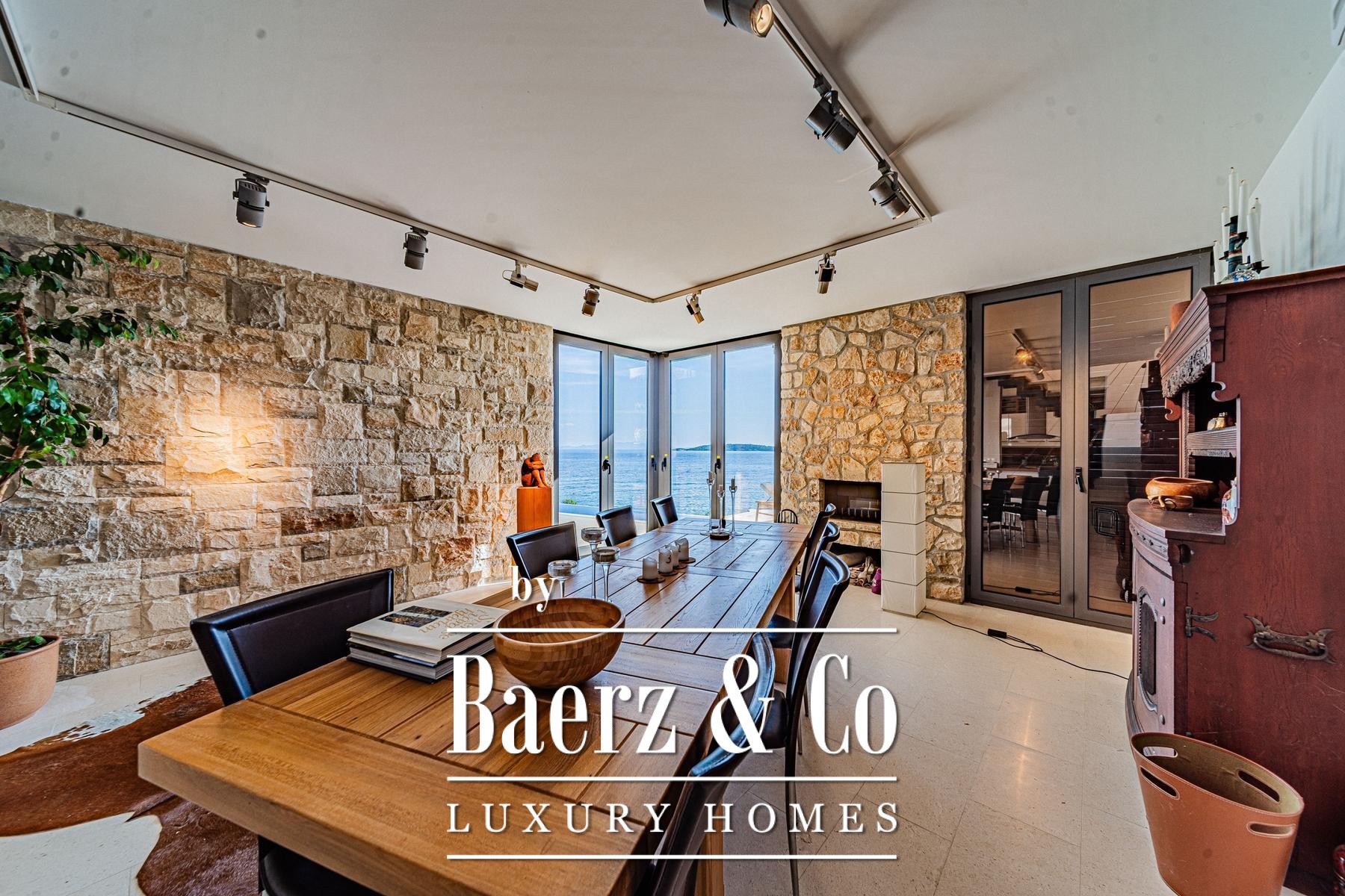 The landscape in front of the villa features pale stone paving, a swimming pool and dedicated areas for sunbathing, all designed to encourage easeful living by the sea. A pedestrian path brings you just 15 metres to the water, where a small pier allows for boat mooring and private retreat. Throughout, the materials and interior finishes display thoughtful attention to detail, imparting a sense of understated exclusivity.