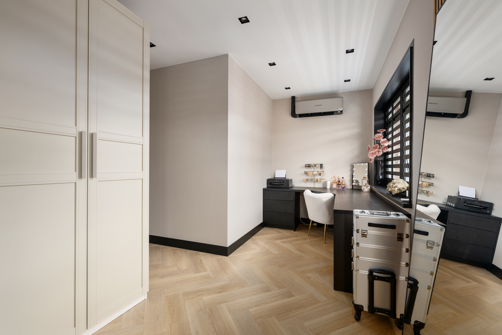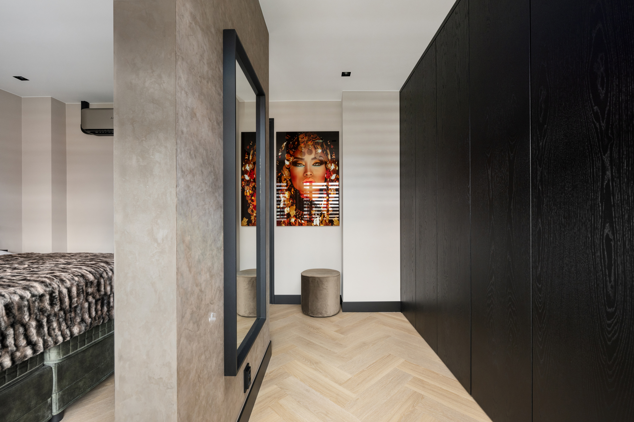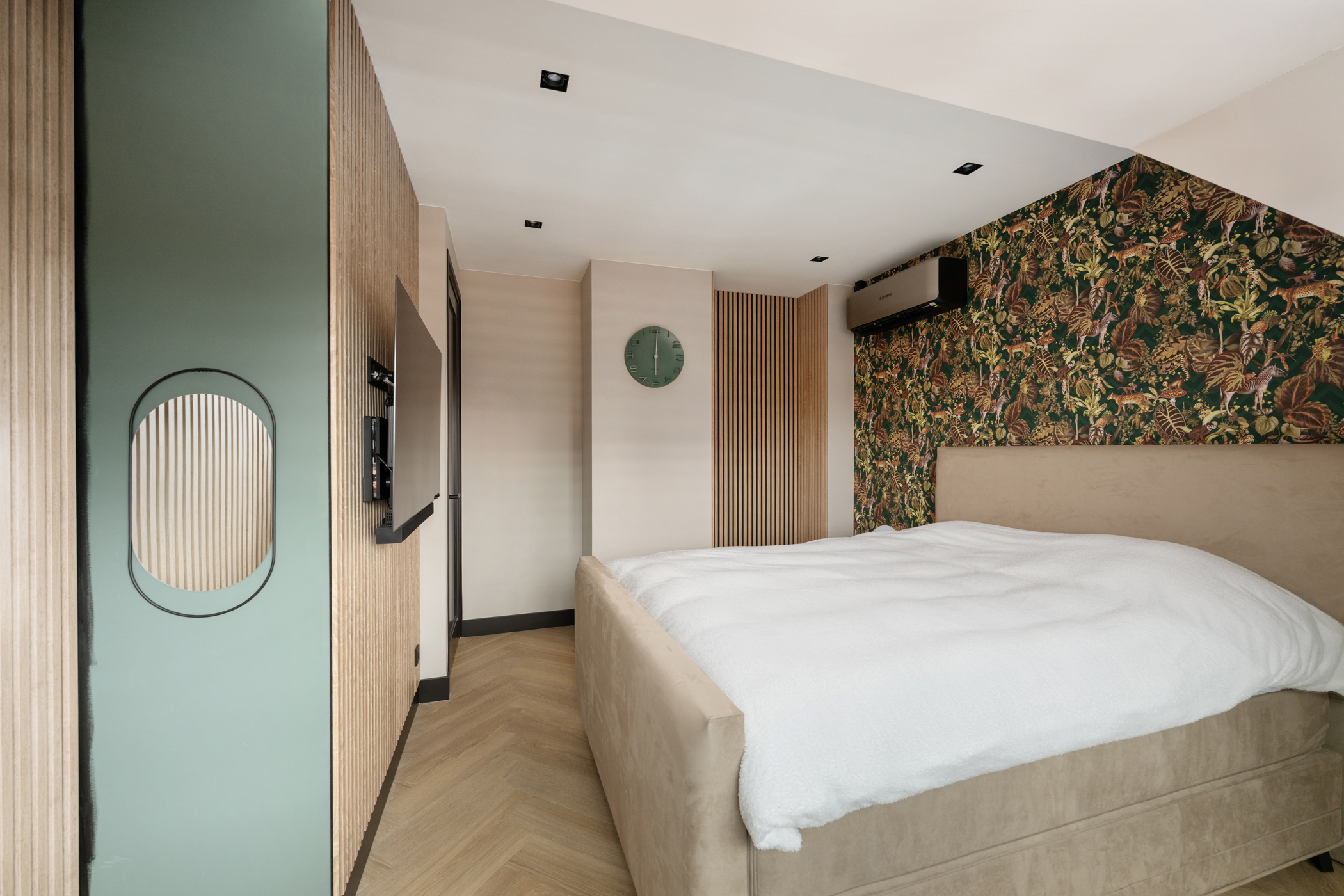 At the front you will find the third bedroom, equipped with air conditioning and built-in wardrobes hidden behind a stylish slatted wall.