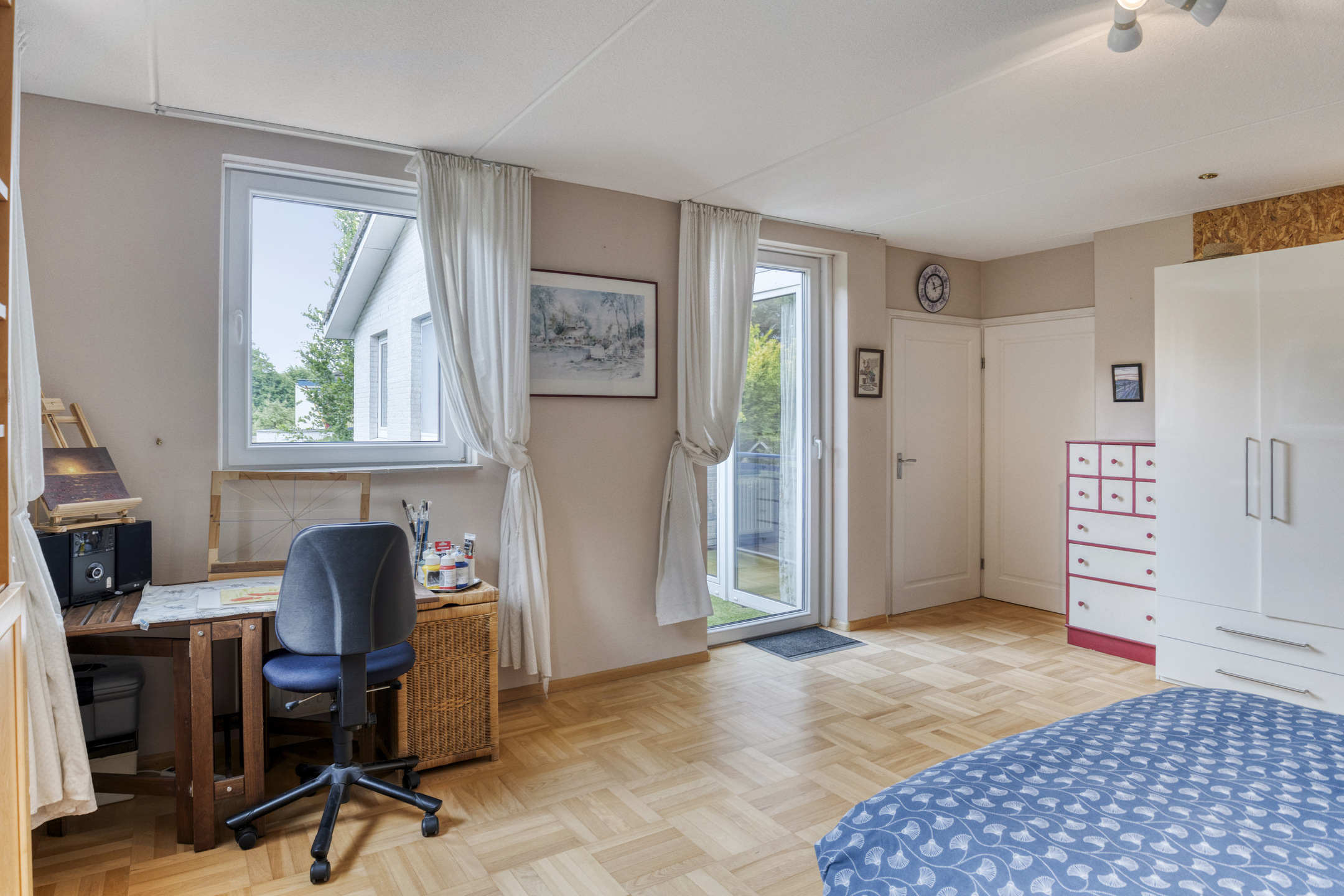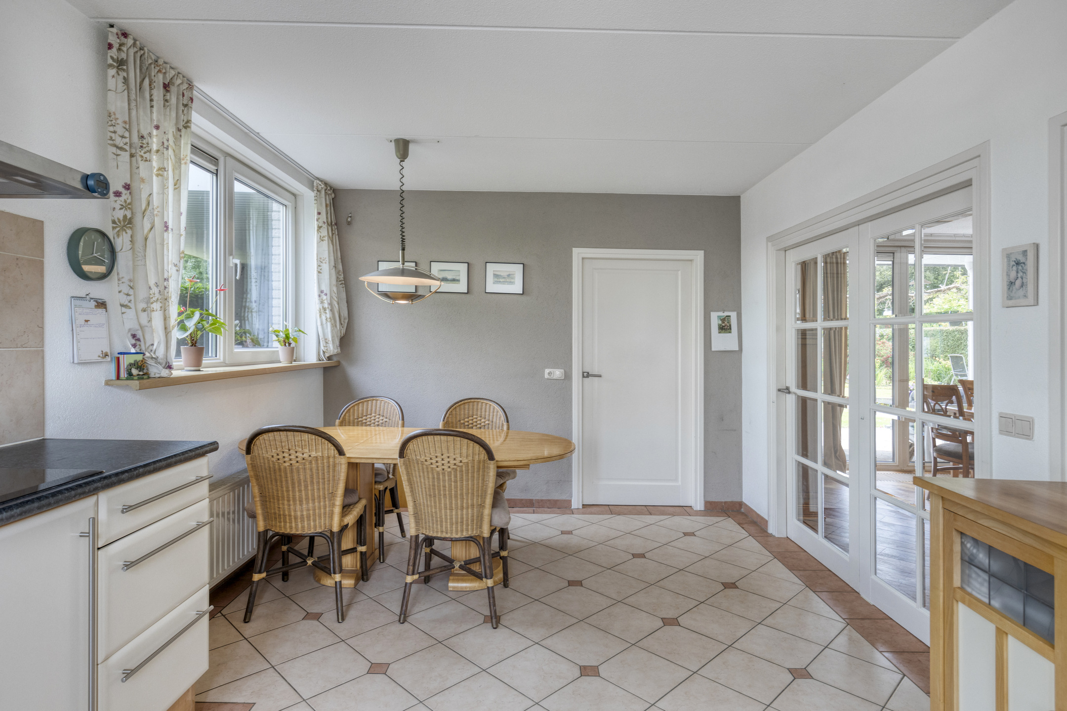 The spacious, L-shaped living room is nice and sunny due to large windows in front, back and side, and in the sitting area there is a beautiful fireplace with wood stove. In the right corner of the room is a garden room with sliding glass doors, allowing one to blend outside and inside when the weather is nice.