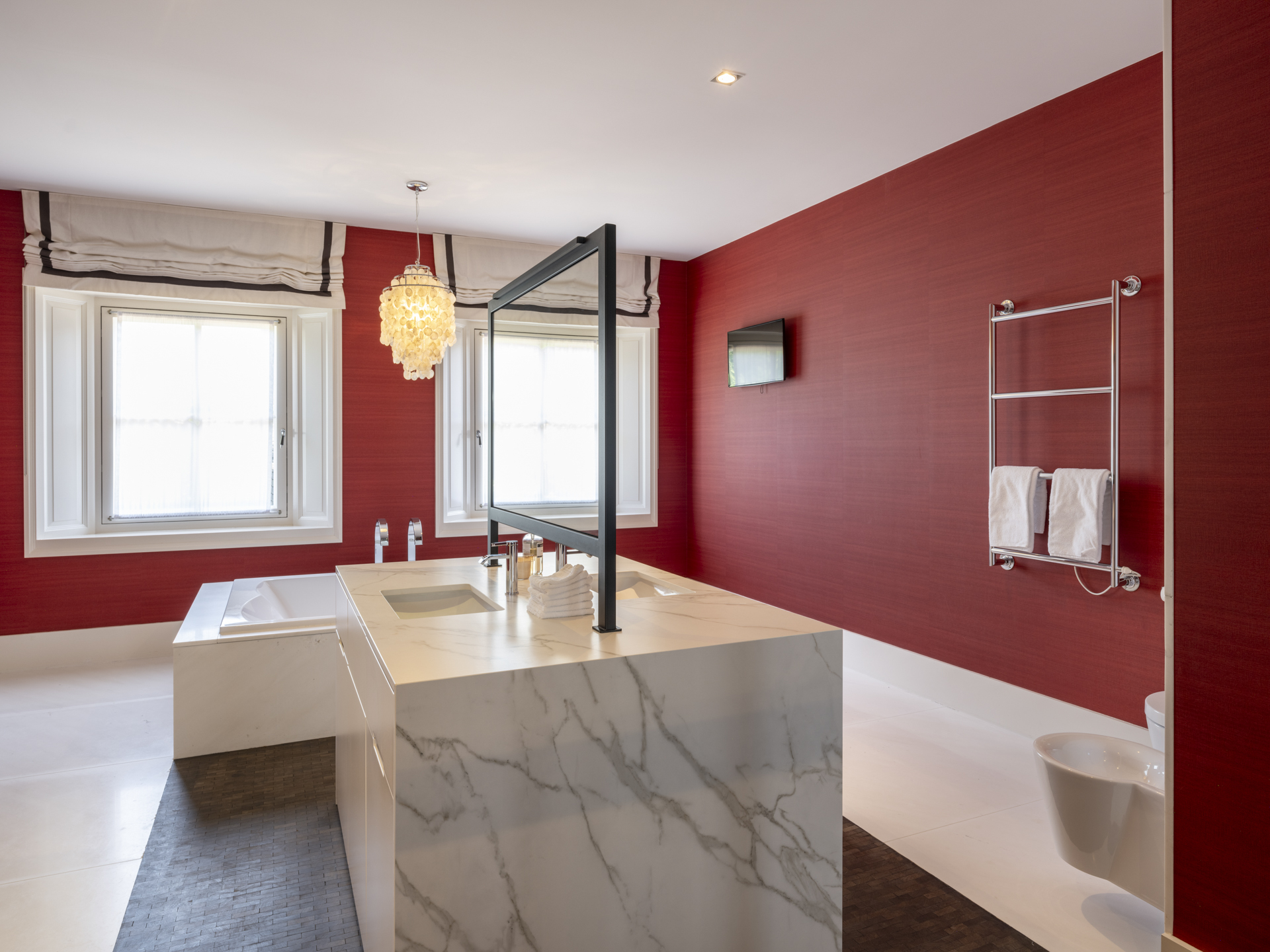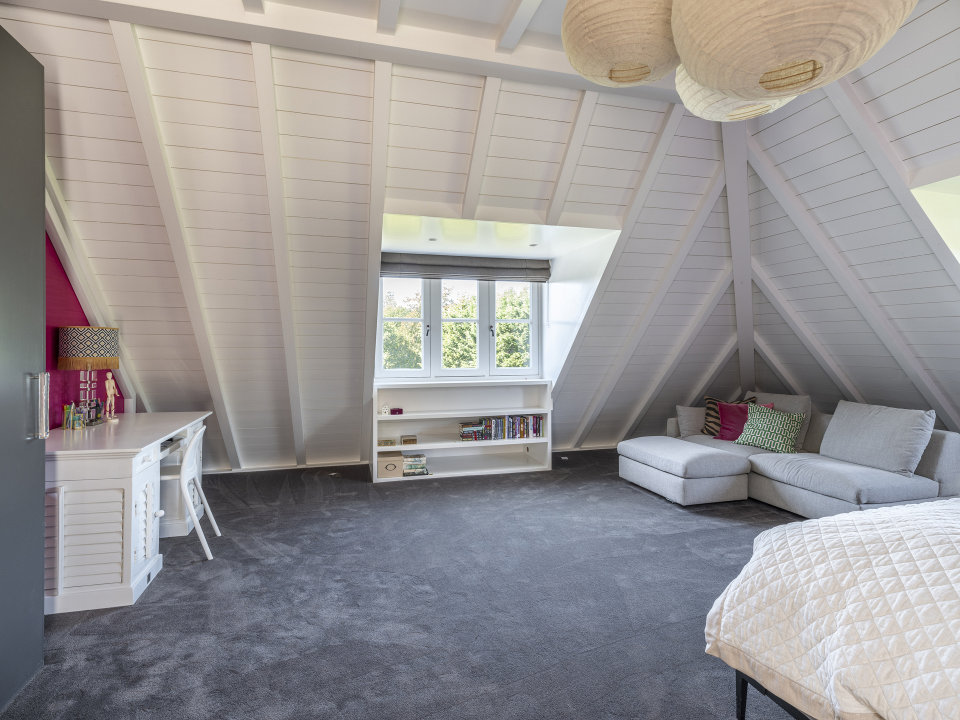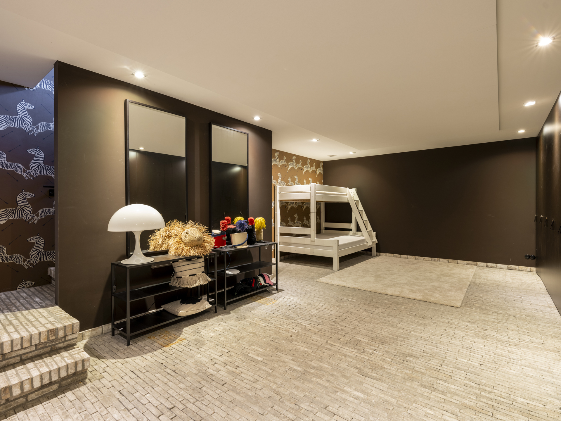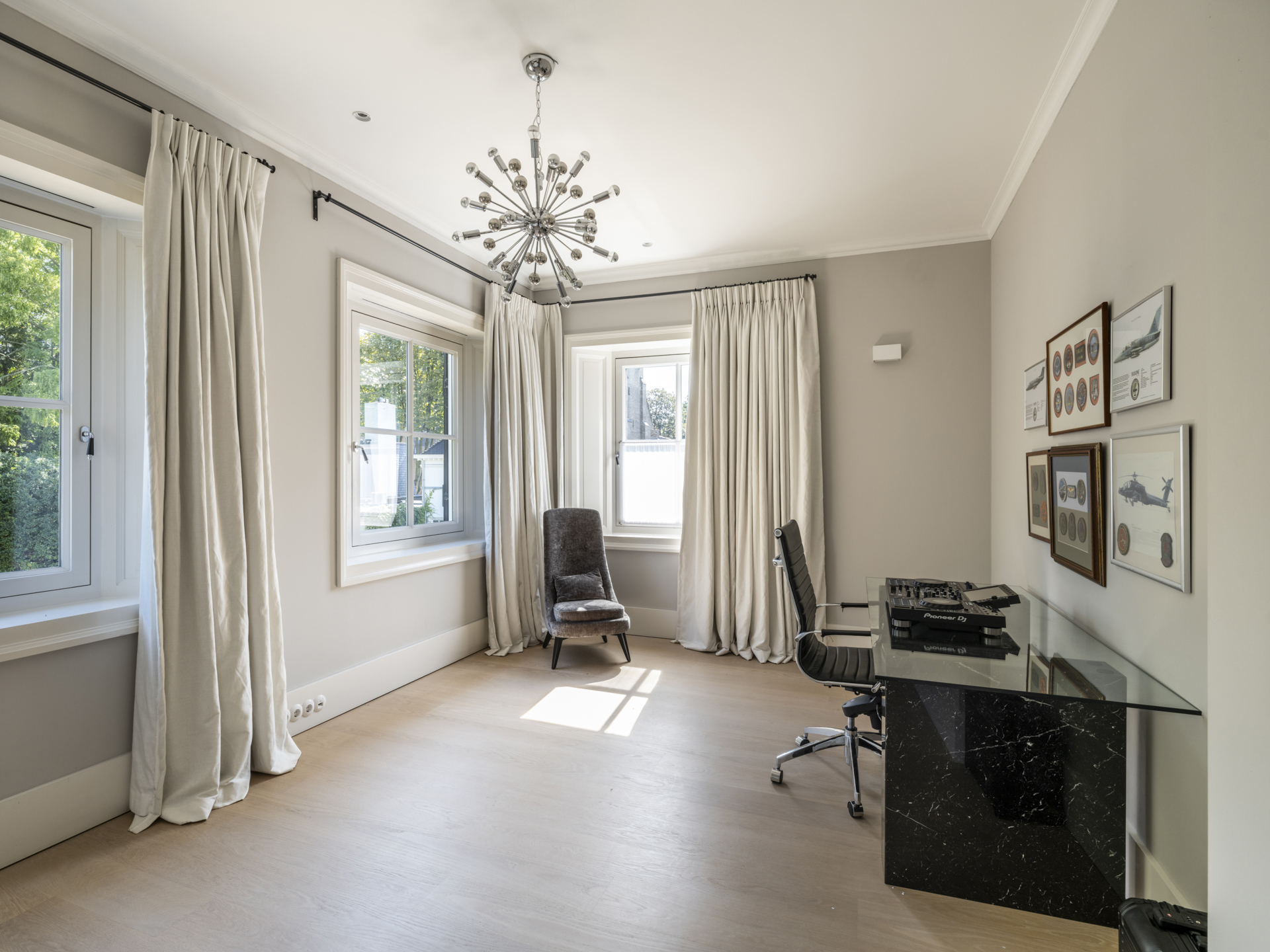 The main level flows from a stately entrance into luminous, open-plan living and dining spaces, anchored by a luxury kitchen whose glass walls draw the garden inside. A covered veranda with an open fireplace extends this sociable core into the landscape, while a quiet study and dedicated TV/work rooms balance retreat and connection. All seven bedrooms are air-conditioned, with the master suite offering both a garden-view balcony and a spacious dressing room adjacent to a double bathroom. The upper floors and attic grant additional bedrooms, private guest suites, refined bathrooms, and tailored storage throughout.