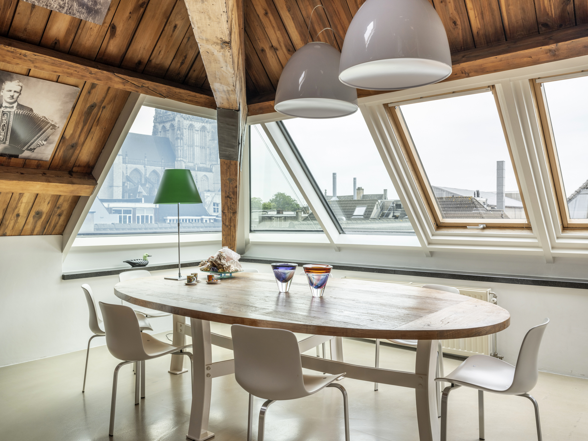 An exceptionally spacious living room (approx. 60 m²) with an open kitchen. The spatial experience is unique, due to the visible high roof structure and the large glass wall at the rear, which offers a fantastic view of the Grote Kerk (Great Church) of Breda.