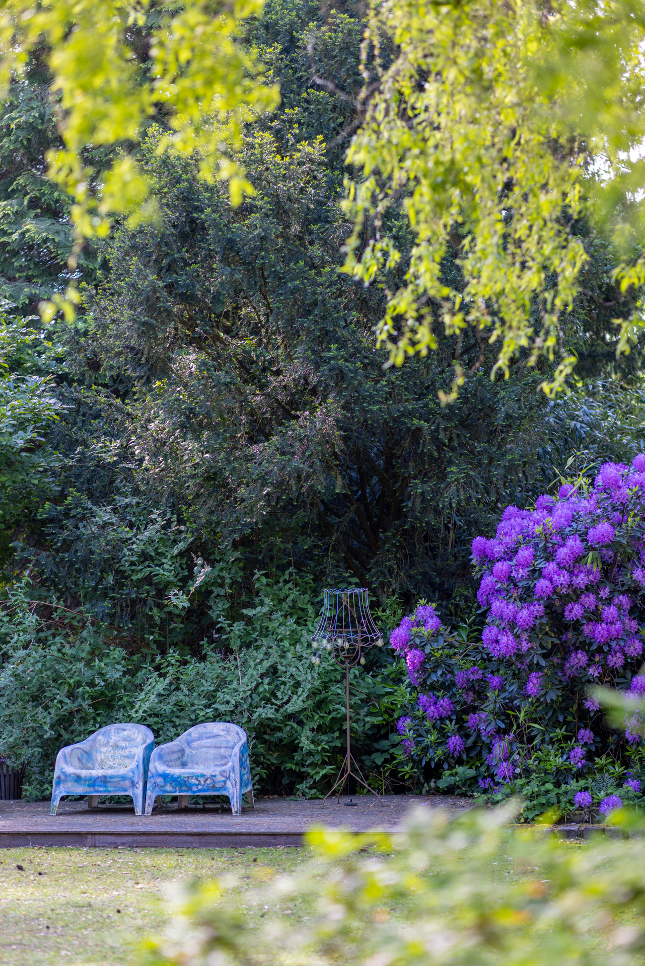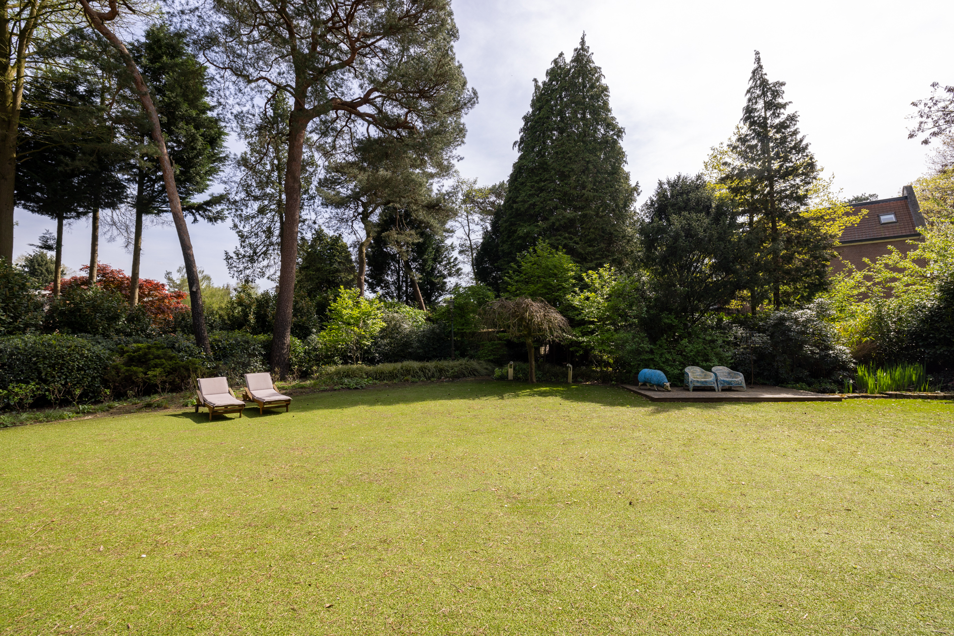 The garden is beautifully landscaped with a variety of terraces, green borders, a pond, a large (artificial) lawn, a wooden shed and mature trees. The garden is equipped with a sprinkler system