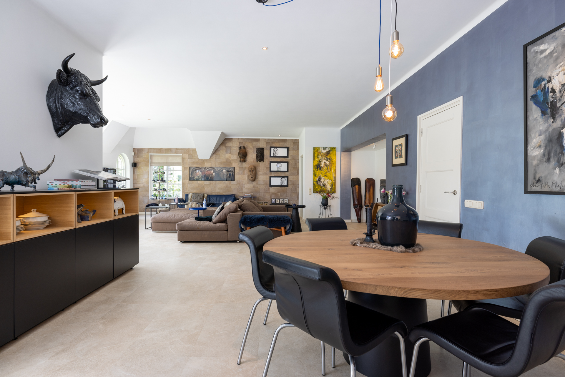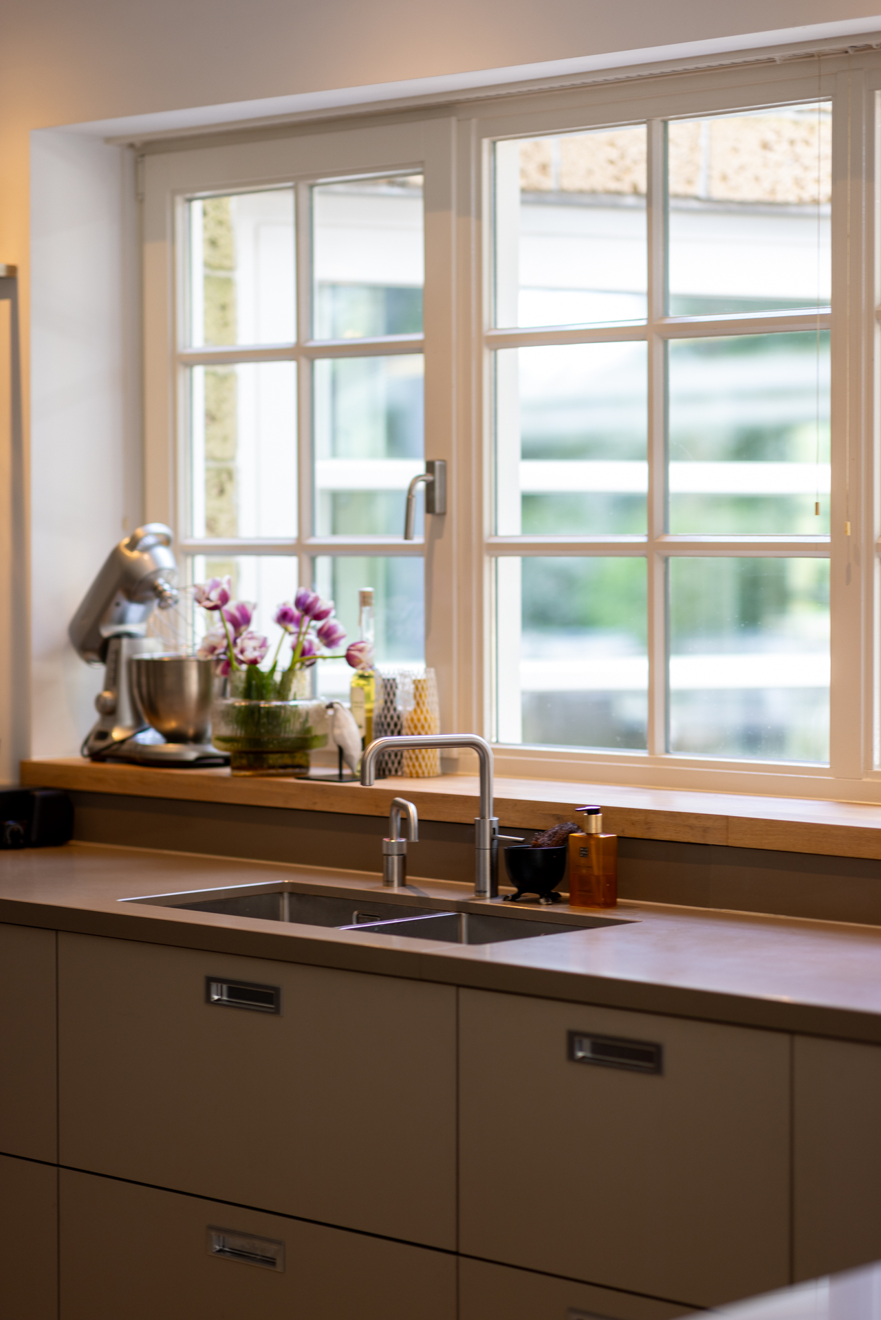The living room was expanded in 2005. The extension connects nicely to the thatched roof, making the garden doors extra high and offering a fantastic view of the garden. With the windows all around, the living room has a beautiful light. From the living room you have access to the second office / fitness room and through a beautiful sliding door to the kitchen.