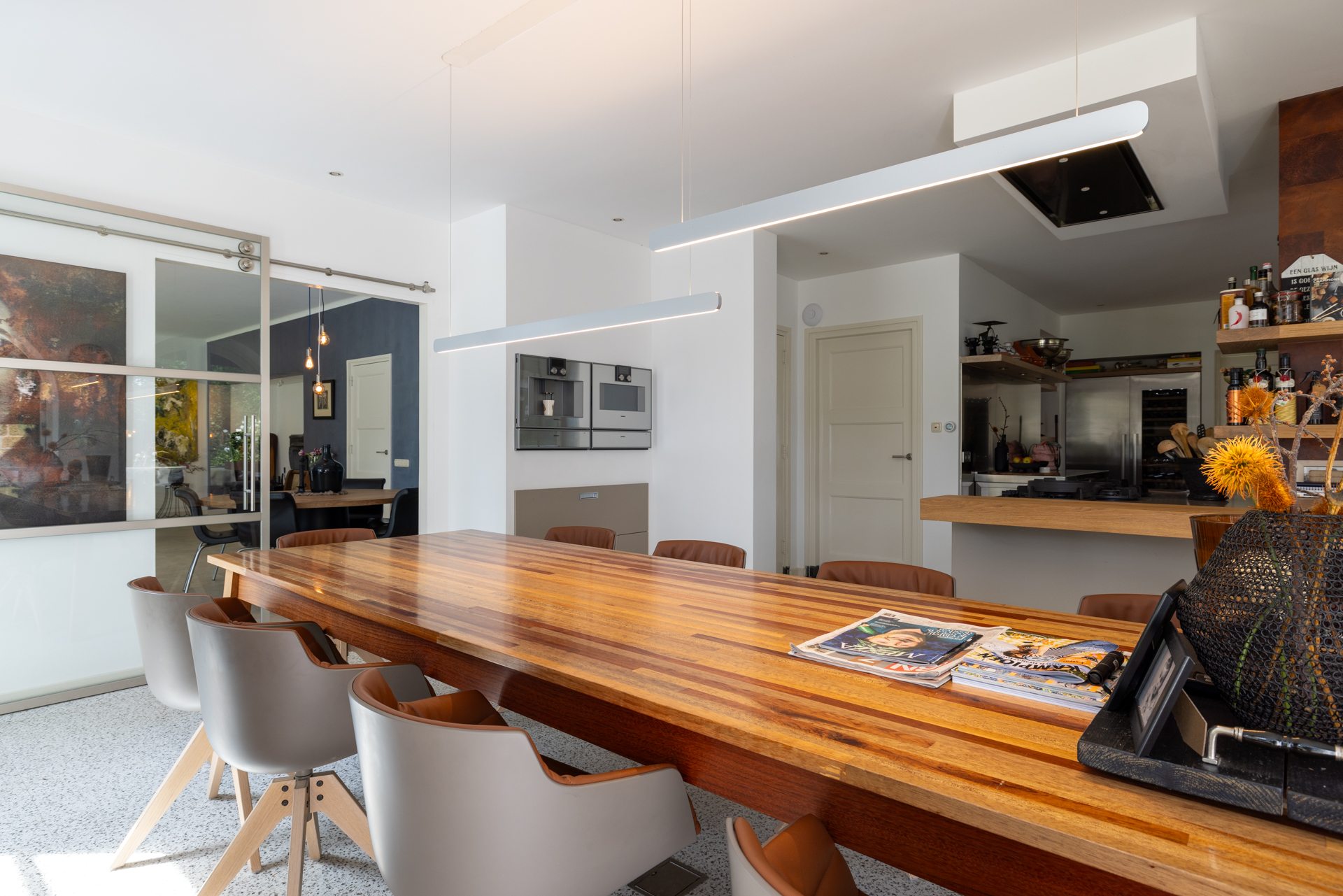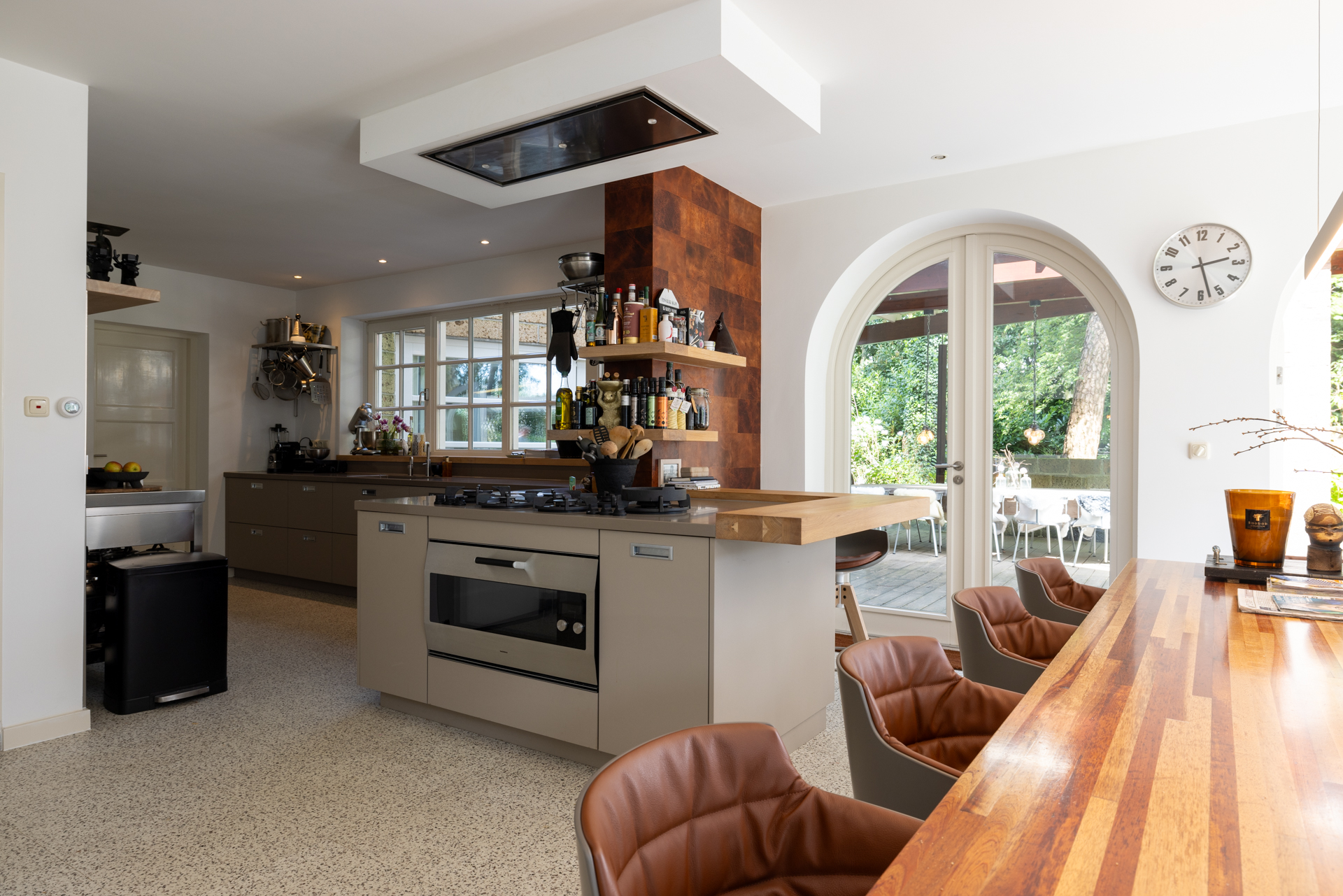 Great spacious kitchen (approx. 9.15 x 5.30 m, 2021), custom made by Antonissen interior construction and equipped with all desirable appliances such as a built-in coffee machine, combi oven, convection oven, 6-burner gas appliance (Pitt Cooking), composite counter top and a beautiful steel worktop with sturdy rear wall, extractor hood, double sink, integrated waste bin, Quooker and a large stainless steel refrigerator with separate Liebherr wine climate cabinet. Most built-in appliances are of high quality from the exclusive Gaggenau brand.