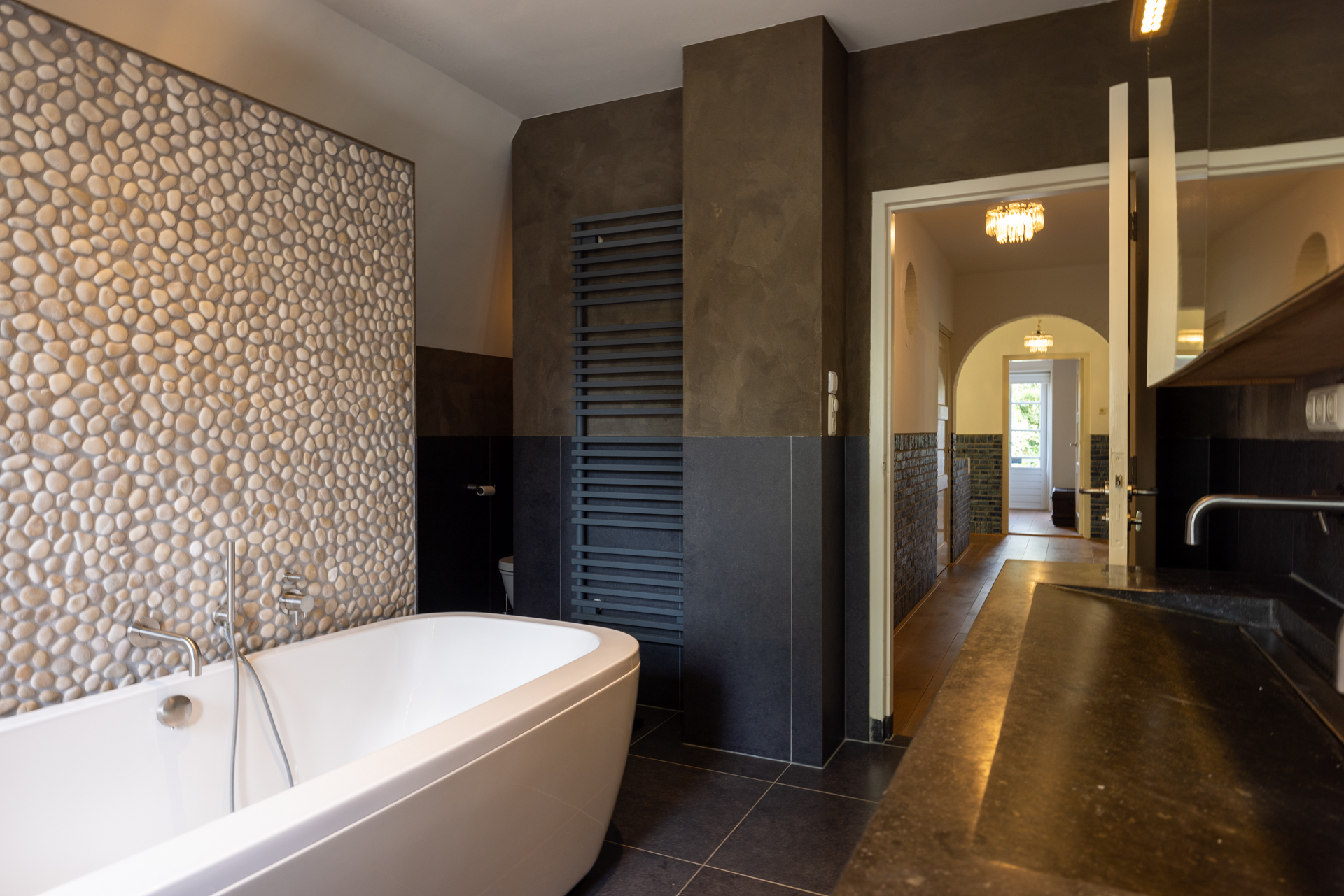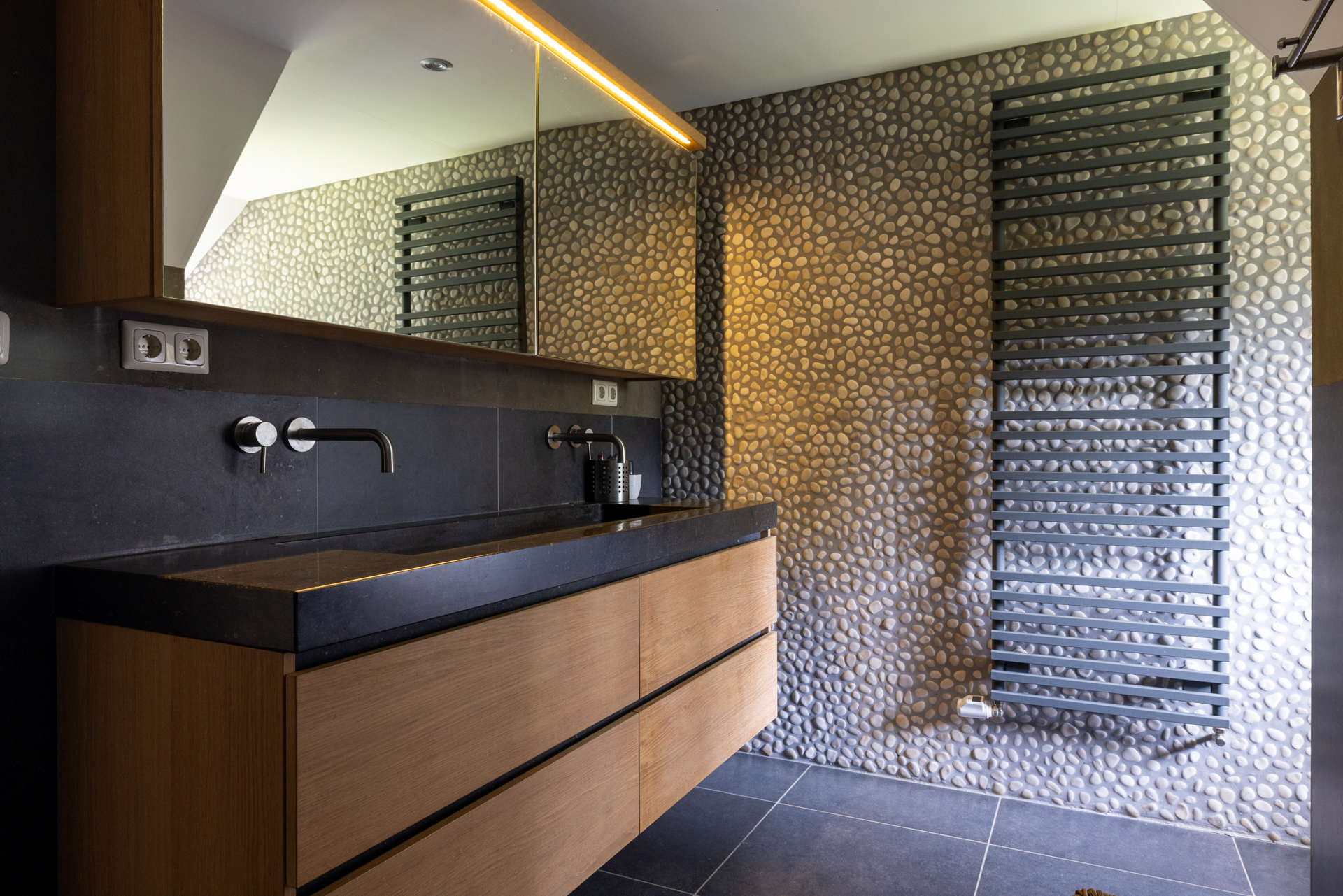 Spacious and luxurious bathroom (approx. 3.50 x 3.85/3.95 m) with a double sink, double walk-in shower, bath, toilet, design radiator, electric underfloor heating and mechanical ventilation. All bathroom furniture is custom made by Antonissen interior construction.