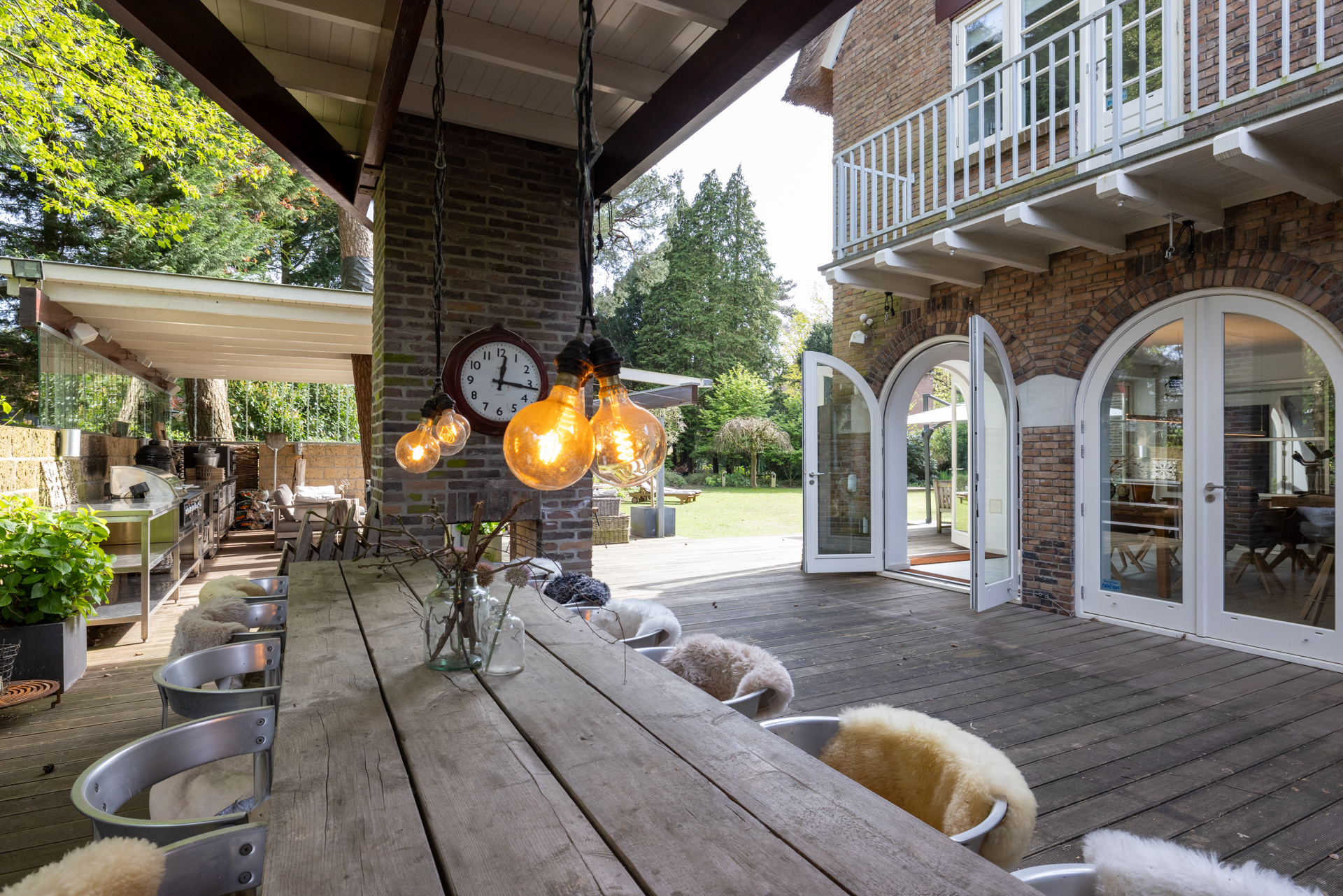 large covered outdoor area with wooden verandas and an outdoor kitchen directly attached to the house, making it indoors and outdoors