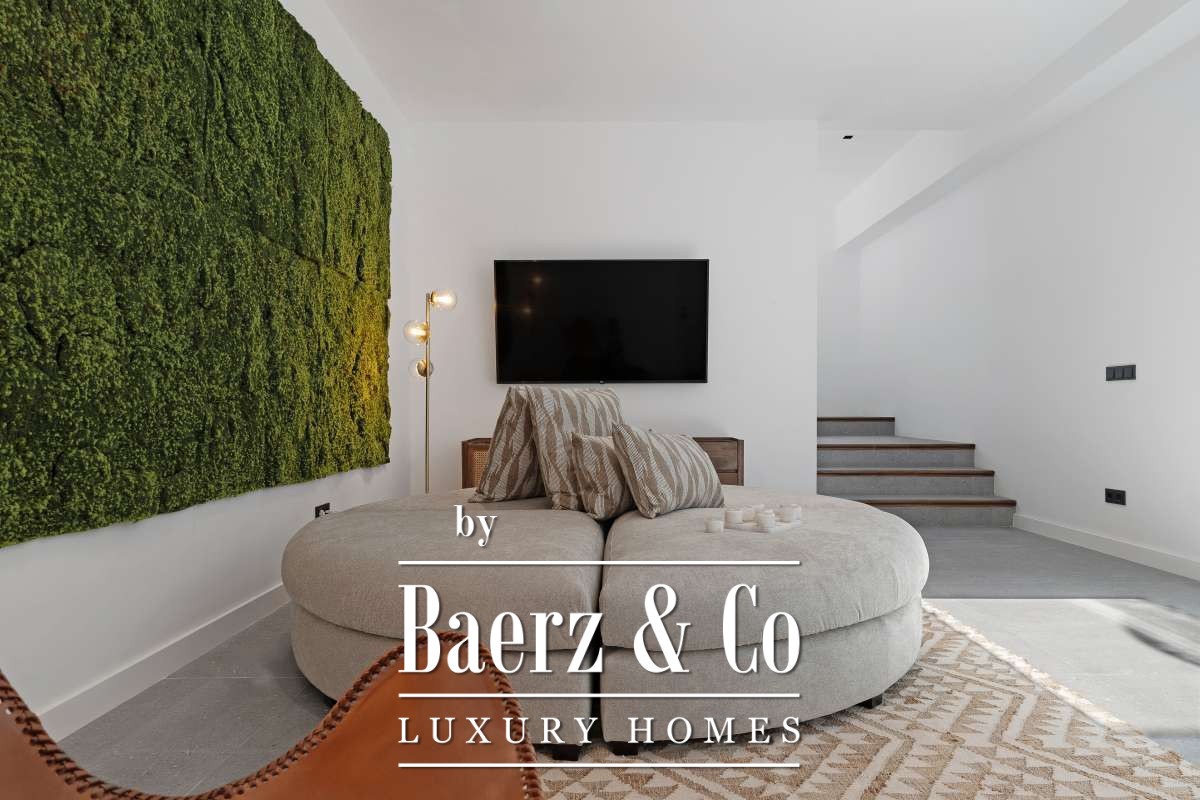 Outdoor living defines Modern villa Can Furnet. The main pool, styled with an integrated jacuzzi and bordered by palms, sets a spa-like tone. Multiple sun lounges, a Bali bed, and integrated seating create zones for relaxation. Ascend to the rooftop terrace to experience panoramic vistas and a second infinity pool, ideal for private entertaining or quiet evenings against the backdrop of Dalt Vila’s skyline. Parking, a secure, fenced perimeter, immaculate finishes, and a fully furnished handover provide immediate ease for those seeking an exclusive lifestyle villa in Ibiza’s vibrant heart.