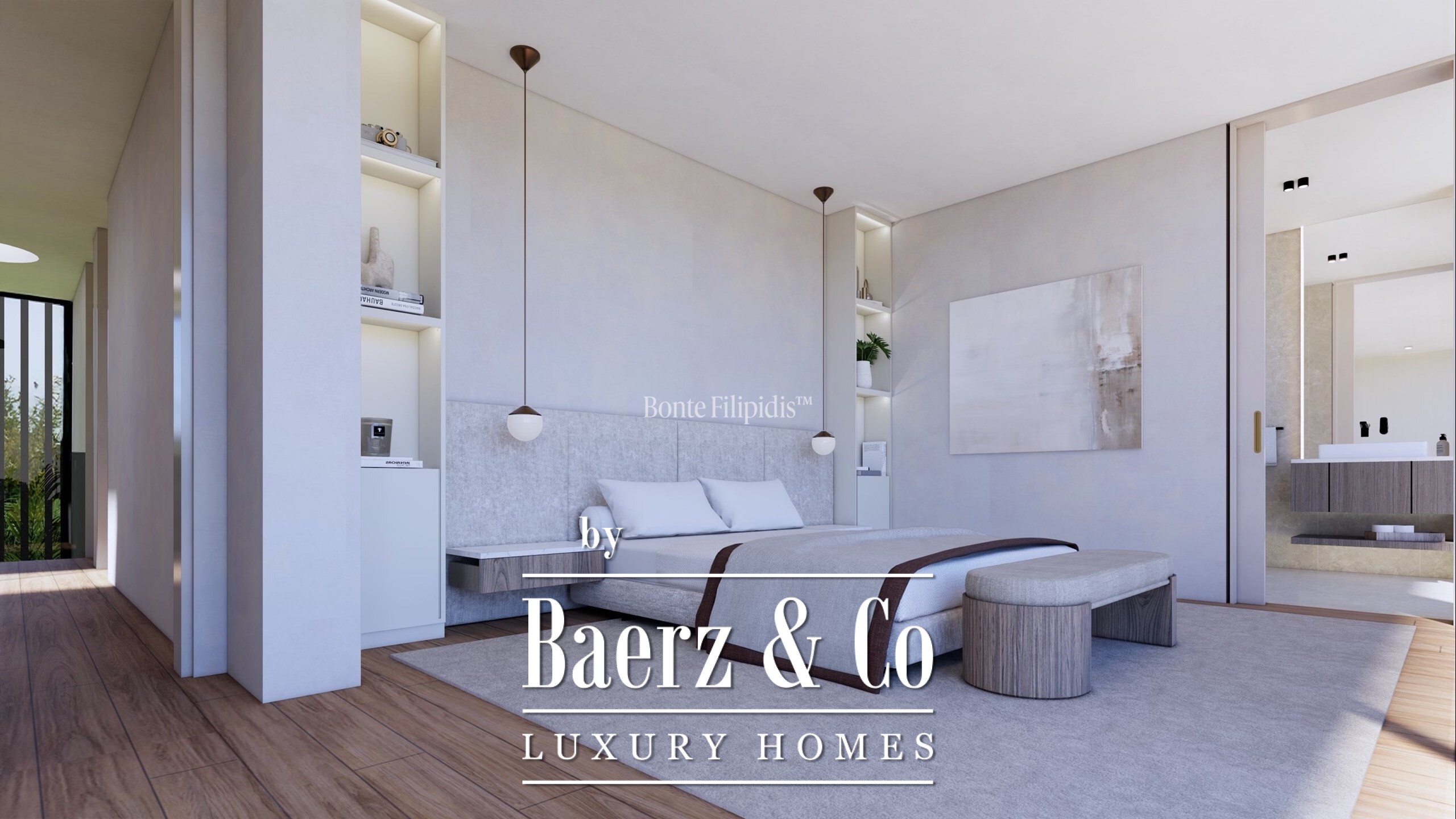 Upstairs, the four suites each open to terraces or balconies, while the main suite includes a walk-in closet, a generous bathroom, and a private terrace with tranquil views over the pool and garden. On the lower level, a suite joins a cinema room, gym, sauna, laundry, and garage.