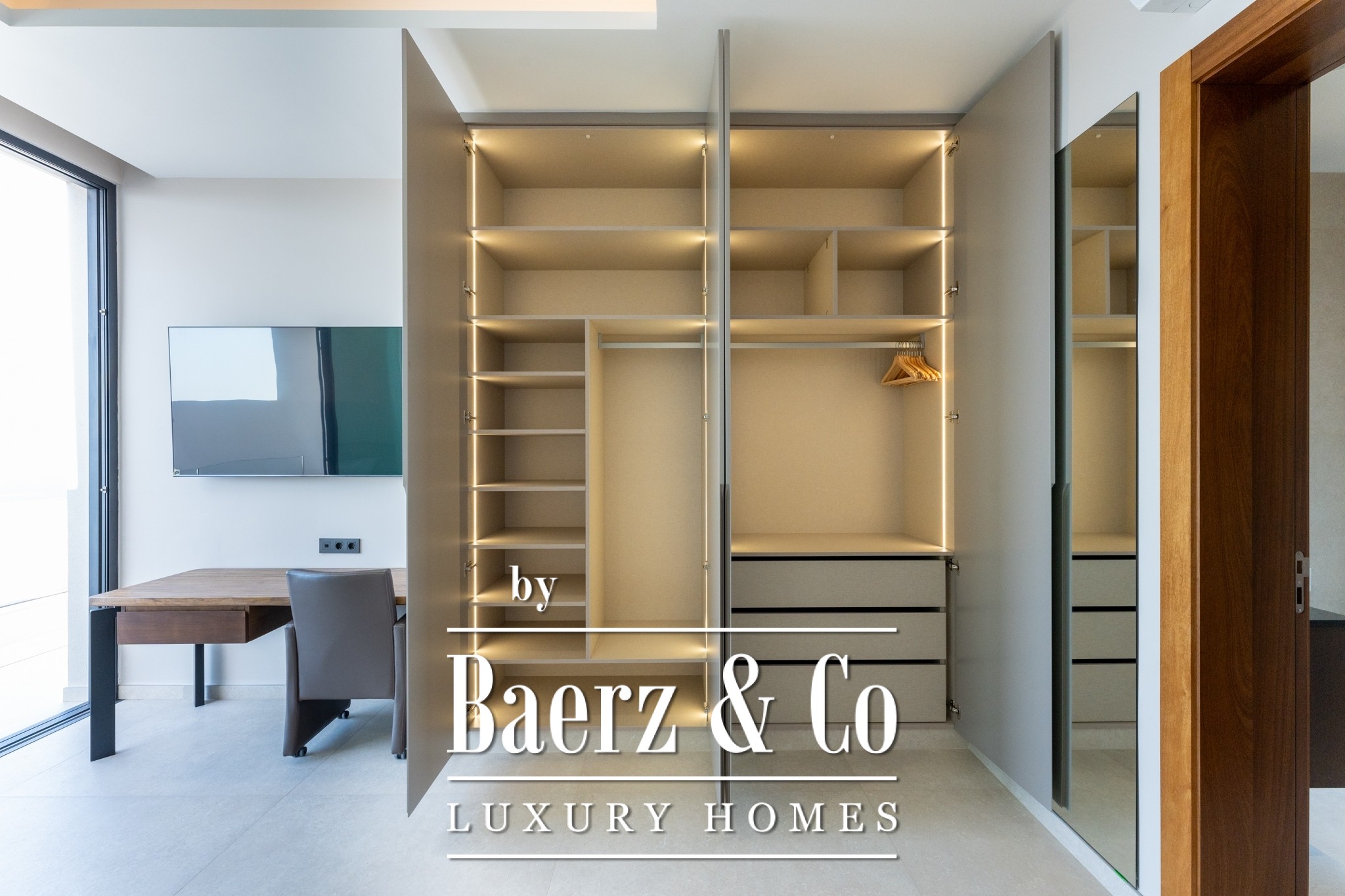 Inside, the living spaces are distinguished by calm spatial rhythms and high standards of craftsmanship. The ground floor integrates a bedroom, a convivial living area with a designer kitchen and bar, and seamless access to terraces tailored for effortless outdoor living. All four en-suite bedrooms are generously proportioned. Six bathrooms provide a refined touch, while a separate guest apartment complete with kitchen extends hospitality.