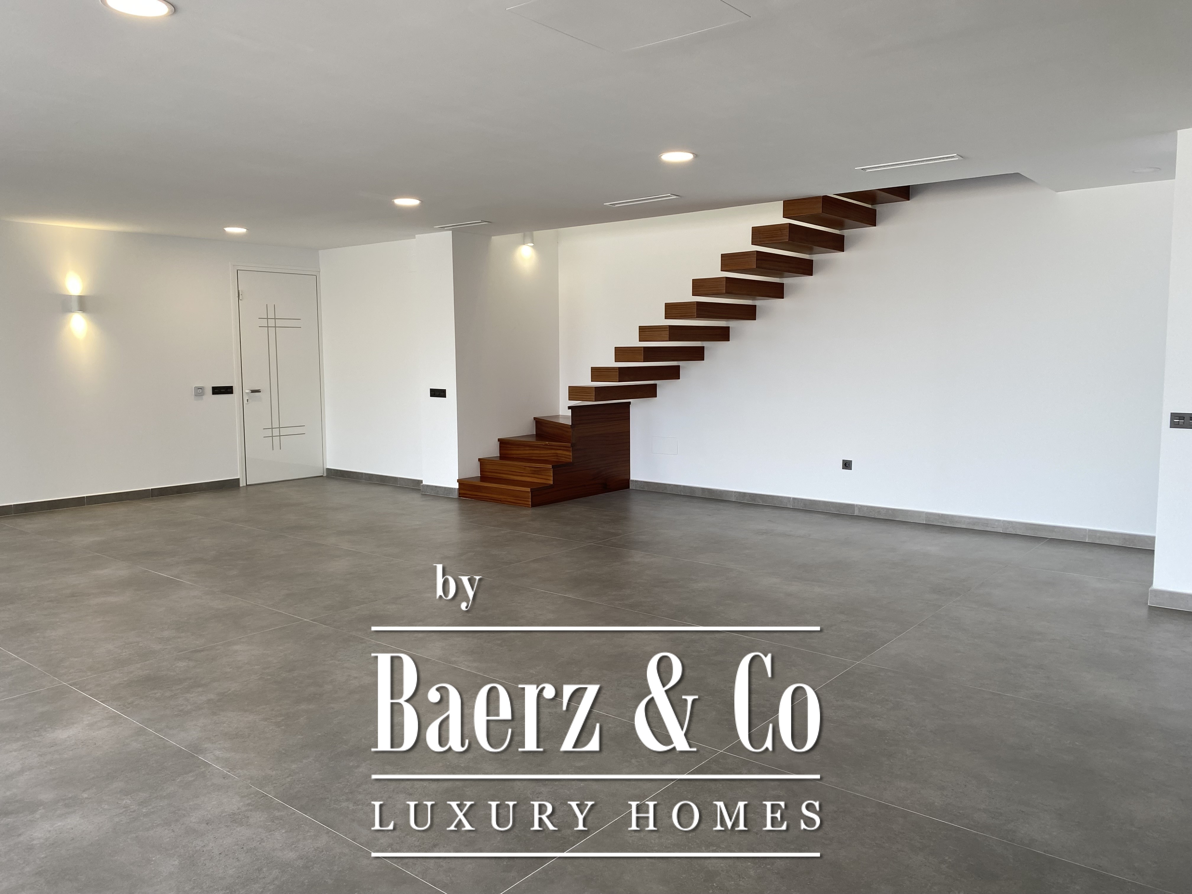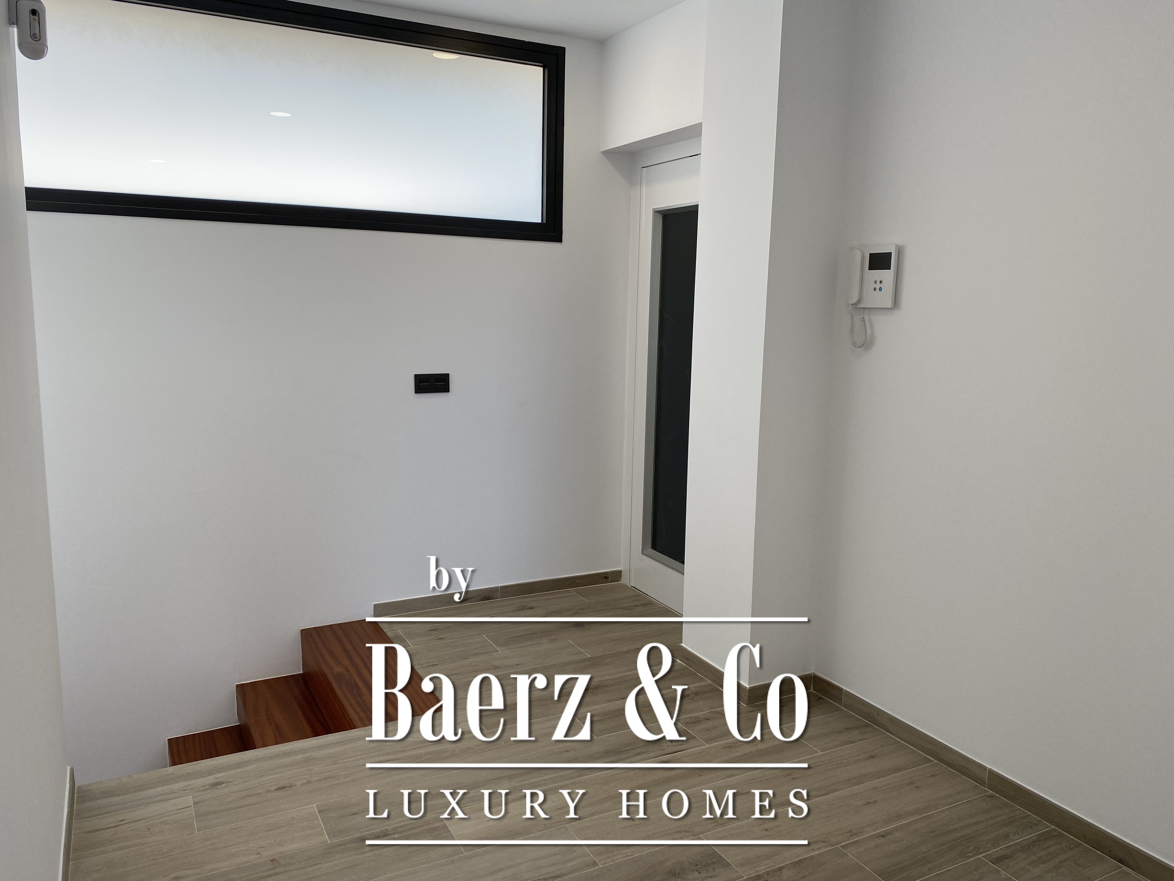 Bedrooms with en-suite bathrooms open onto private terraces, offering far-reaching views of the ocean and surrounding landscape. Features include a central air-conditioning system with a cool-air curtain on the ground floor, a solid wood floating staircase in the living area, and an office space with a guest toilet. The villa's private elevator with elegant glass doors links the garage—large enough for four to five cars and with its own bathroom—to every floor.