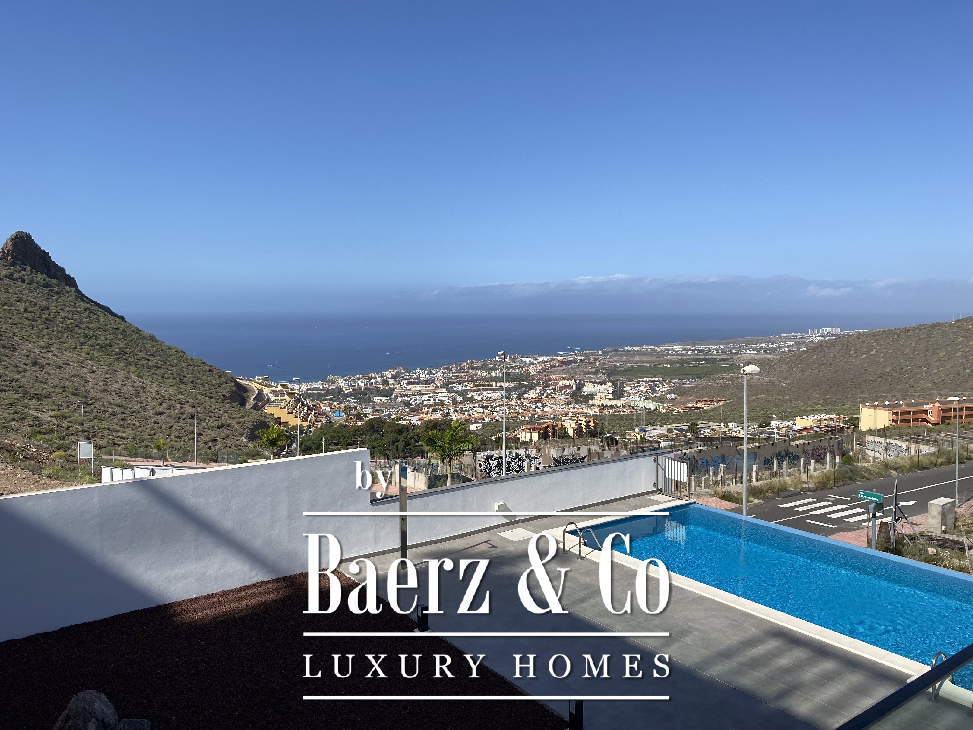 Villa Costa Adeje with panoramic ocean views presents an exceptional blend of refined architecture and contemporary comfort. This four bedroom, five bathroom villa stands within a distinguished neighborhood, shaped by careful attention to detail and high-quality materials. The living area of 230 m² unfolds across open, minimalist volumes that connect seamlessly to the outdoors through a foldable glass wall. Generous natural light fills the spaces, highlighting the designer kitchen and living-dining room that extend effortlessly towards the infinity pool of nearly 40 m² and the expansive 755 m² plot.