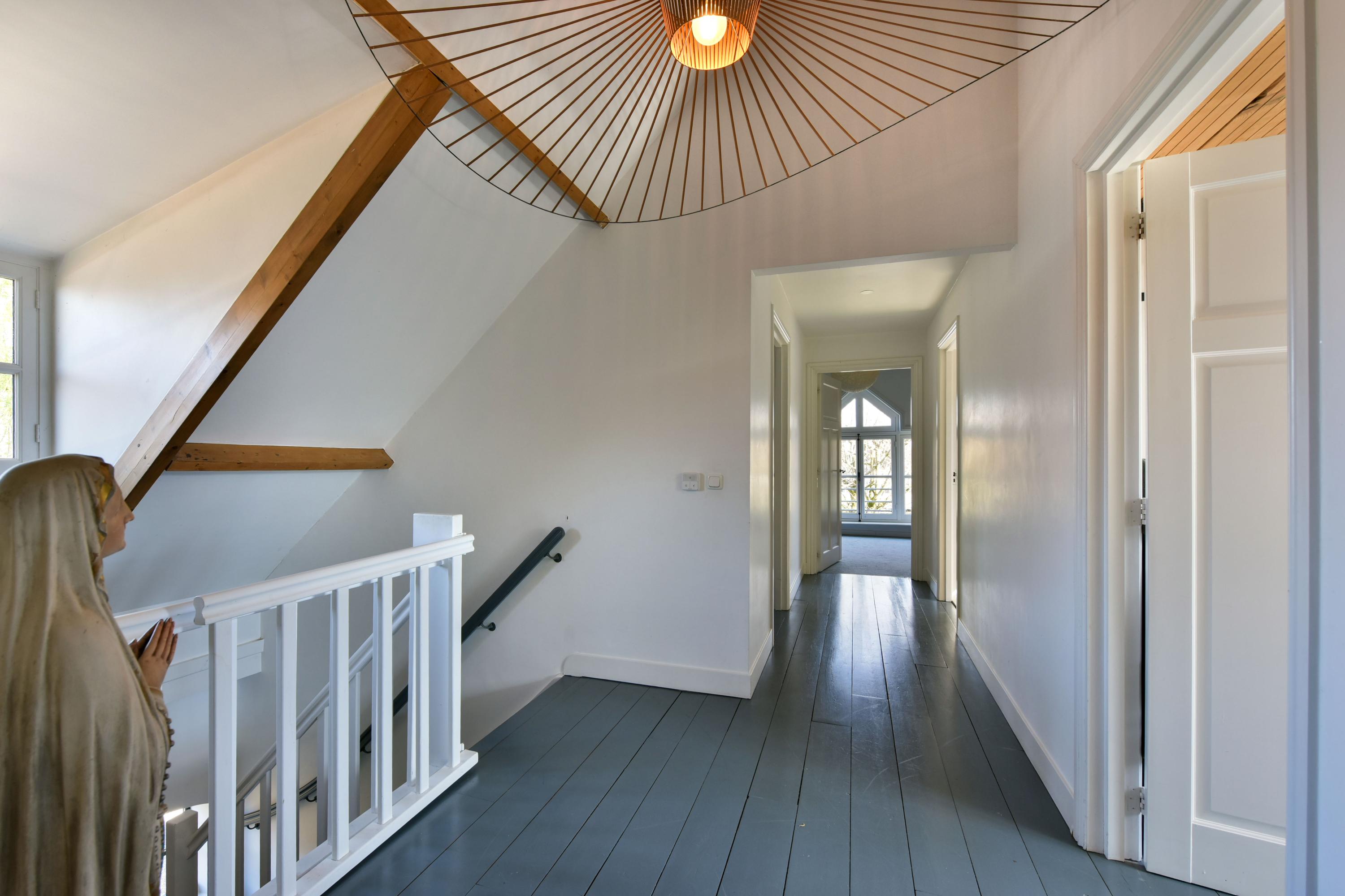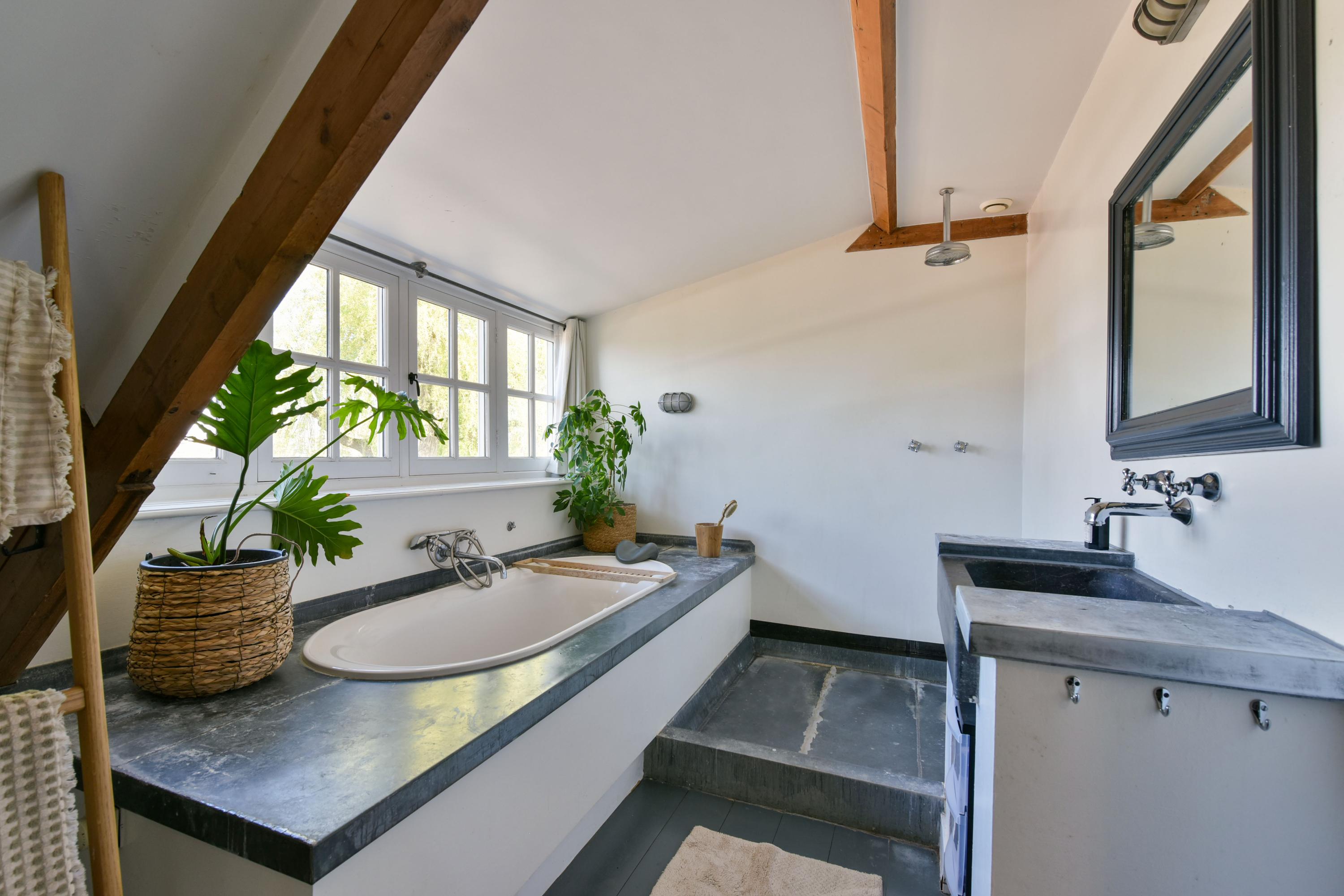 You enter this remarkable farmhouse via the side façade into a spacious hallway with a stunning light-filled mezzanine that immediately emphasizes the home’s height and openness. The hall features a large coat area and a luxurious toilet, with a striking stone washbasin. Behind one of the cabinets, you’ll find the central heating system, along with the meter cupboard. A stylish staircase leads to the upper floor. From the hall, you can access all the main rooms on the ground floor.