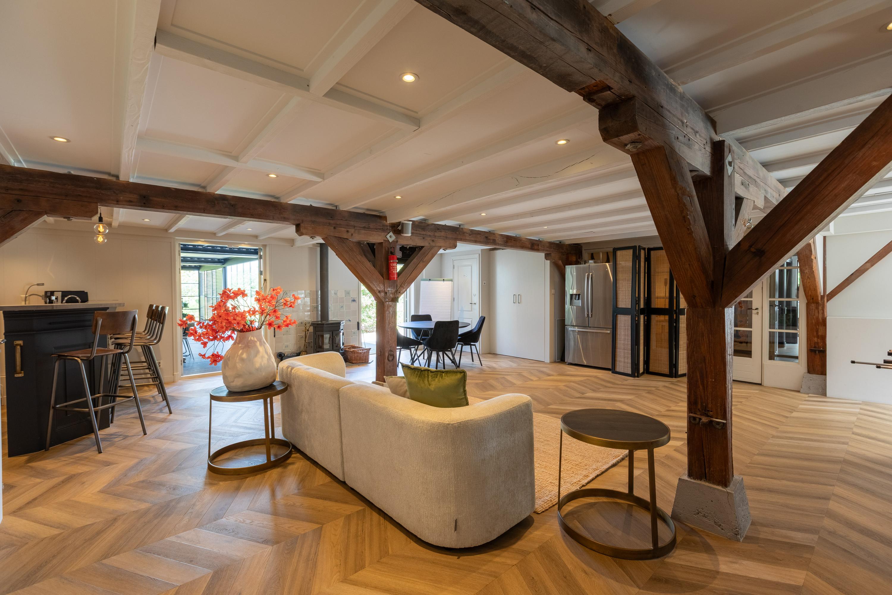 Adjacent to this is the stylish living room, consisting of two parts that can be arranged according to your own wishes. Currently, the dining room is located in the former upper room (the raised section) and the sitting room in the lower section, where the characteristic beamed ceiling immediately catches the eye. If desired, the dining room and living room can easily be swapped.
