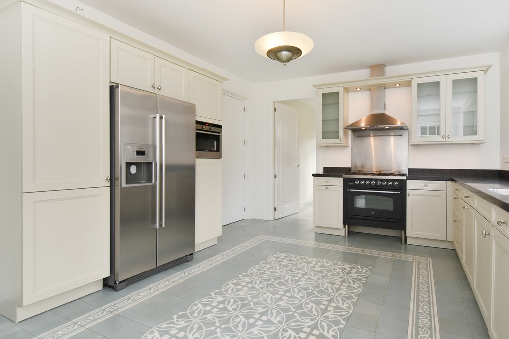 Entrance with wardrobe and meter cupboard. Spacious hallway with access to the study (3.80 x 3.40 m). Guest toilet. Living room with elegant herringbone parquet flooring and fireplace. Multiple French doors provide access to the surrounding garden. Large open-plan Siematic kitchen (4.18 x 5.30 m) equipped with an American-style fridge/freezer, 6-burner gas hob with oven, extractor hood, dishwasher, and a separate combi microwave/oven. Utility room with washing machine and dryer connections. Sunny, generous terrace (6.05 x 6.22 m).