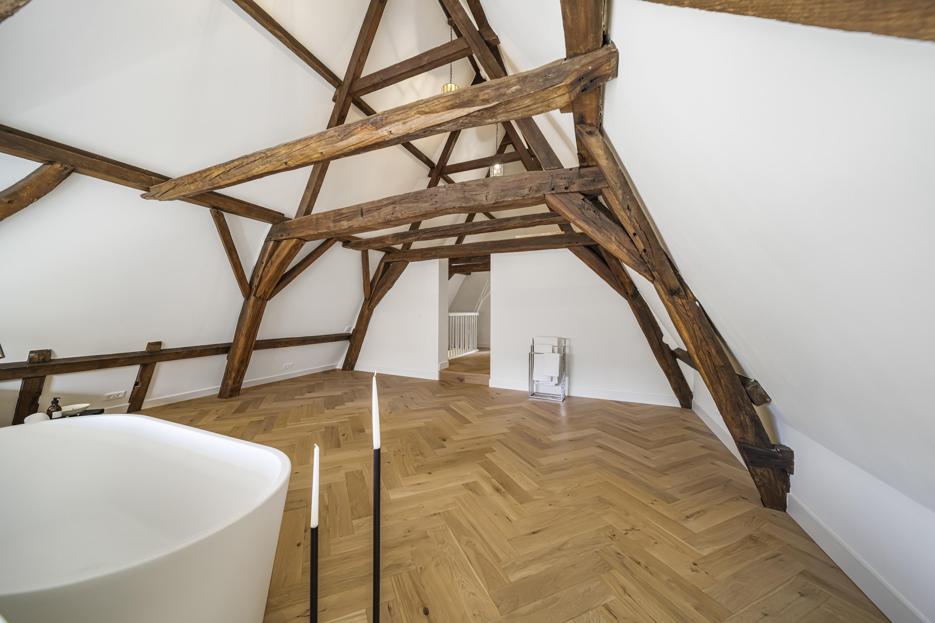 Newly installed herringbone parquet flooring on the ground and upper floors