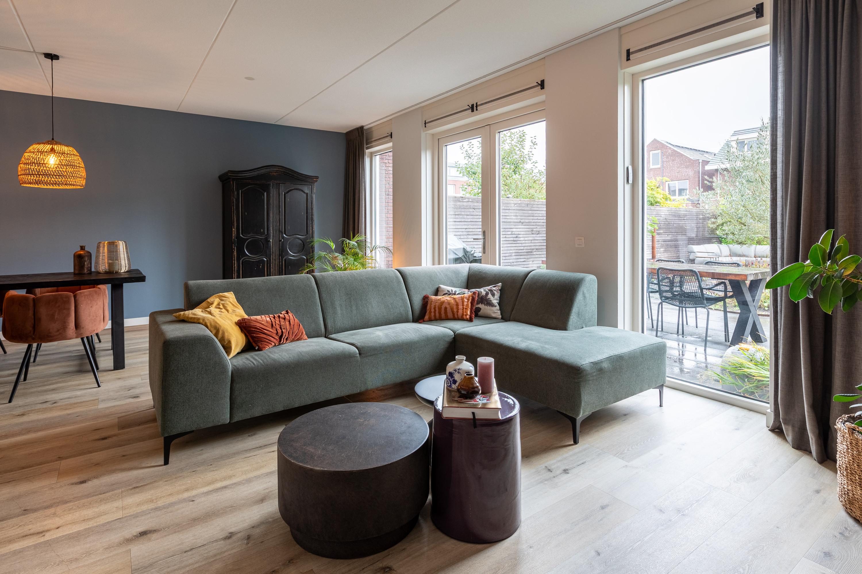 At the rear is the living area with a view of the beautifully landscaped garden. The living room is wide and offers enough space for a spacious sitting area. The sunny south-facing back garden has a large terrace, a greenhouse, a wooden shed and a jetty on the water. In summer, you can step right from your own garden onto your SUP board! The garden is also accessible via a back entrance along the house.