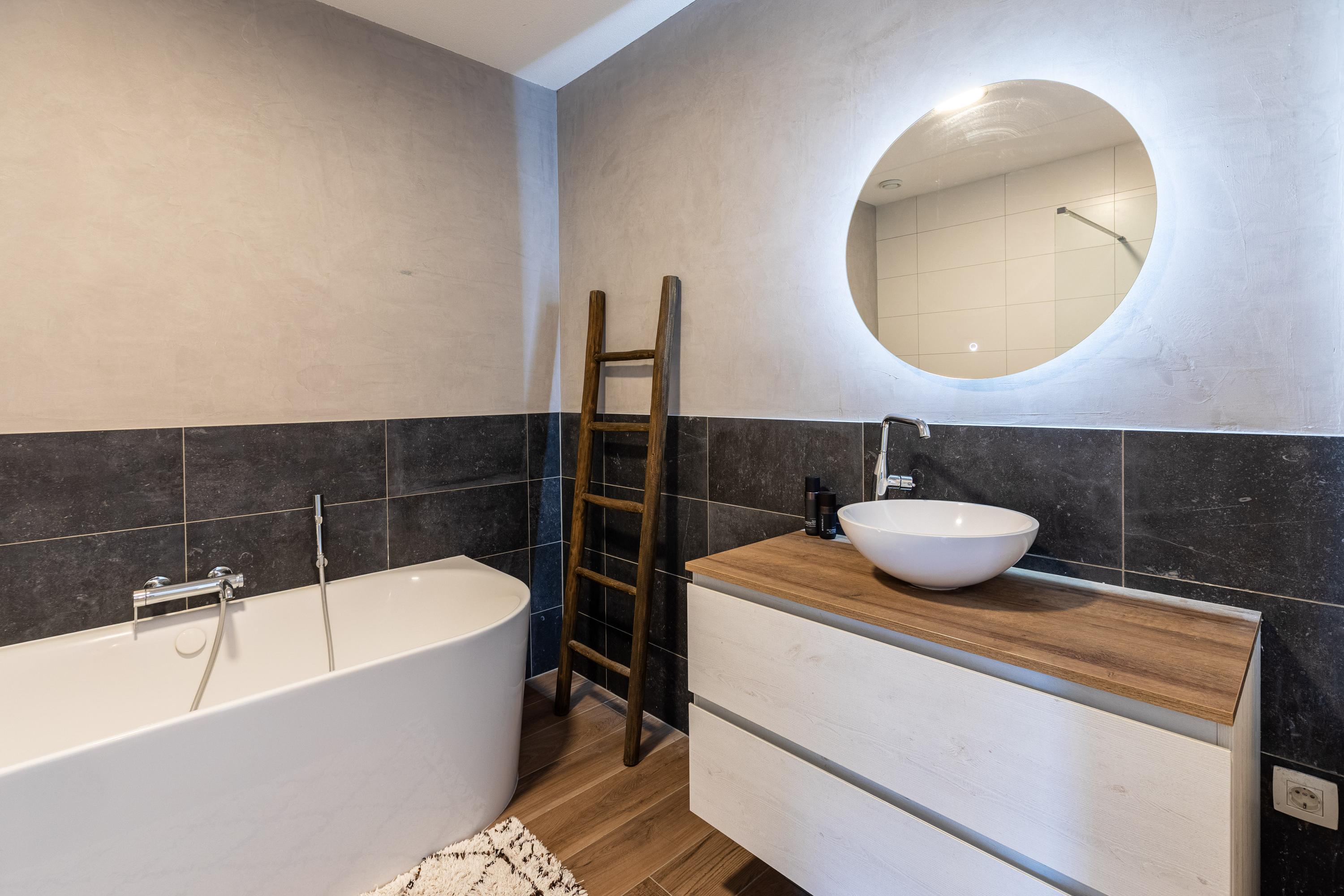 There are two spacious rooms at the rear, while two more bedrooms are located at the front. In the middle is the luxurious bathroom with a walk-in shower, bathtub, double sink and designer radiator. There is also a separate second toilet on this floor.