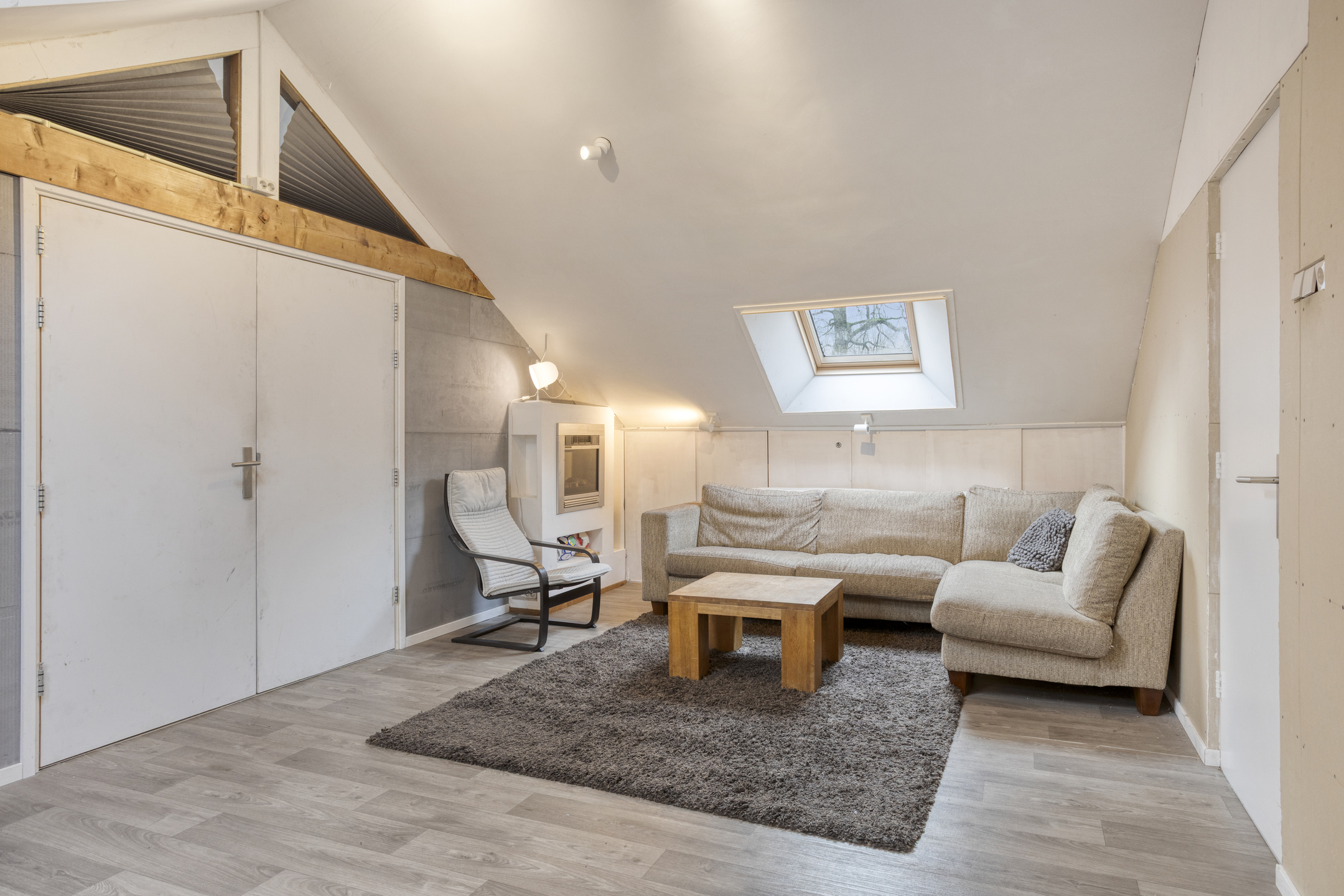 Eerste verdieping: bordes met toegang tot de vide die nu wordt gebruikt als atelier, de berging en de twee hele ruime kamers (30 m²). De berging is voorzien van een wastafel en daar zit tevens de CV-ketel. De ene kamer wordt nu gebruikt als slaapkamer en de ander als extra living. Dit kan uiteraard ook prima gebruikt worden als slaapkamer.