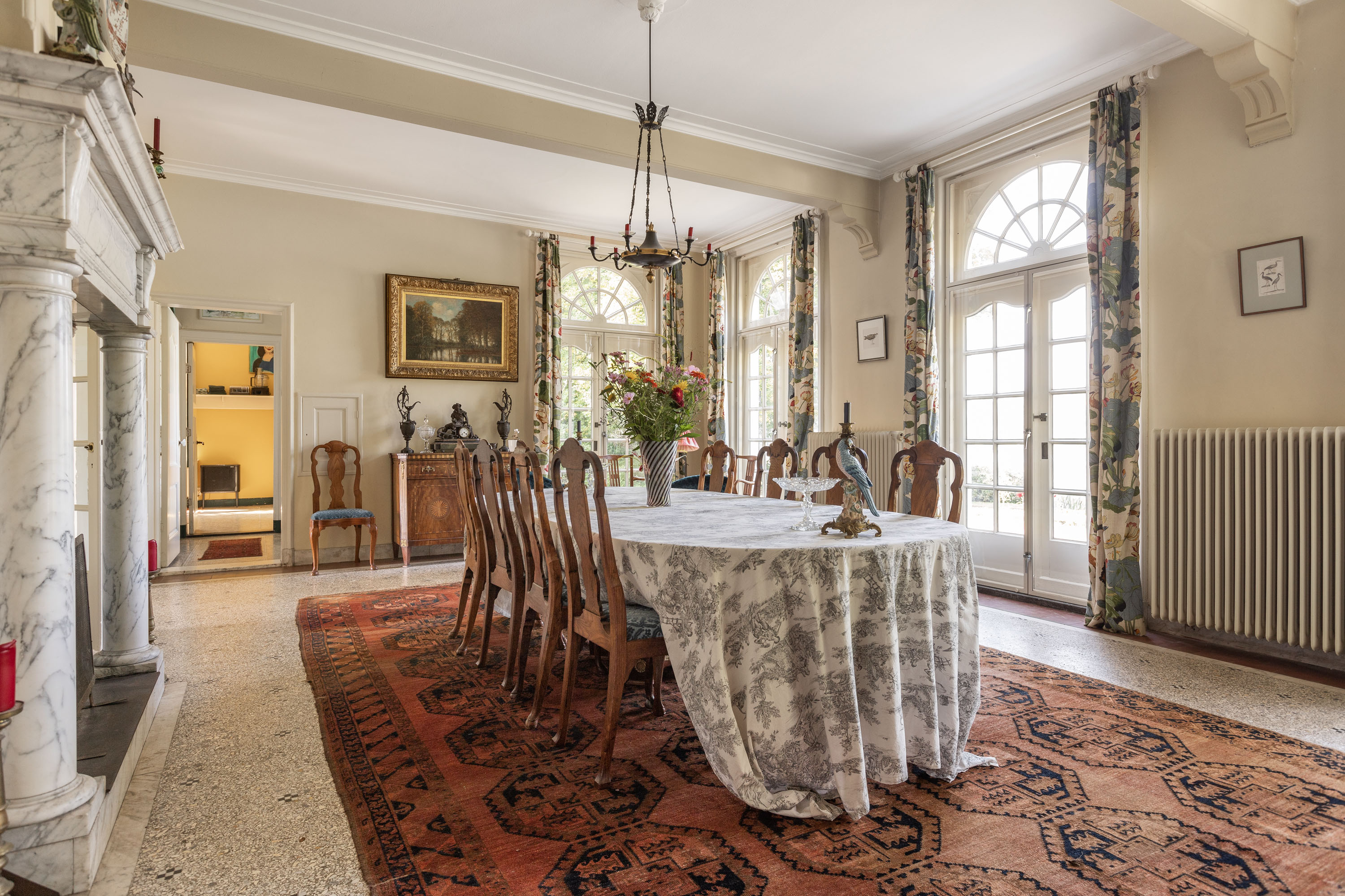 The villa’s architecture honours its origins, maintaining original terrazzo floors, parquet, built-in cabinetry and extensive stained glass. Seven bedrooms and two bathrooms are arranged to balance family life and privacy. Carefully preserved features are complemented by discreet upgrades, including a modern pellet stove and heat pump system, secondary glazing, cavity walls and a fully insulated roof.