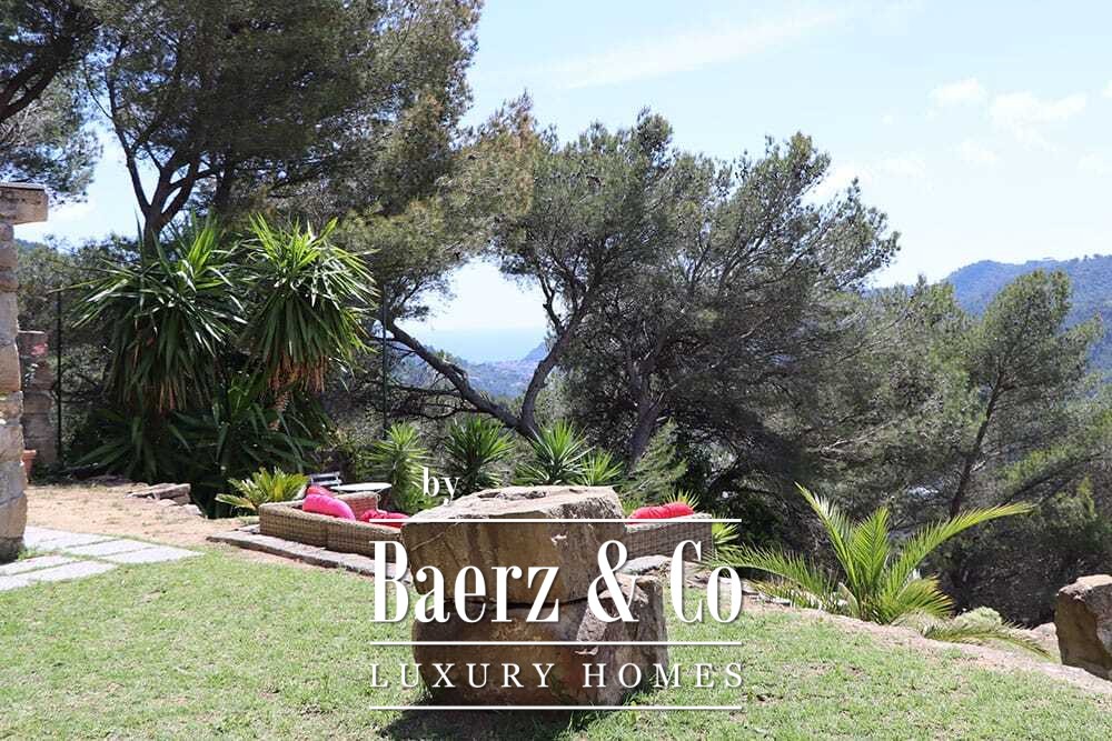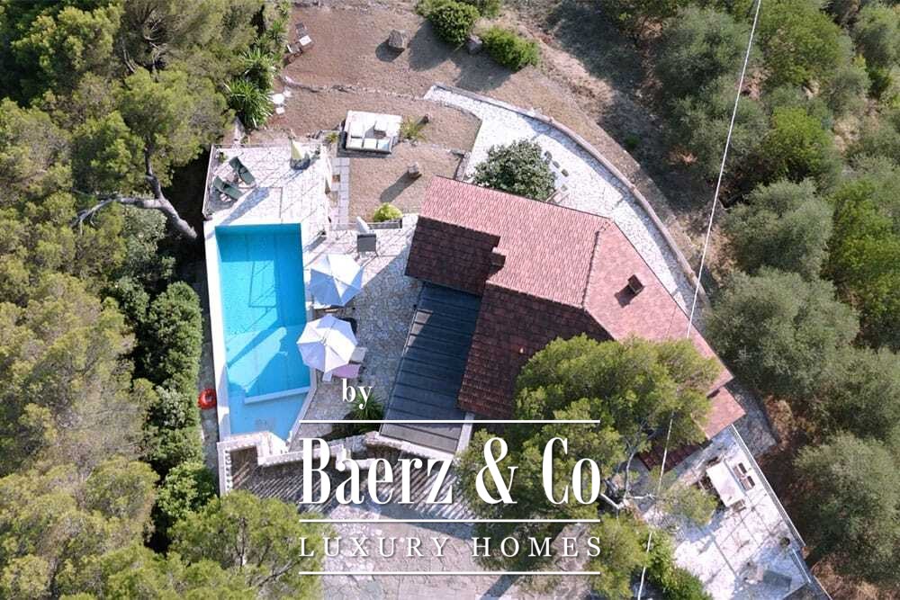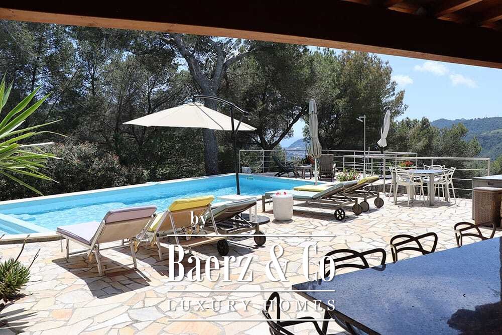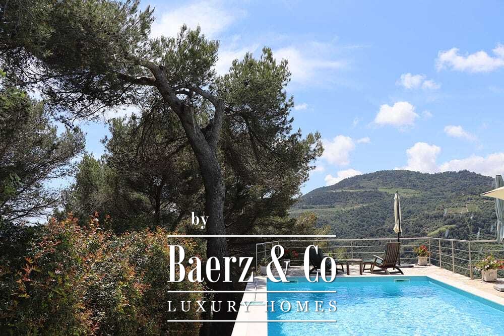 The 11 by 4 metre swimming pool, fully renovated in 2022, lies next to an expansive terrace, offering views over the valley and out to the sea. Multiple terraces, outdoor kitchens, and shaded pergolas invite relaxed dining through all seasons. Paths around the house are lined with olive groves, with hours of sun ensuring exceptional harvests.