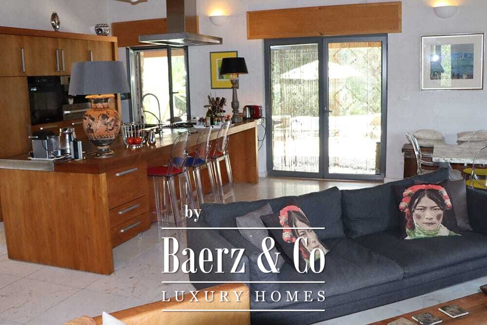 Within its two floors, the villa offers four bedrooms and four bathrooms. Three ground floor bedrooms, each with French doors, open to a lower terrace and mountain vistas. The master suite features a large bath, separate shower, twin marble basins, and designer fittings, defining a sense of sanctuary. The studio bedroom, with private entrance, enhances flexibility for guests or work. Upstairs, a beamed living room with fireplace adjoins a walnut and stainless steel kitchen equipped with premium Miele appliances. High glass doors lead to a lounge with a second fireplace and access to terraces finished with granite tables and Philippe Starck chairs.