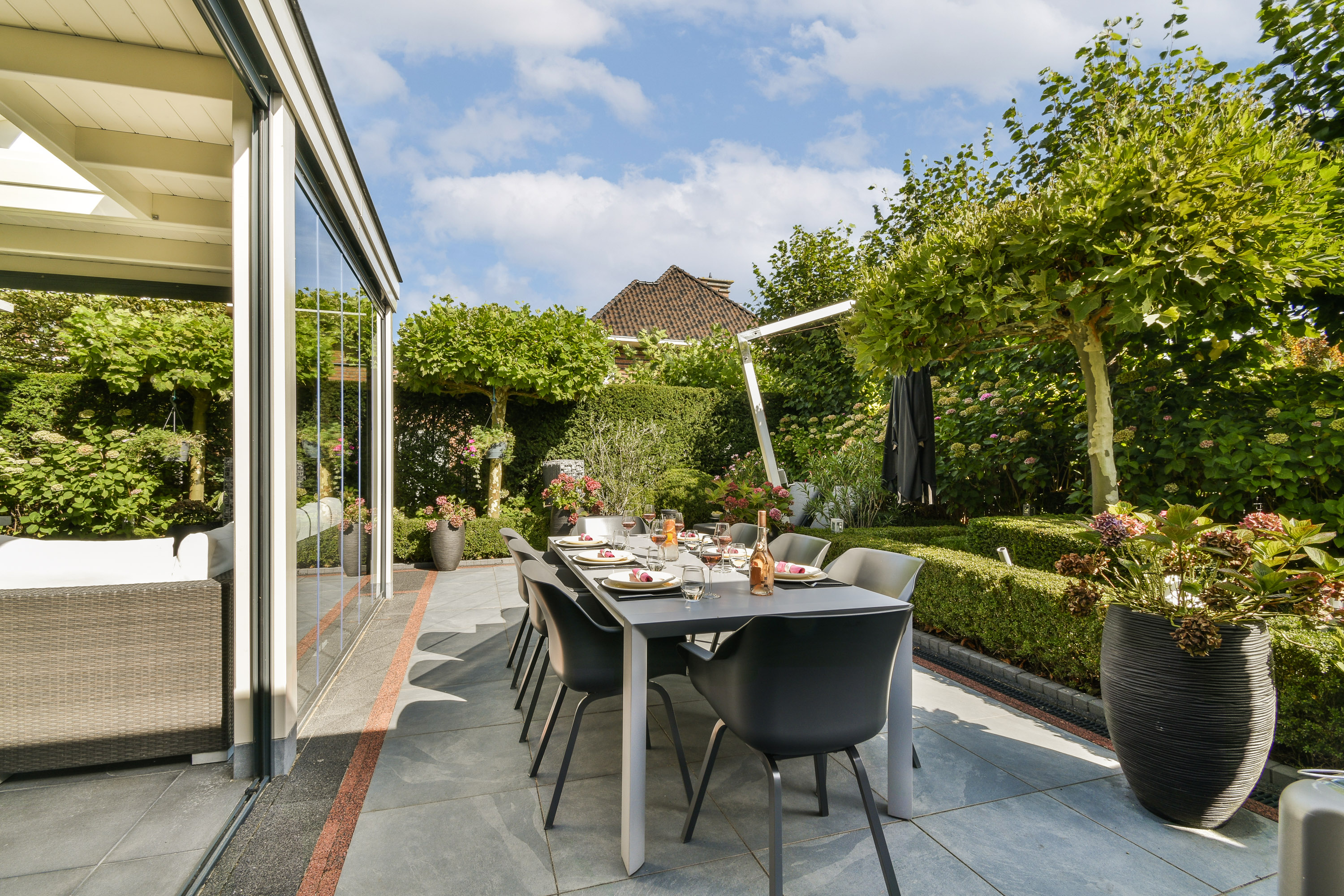 De tuin is rondom en opvallend fraai en verzorgd. Het begint al met de bestrate oprit met carport en de voortuin met planten. De zij- en achtertuin zijn eveneens zeer verzorgd aangelegd met hortensia's, planten, struiken en hagen, maar ook terrassen, electra en verlichting. Als kers op de taart is er een heerlijke en royale serre aangebouwd aan de woonkamer met een glazen (te openen) wand, electra en een dak met lichtstraat.