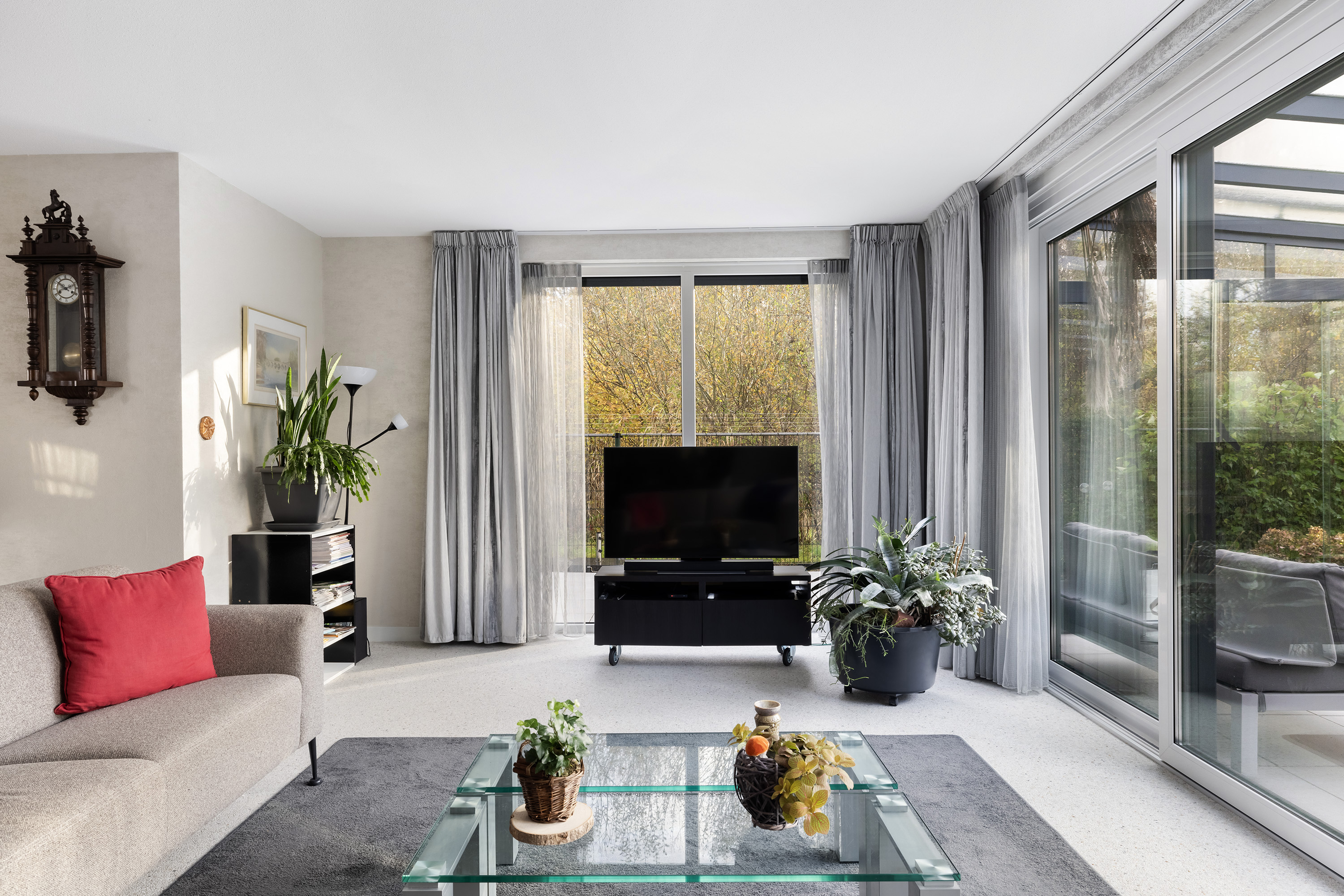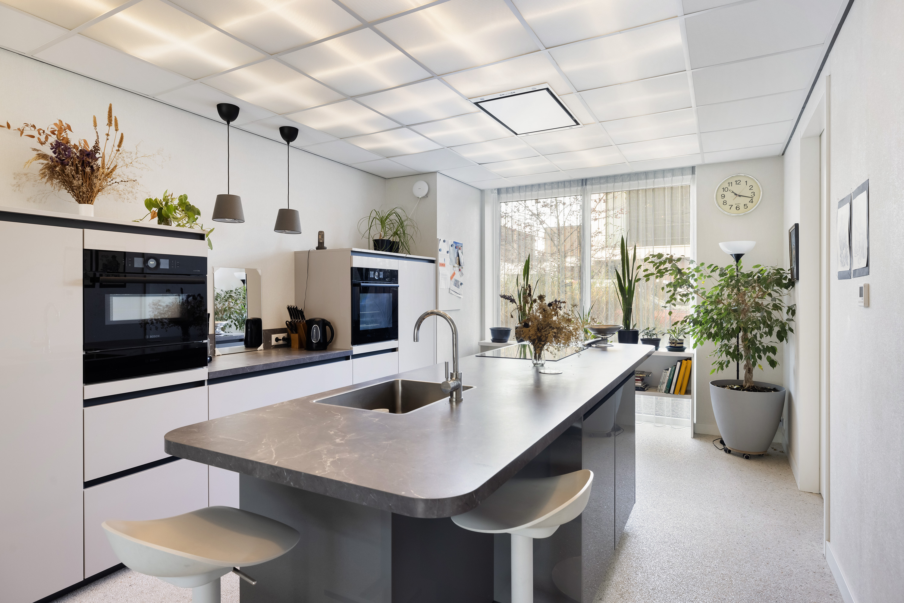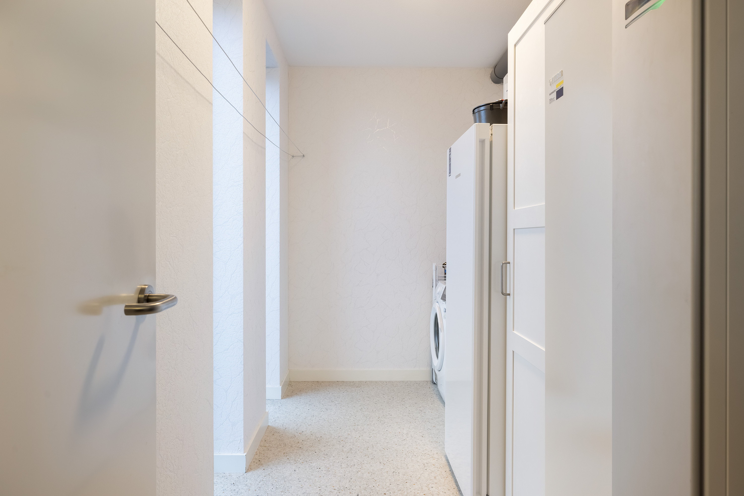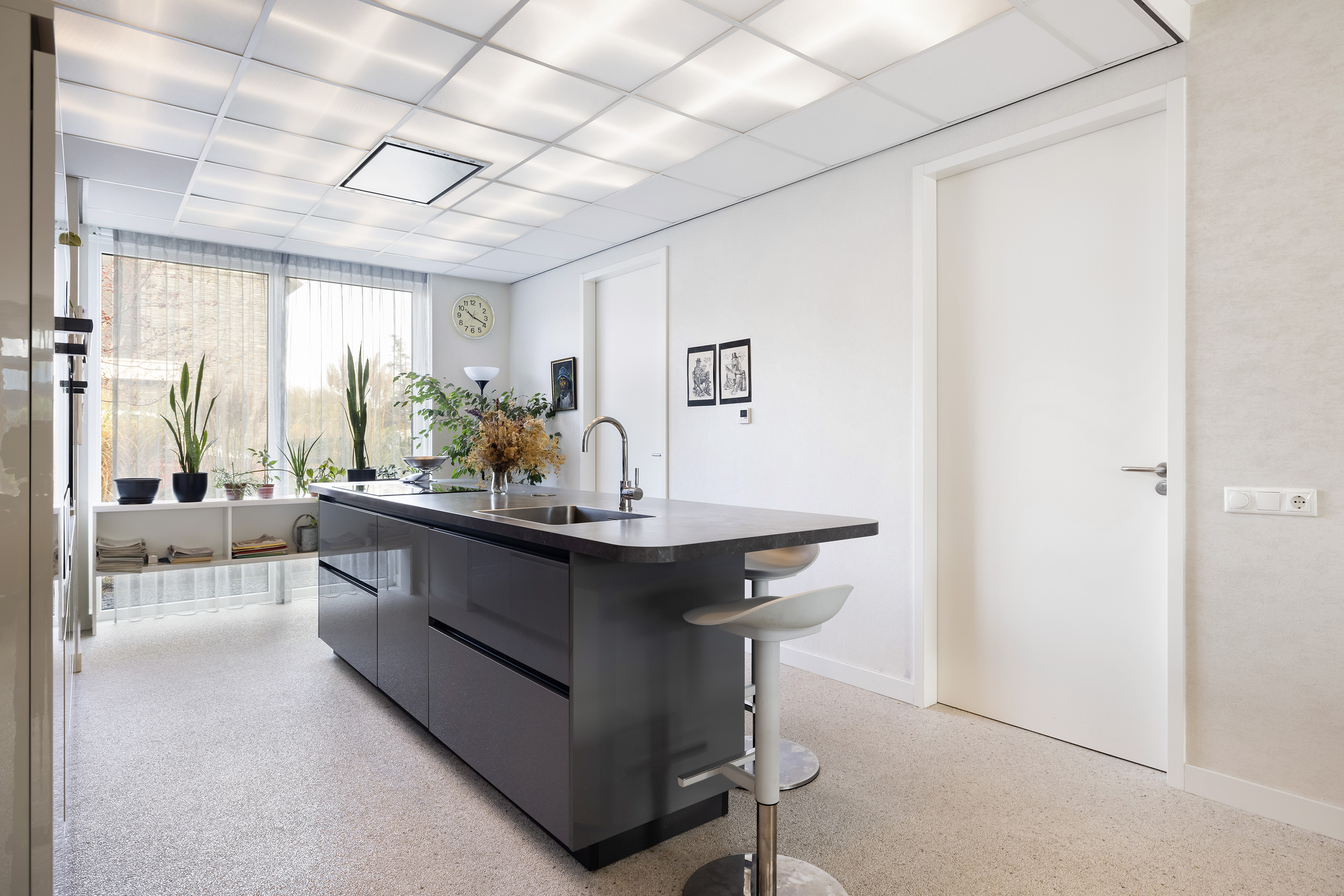 The ground floor is anchored by a spacious living room of 45 m², its large windows welcoming natural light and garden views. The open kitchen is fitted with high-end appliances and a central island, while adjacent spaces include a utility room and a guest bedroom with direct garden access. A Carrara Italian marble-gravel floor adds subtle texture to the main living area, seamlessly leading out to a fully enclosed conservatory—a year-round connection to the outdoors.
