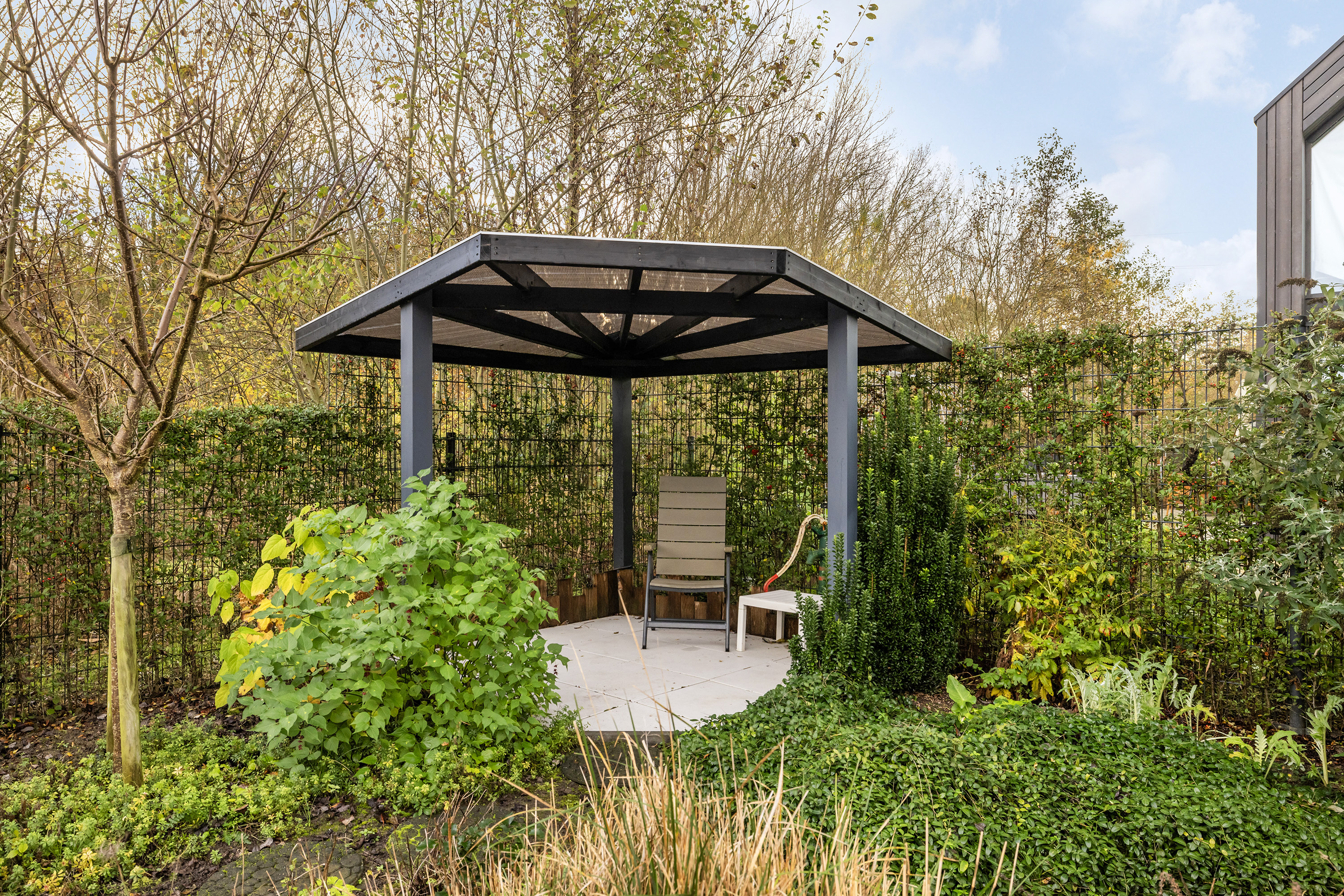 Upstairs, three capacious bedrooms and a second bathroom balance privacy with family functionality. Every detail supports residential ease, from insect-screened windows and integrated sunscreens to the garage with a high clearance, ideal for versatile storage or a home office. The rear south-facing garden spans approximately 145 m², landscaped for seclusion and outdoor living, with terraces, rainwater collection, and a pavilion inviting quiet retreat.