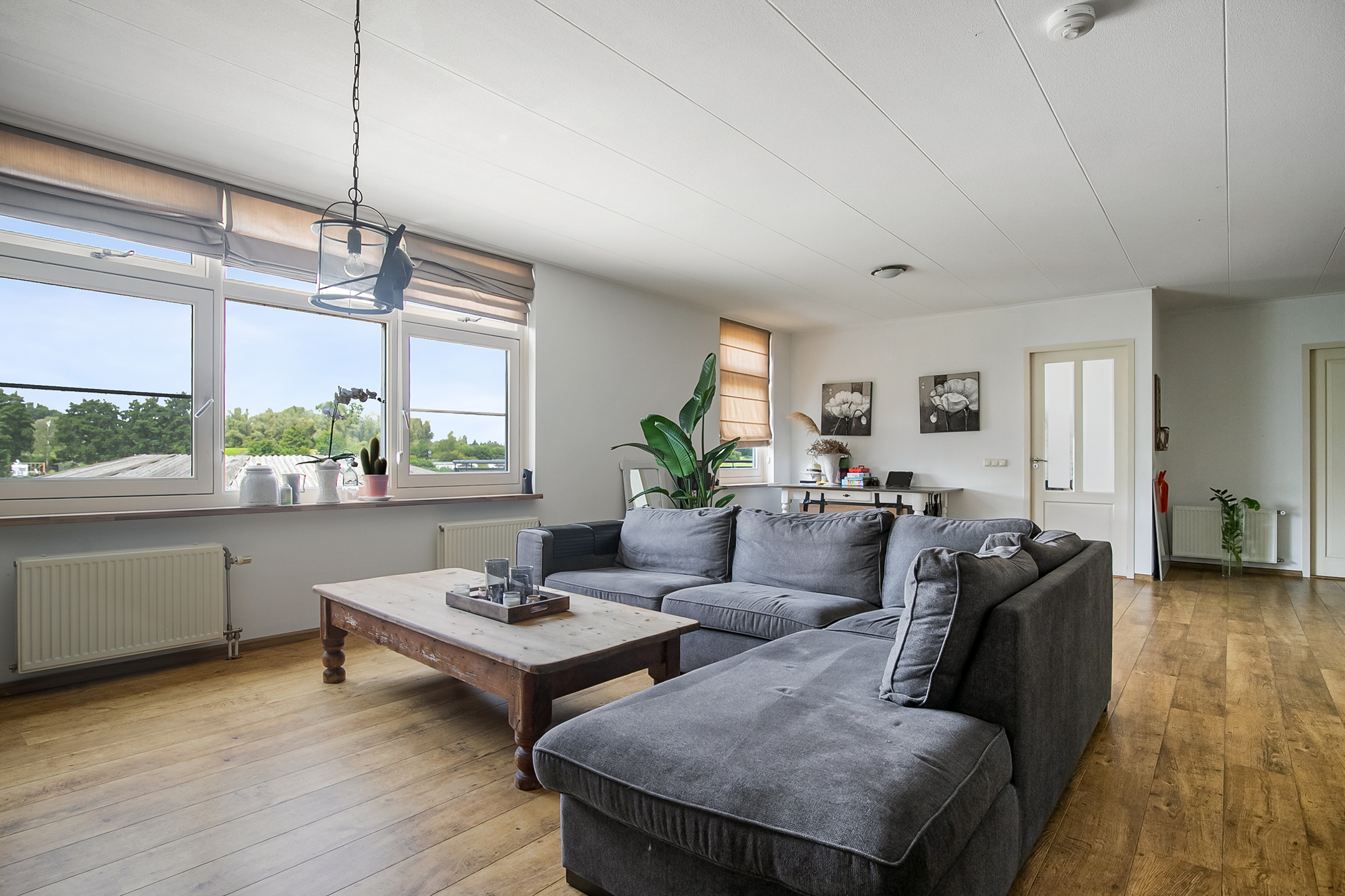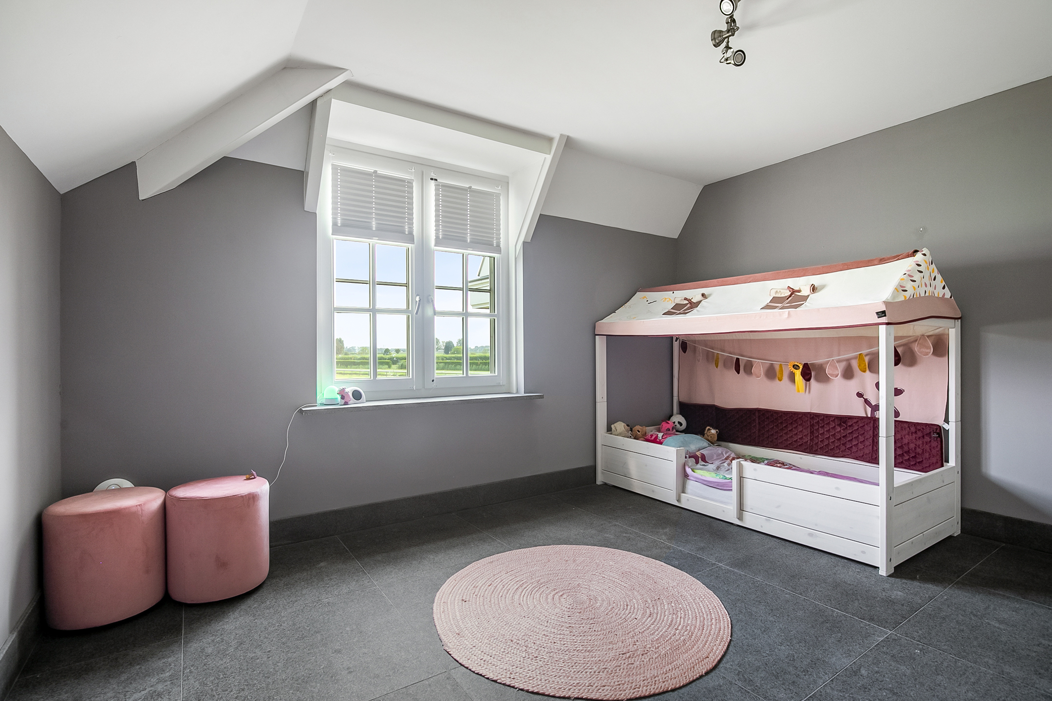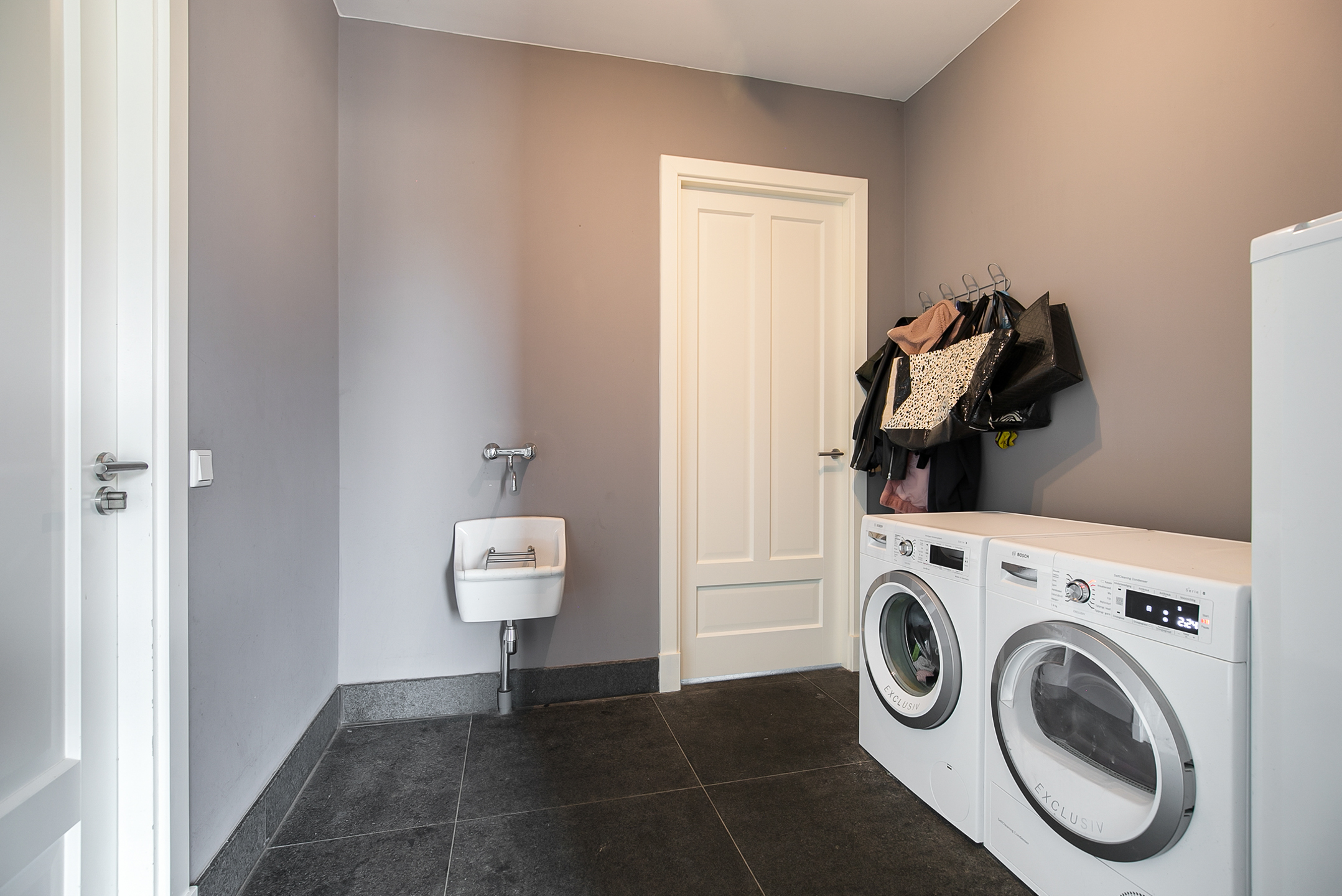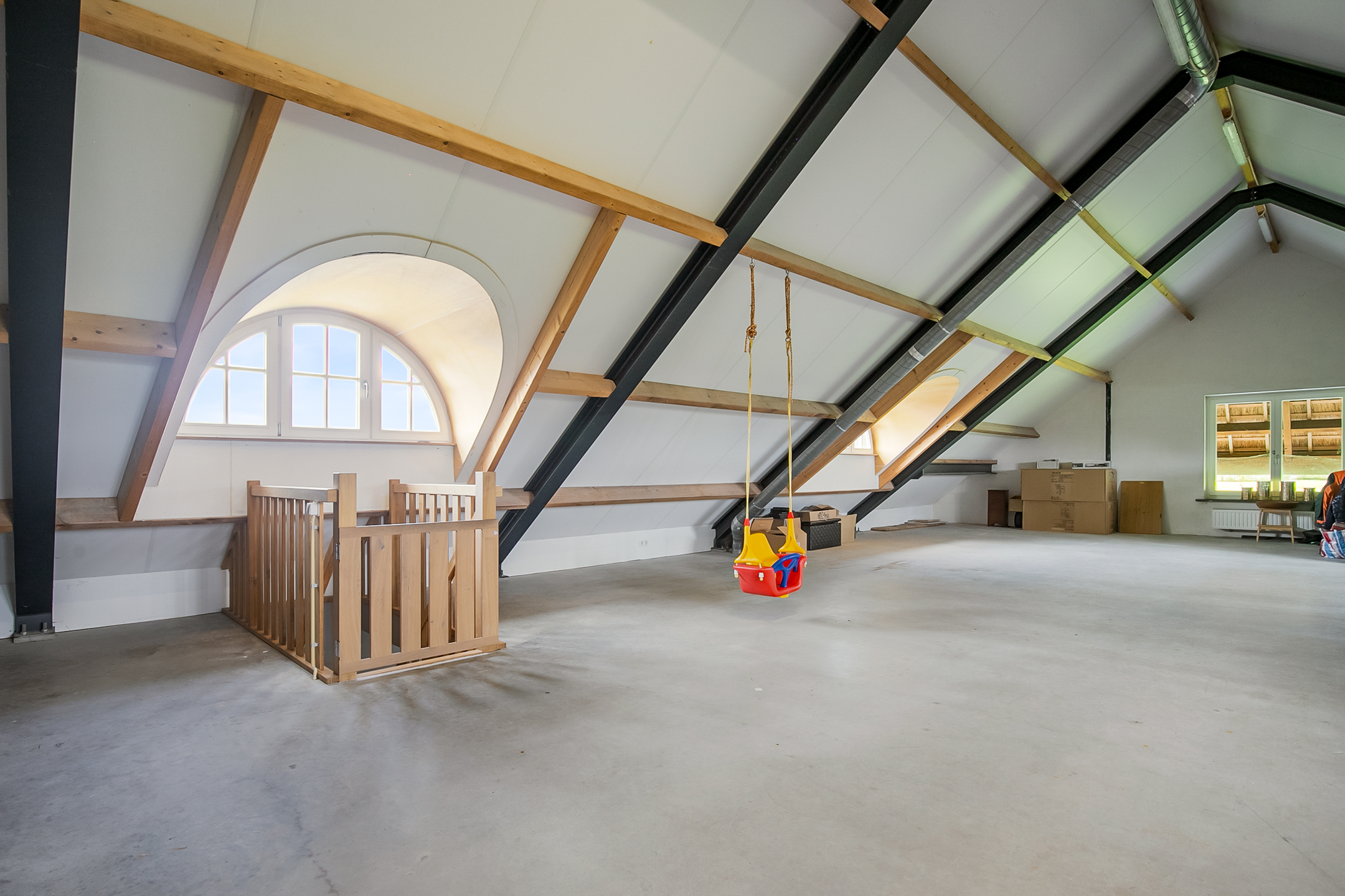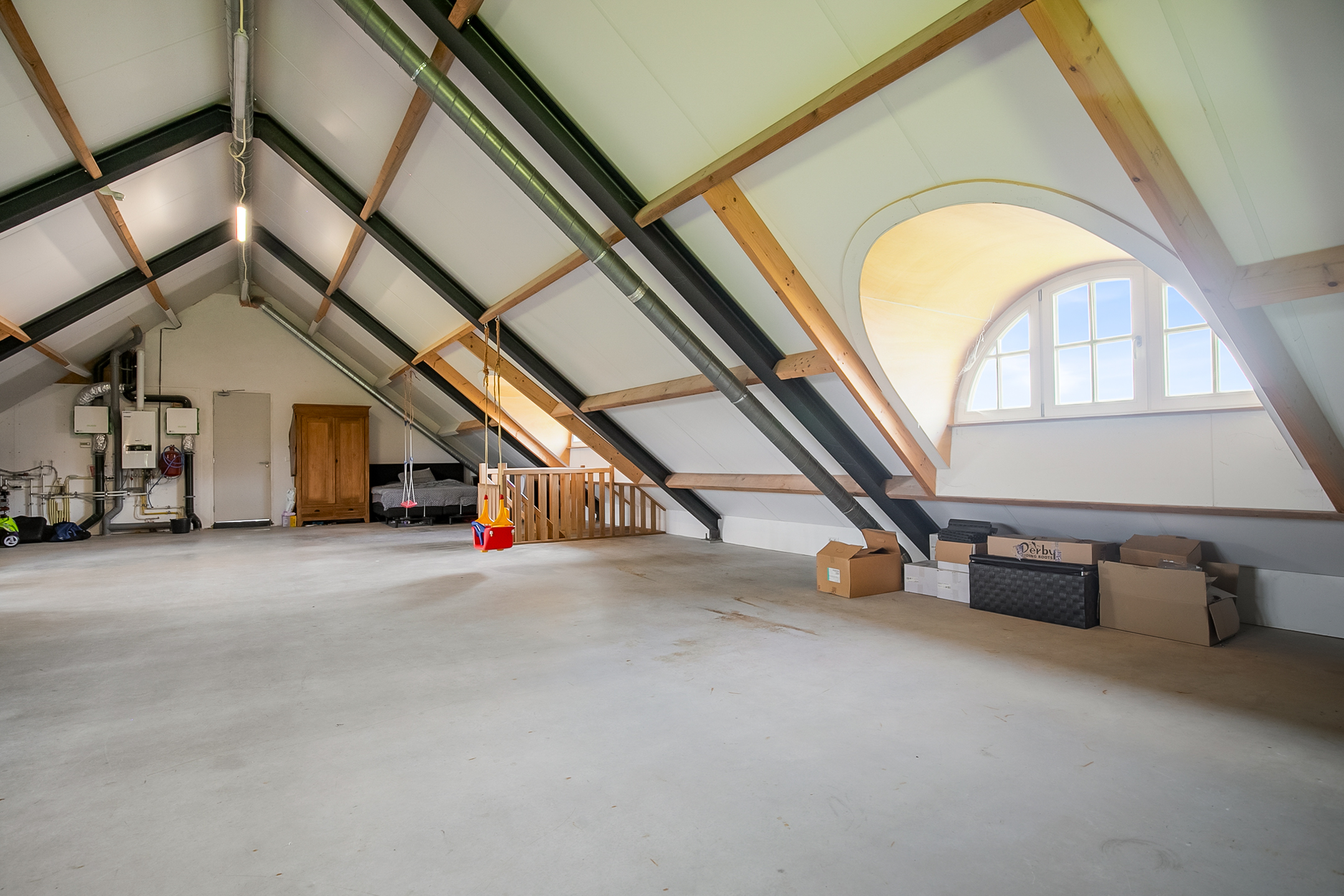 The very generous attic space is currently mainly used as storage, but can of course also be used and furnished for various other purposes. 4 beautiful semi-circular dormer windows provide natural light and ventilation. This room houses the set-up for the central heating combi boiler (Nefit), the mechanical ventilation unit and the underfloor heating unit. A fixed staircase provides access to the rear hallway.