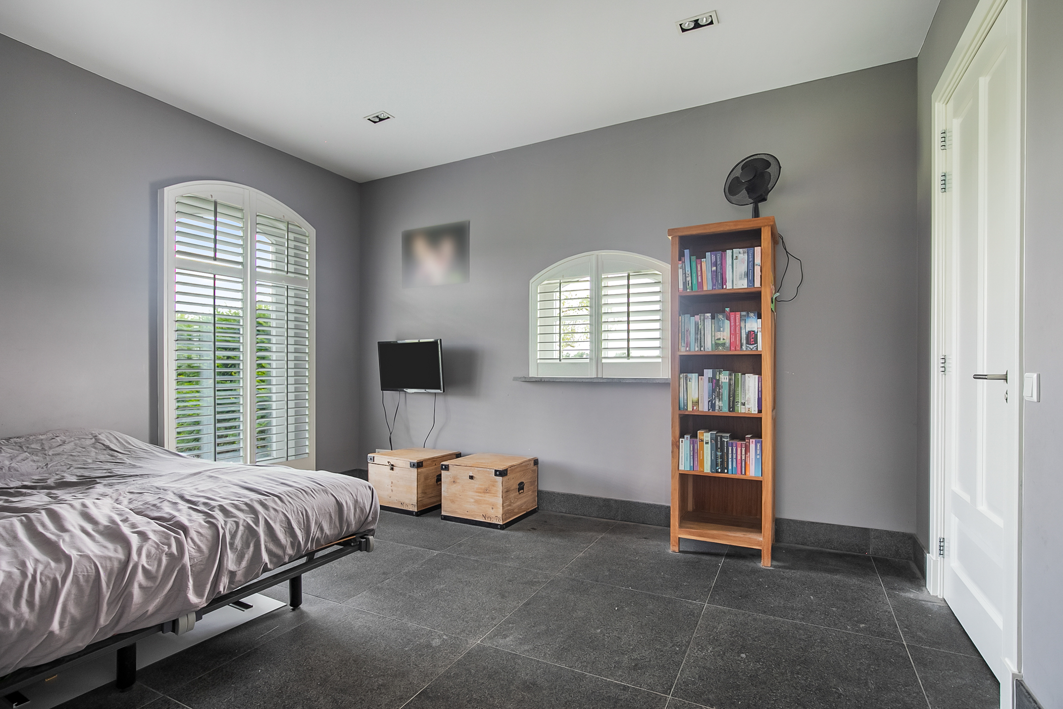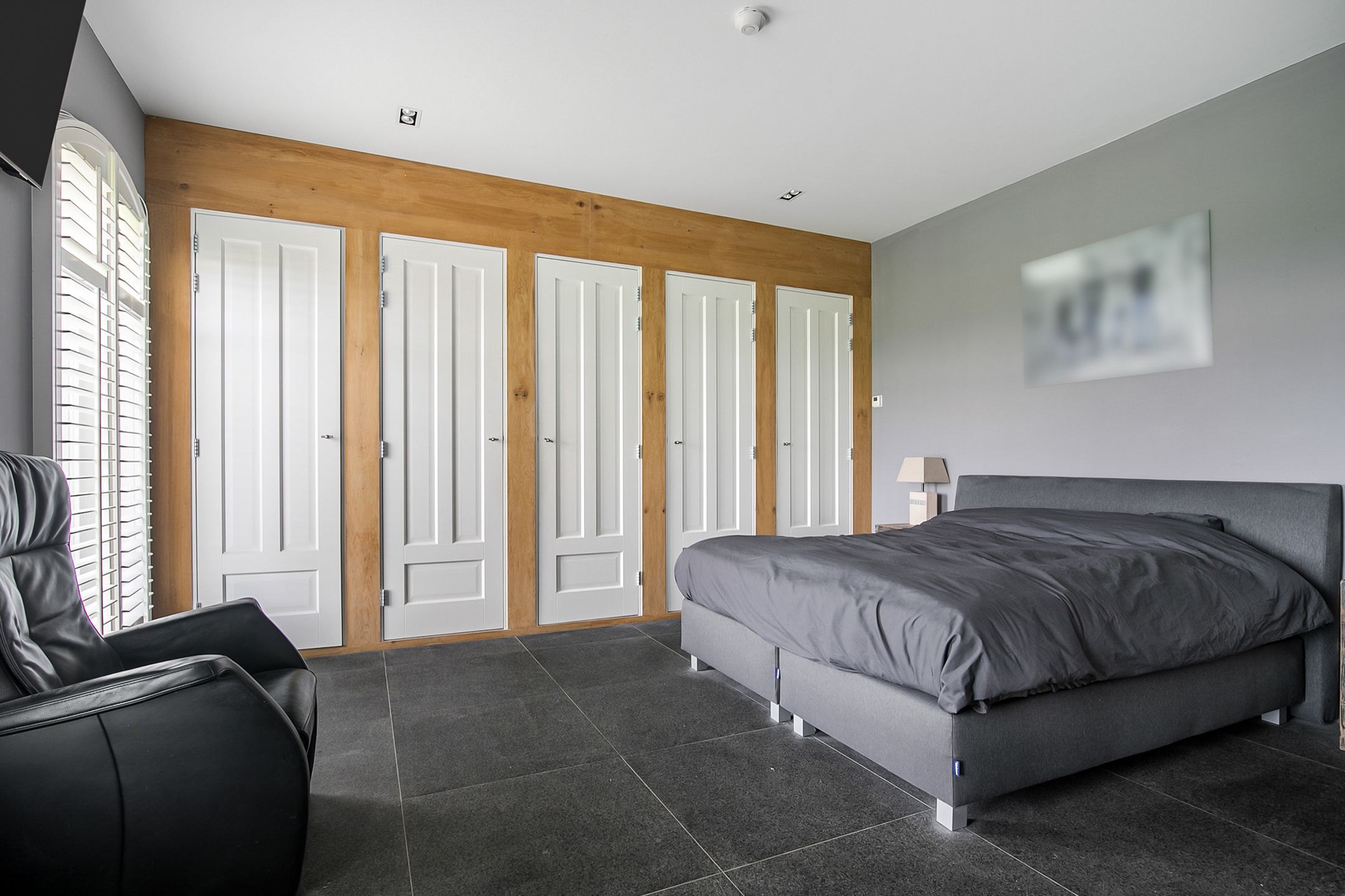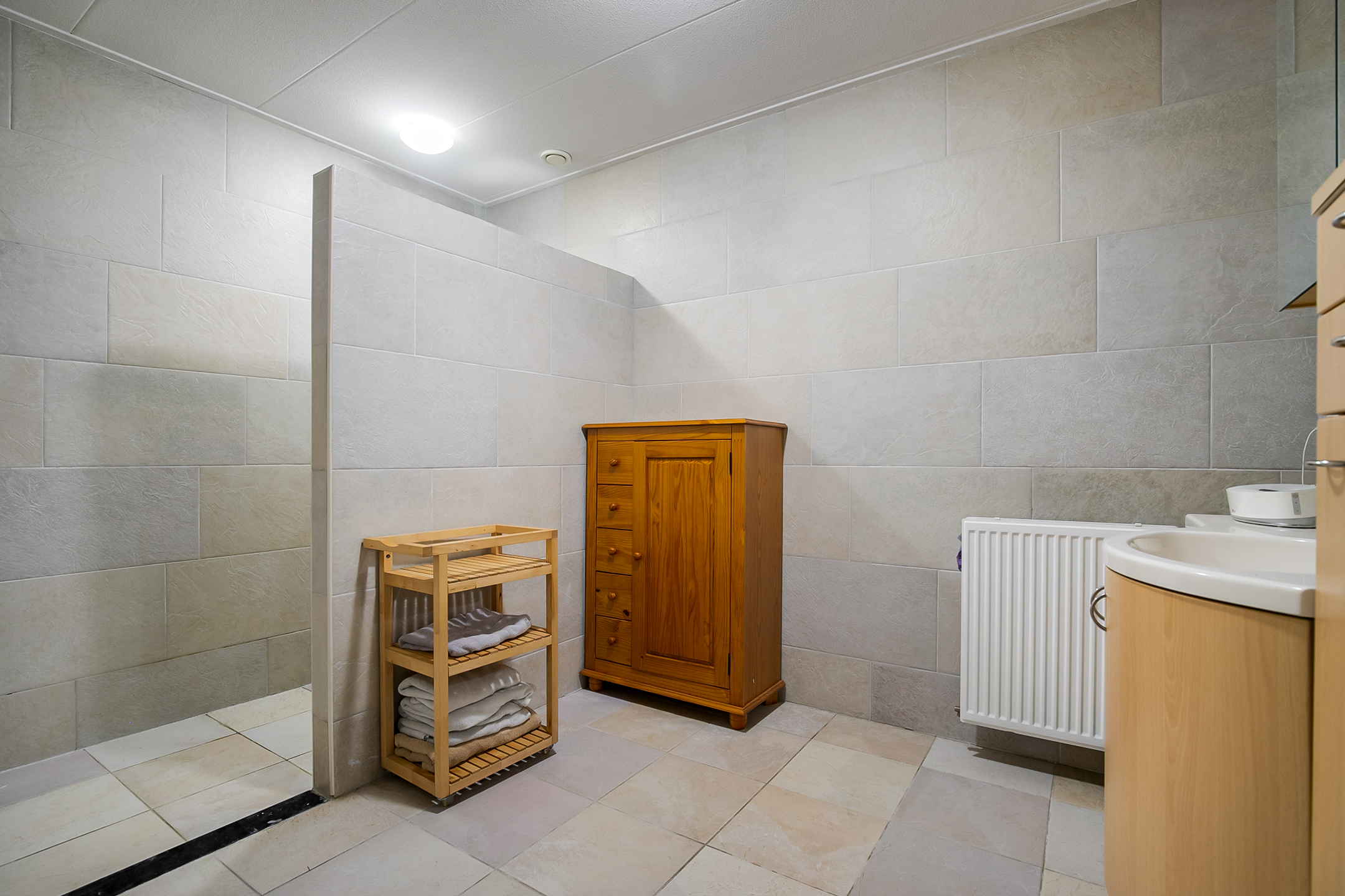 From the living room, you can access the guest bedroom. This bedroom has a natural stone floor, stucco walls and a stucco ceiling with recessed lighting. From this room, there is access to the bathroom. This bathroom is finished with the same natural stone floor as in the rest of the rooms. The walls and ceiling have stucco. The bathroom is further equipped with a spacious walk-in shower with sun shower, two washbasins with cabinet, a floating toilet and a design radiator. A window provides natural light. From the bathroom, you walk further to the master bedroom.