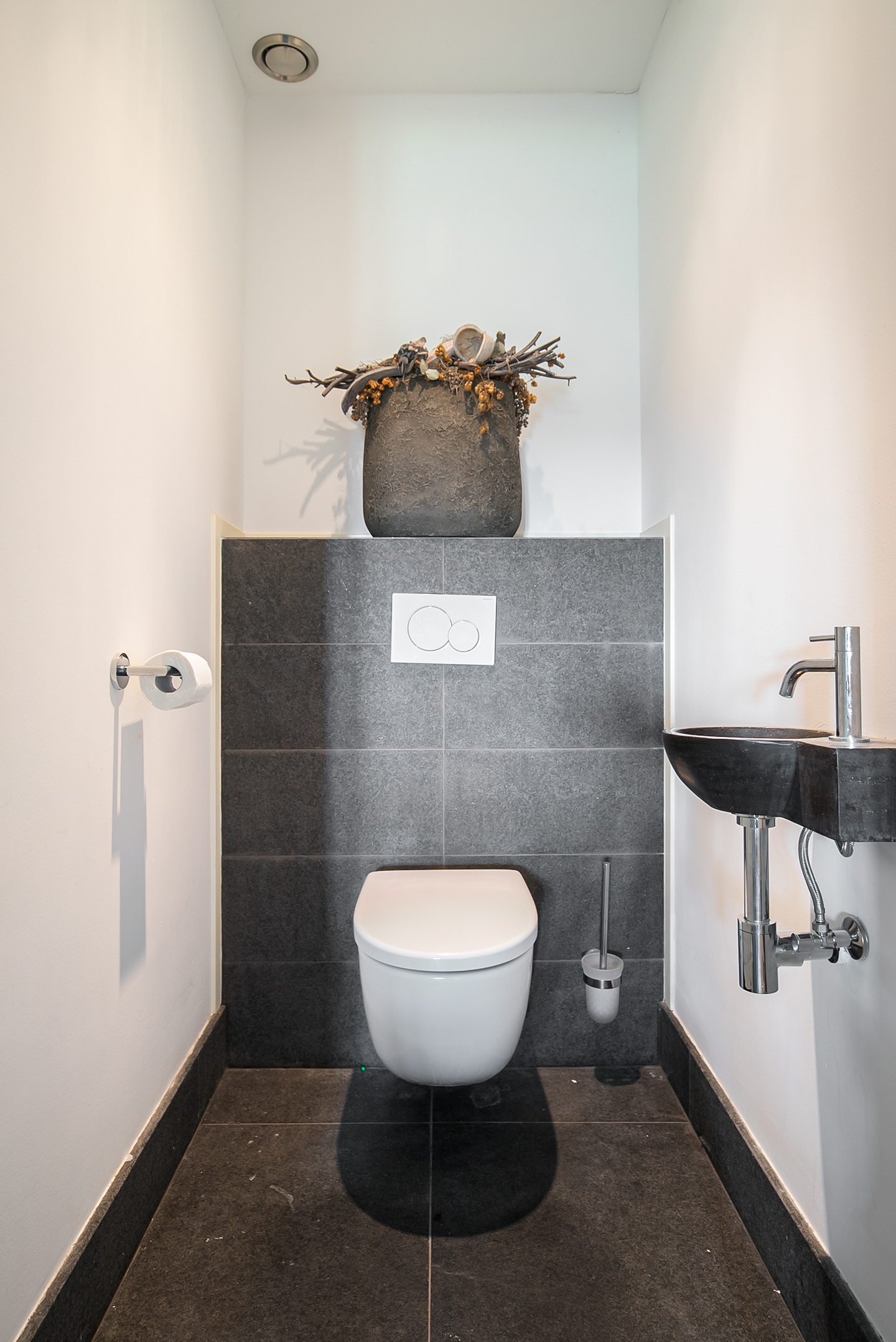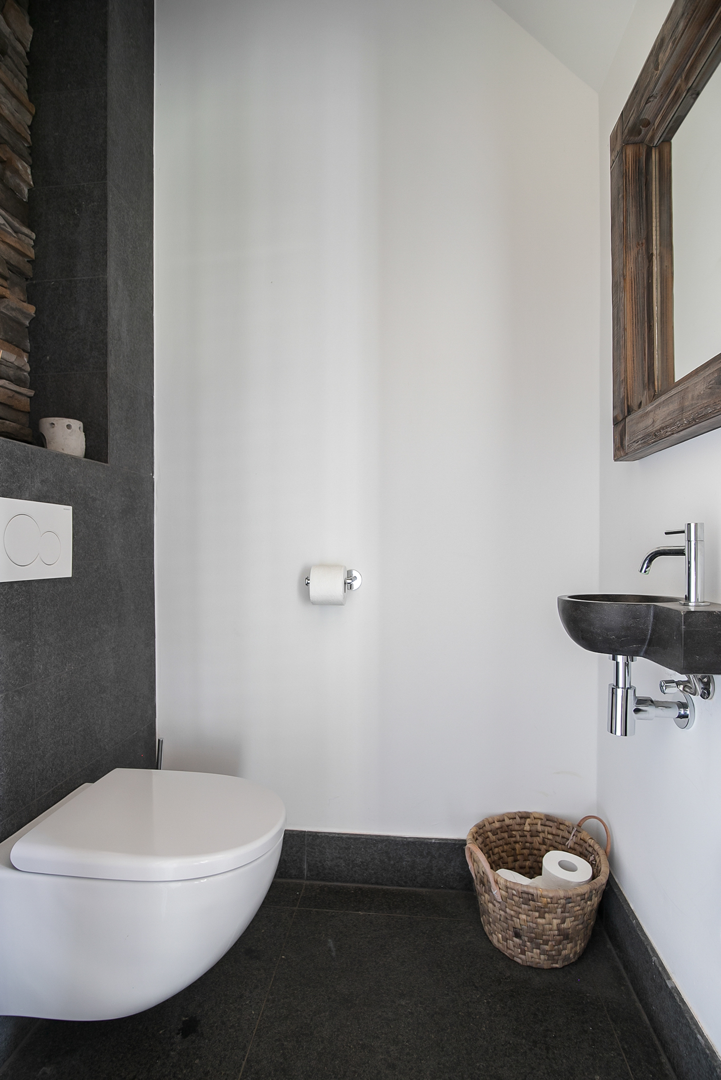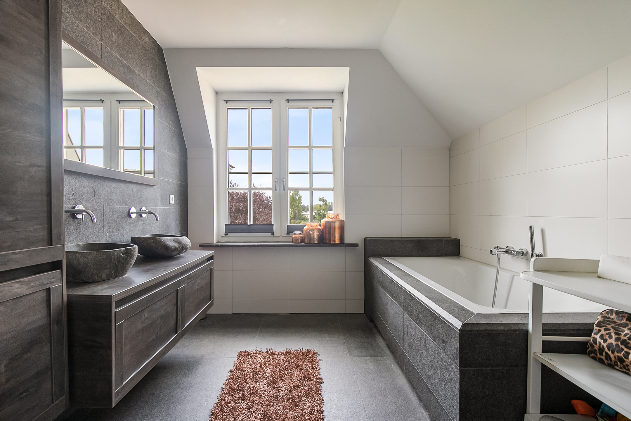 From the living room, you can access the guest bedroom. This bedroom has a natural stone floor, stucco walls and a stucco ceiling with recessed lighting. From this room, there is access to the bathroom. This bathroom is finished with the same natural stone floor as in the rest of the rooms. The walls and ceiling have stucco. The bathroom is further equipped with a spacious walk-in shower with sun shower, two washbasins with cabinet, a floating toilet and a design radiator. A window provides natural light. From the bathroom, you walk further to the master bedroom.