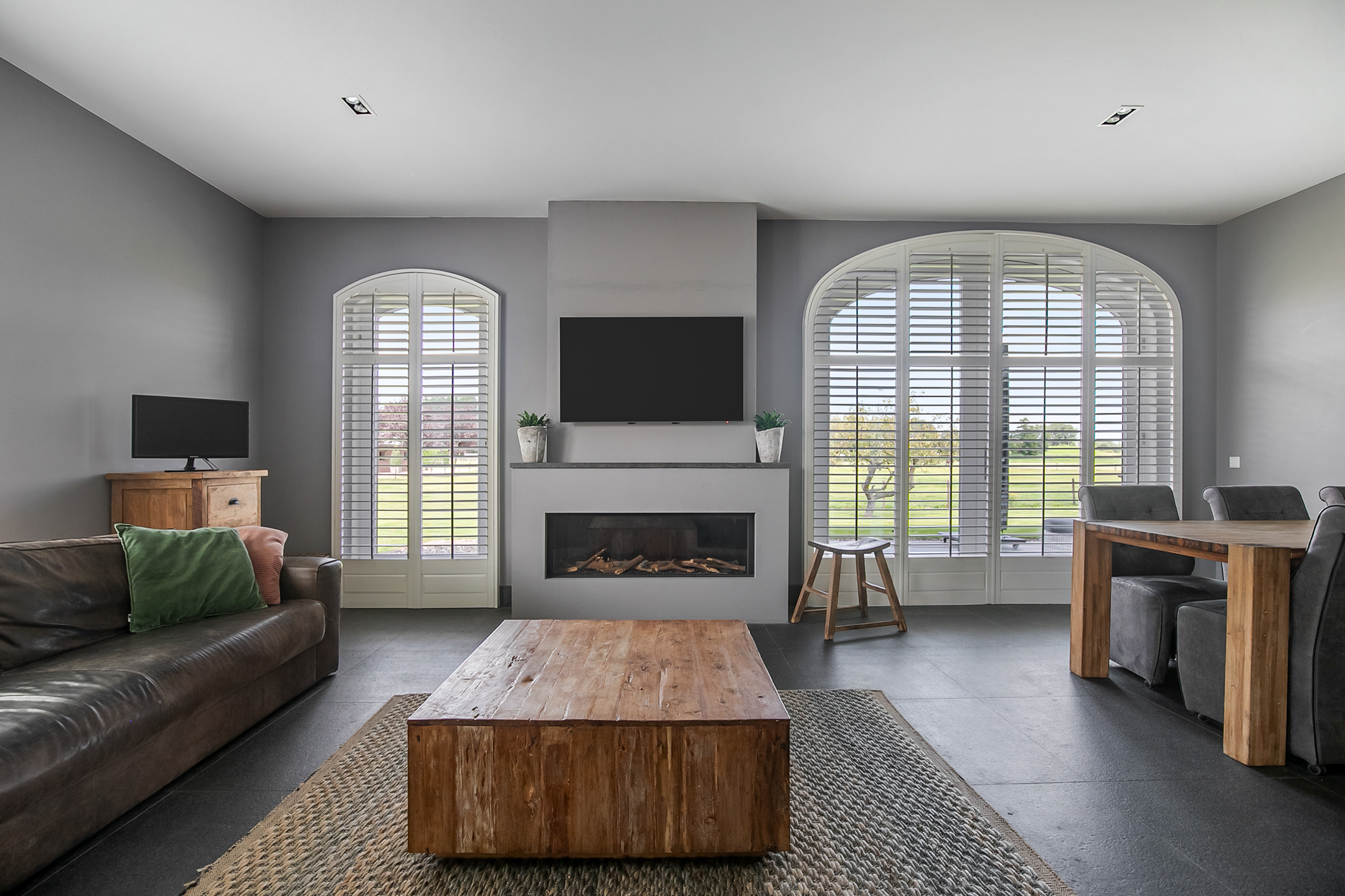 The hall provides access to the living room, utility room, toilet room and the fixed staircase access to the attic space on the 1st floor. The underfloor heating unit is located in the stairs cupboard. The toilet room is partly tiled and further equipped with a floating toilet and a hand basin. The practical utility room is equipped with a bespoke kitchen unit. The connections for the washing equipment are located here. There is also access to the meter cupboard from here. A wicket door provides access from the utility room to the pantry/laundry room of the front house. The cosy living room with open kitchen features a natural stone floor, stucco walls and a stucco ceiling with recessed lighting. Three double French doors and a large window with beautiful and practical shutters provide plenty of natural light. A beautiful fireplace with gas fire adds atmosphere and warmth to the room. The kitchen features a wall-mounted unit with appliance wall and a cooking and rinsing island. The appliance wall is further equipped with a combination oven, coffee maker, fridge and freezer. The island features a 4-burner gas hob with wok burner and built-in extractor fan in the ceiling, a sink and a dishwasher. Various cupboards and drawers provide plenty of storage space. From the living room, there is access to the guest bedroom. This bedroom has a natural stone floor, stucco walls and a stucco ceiling with recessed lighting. From this room, there is access to the bathroom. This bathroom is finished with the same natural stone floor as in the rest of the rooms. The walls and ceiling have stucco. The bathroom is further equipped with a spacious walk-in shower with sun shower, two washbasins with cabinet, a floating toilet and a design radiator. A window provides natural light. From the bathroom, you walk further to the master bedroom. This master bedroom is equipped with a practical closet, providing plenty of storage space. A window also provides natural light.